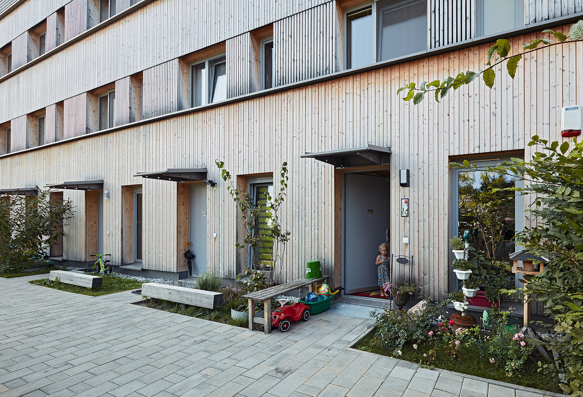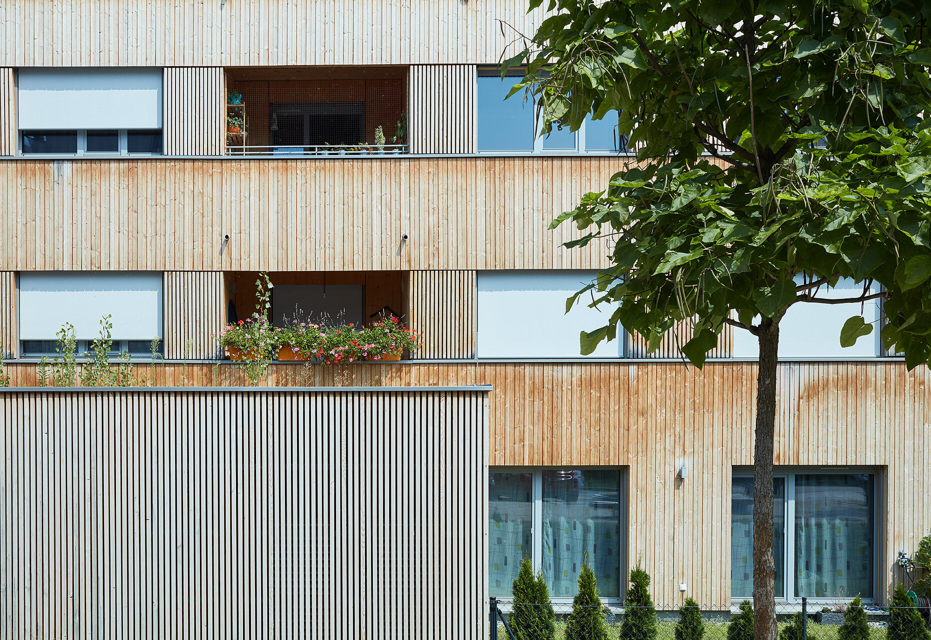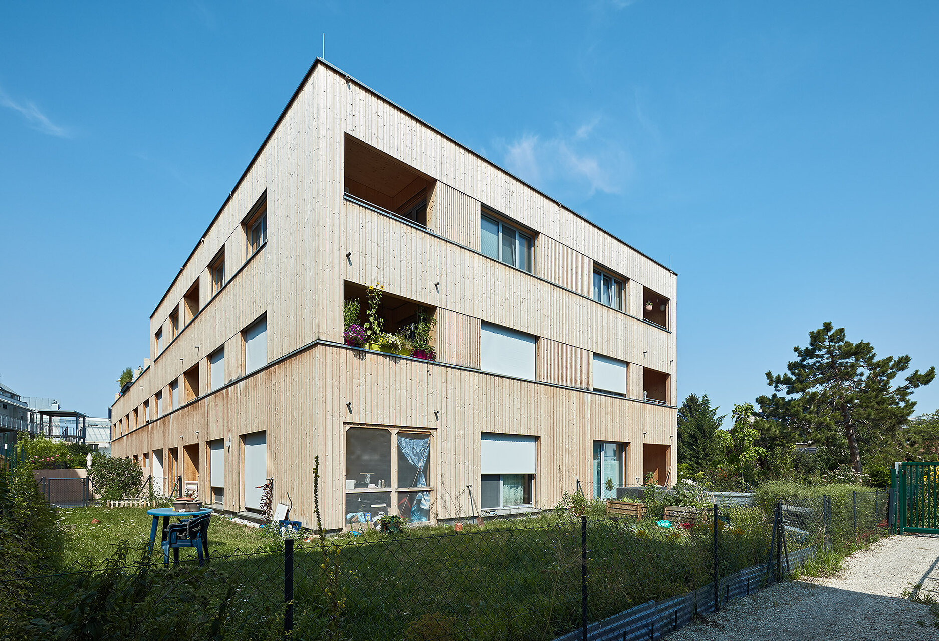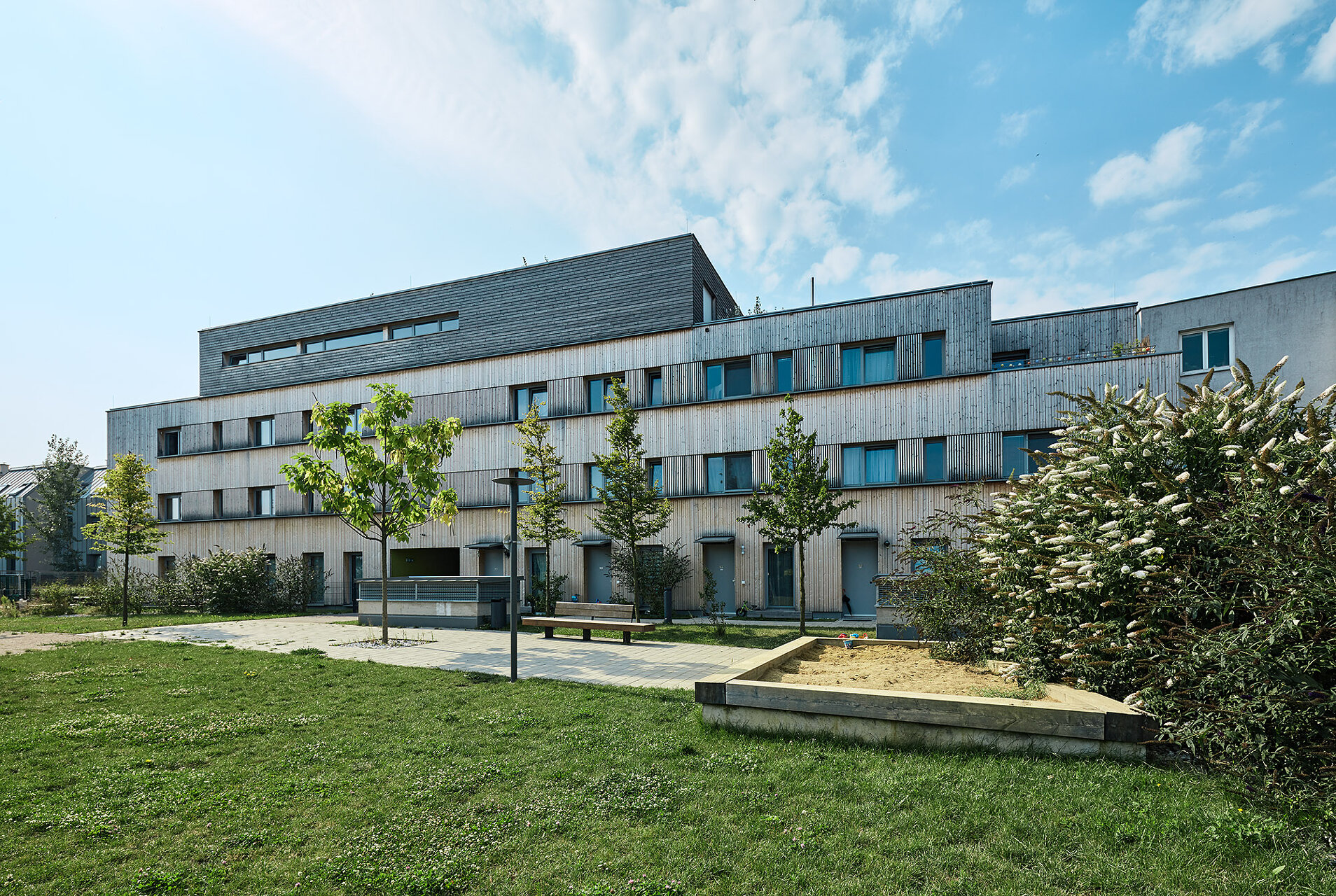 Diese Wohnanlage setzt ein wichtiges Signal: Nach längerer Pause hat eine gemeinnützige Wohnbaugenossenschaft in Wien erstmals wieder eine größere Wohnanlage in Holzbauweise errichtet, was im Rahmen des straffen Kostenrahmens eindrucksvoll gelang. Der dreigeschossige Wohnbau mit Staffelgeschoss überzeugt durch seine städtebauliche Integrität, sein differenziertes Freiraumangebot und seine holzbautechnische Umsetzung.Die vier Zeilen docken direkt an die Nachbarbebauung an und definieren ein durchlässiges Wohnquartier. Ein quer zu den Zeilen verlaufender offener Weg dient als Haupterschließung. Bis auf die betonierten Stiegenhäuser sind die Trakte reine Holzbauten aus vorgefertigten vollgedämmten Holzrahmenbauwänden und Brettsperrholzdecken. Im Inneren bleibt der Werkstoff teilweise an den Decken sichtbar, außen ist der Bau vollflächig mit unbehandeltem Lärchenholz verschalt. (Jurytext wienwood 21)