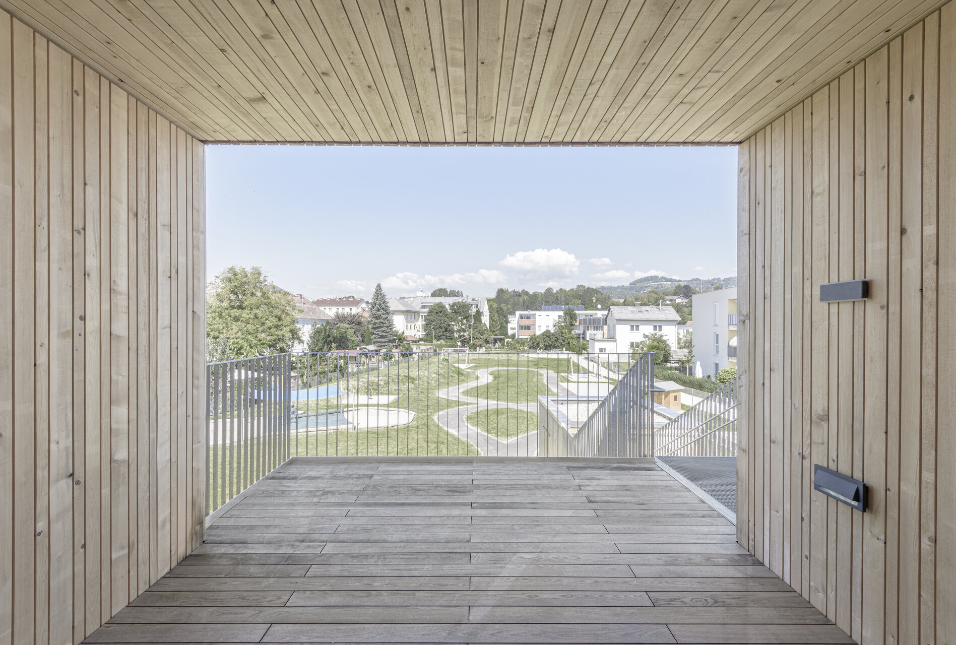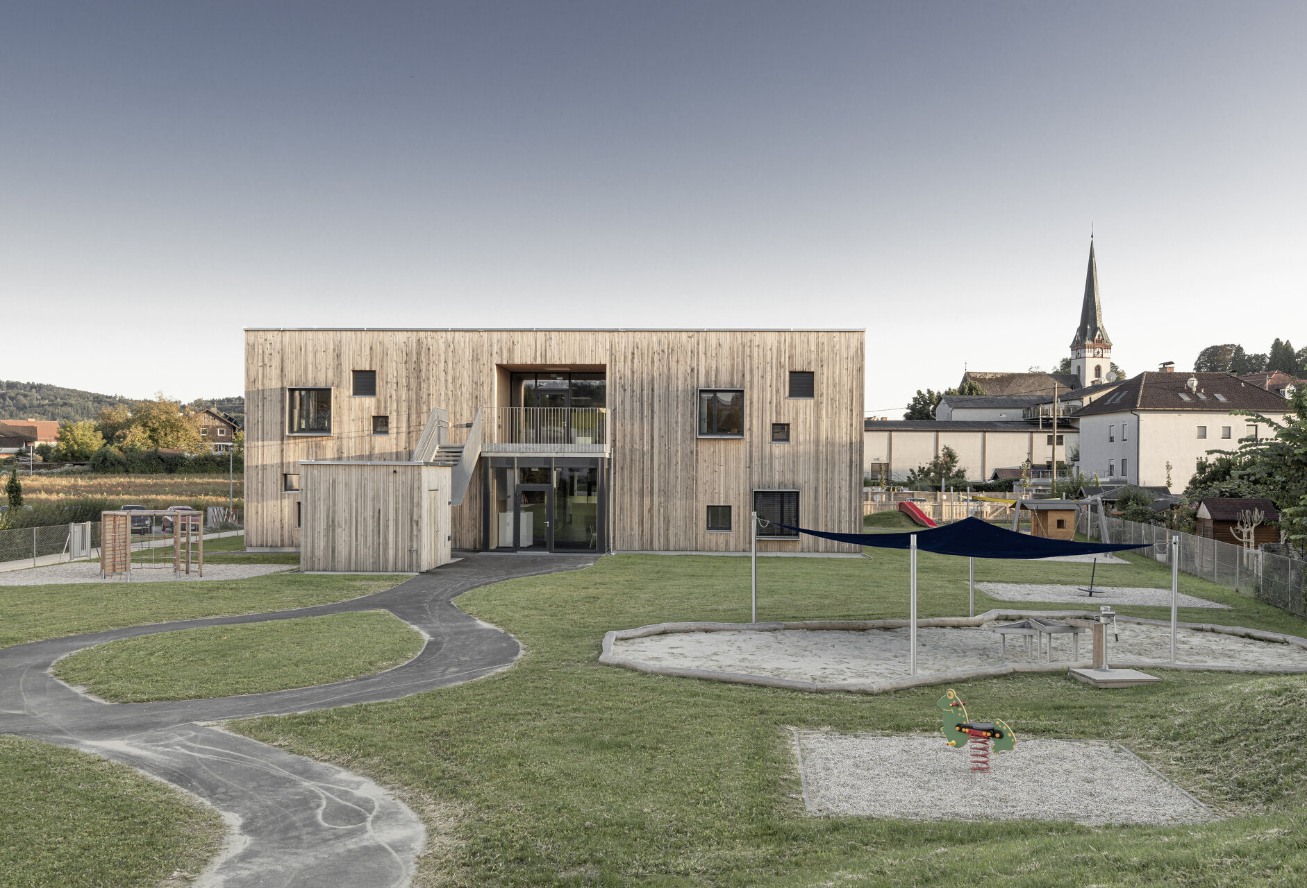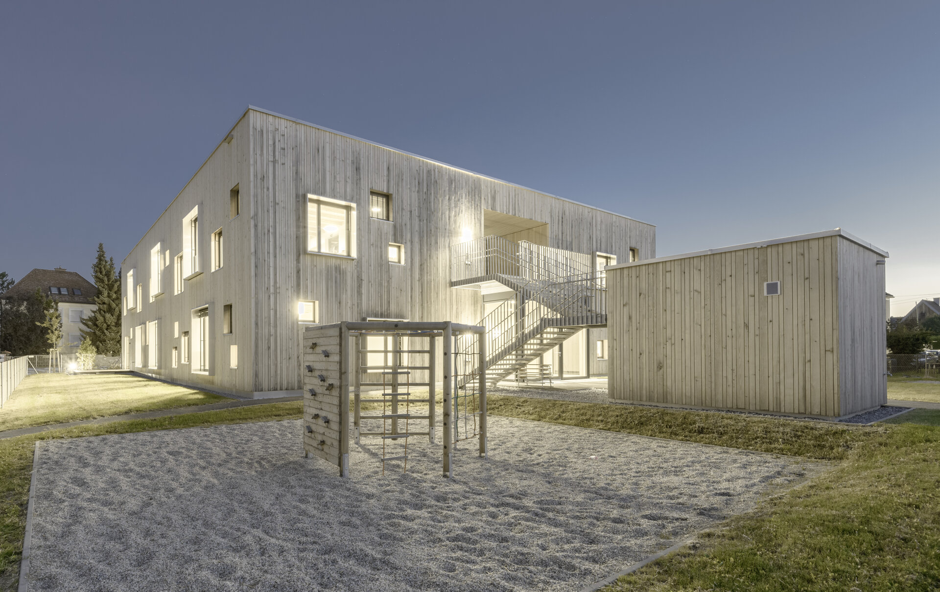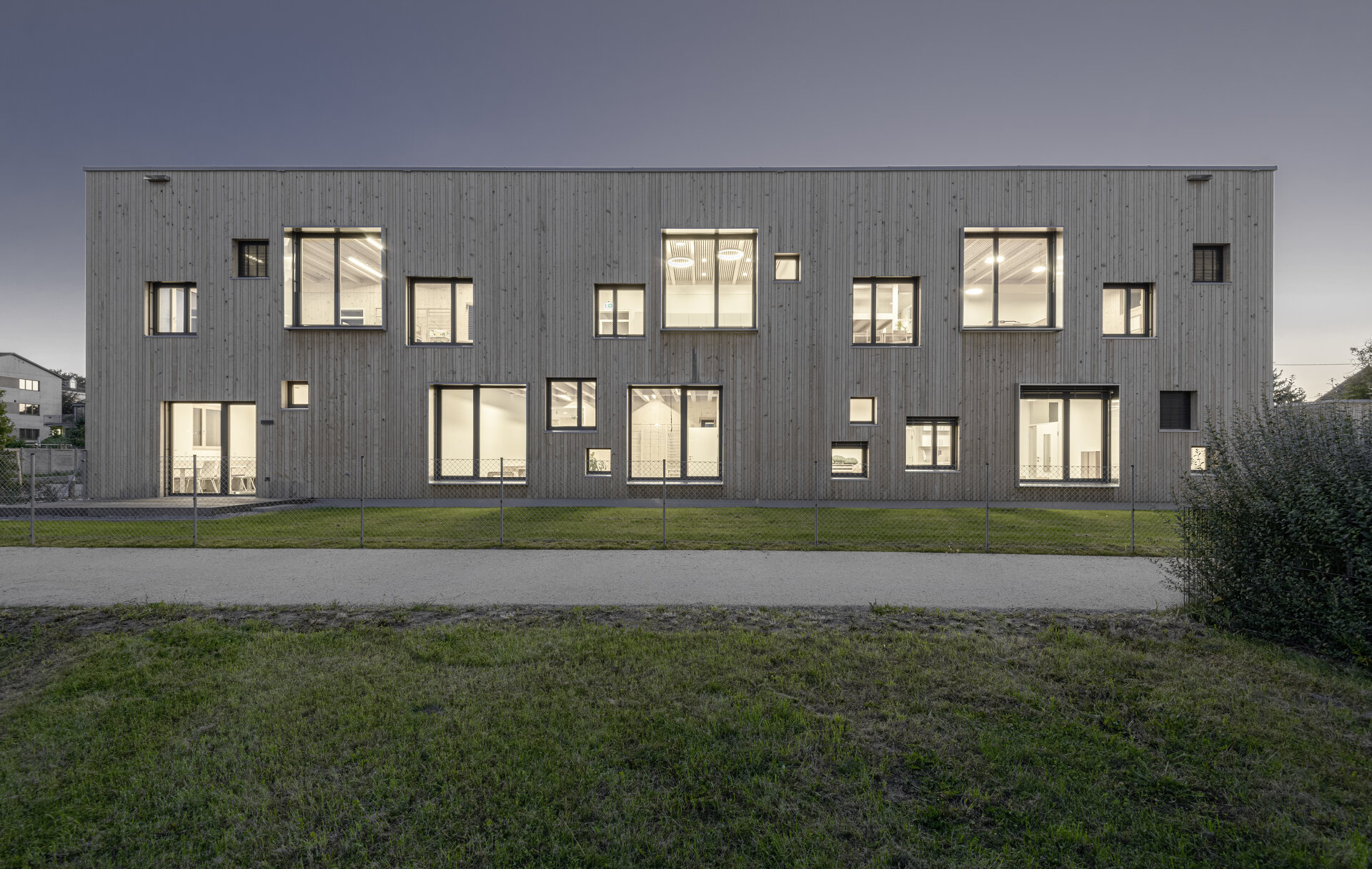 Das Gebäude ist als Holz-Riegelkonstruktion auf einer wärmegedämmten Stahlbeton-Fundamentplatte ausgeführt; dazu Holzbalkendecken mit Zementestrich und Fußbodenheizung, Warmdachaufbau unter Balkendecke und vertikale Fassadenpaneele aus sägerauer Weißtanne. Rechnerisch sind dabei 312 Kubikmeter Holz zum Einsatz gekommen.