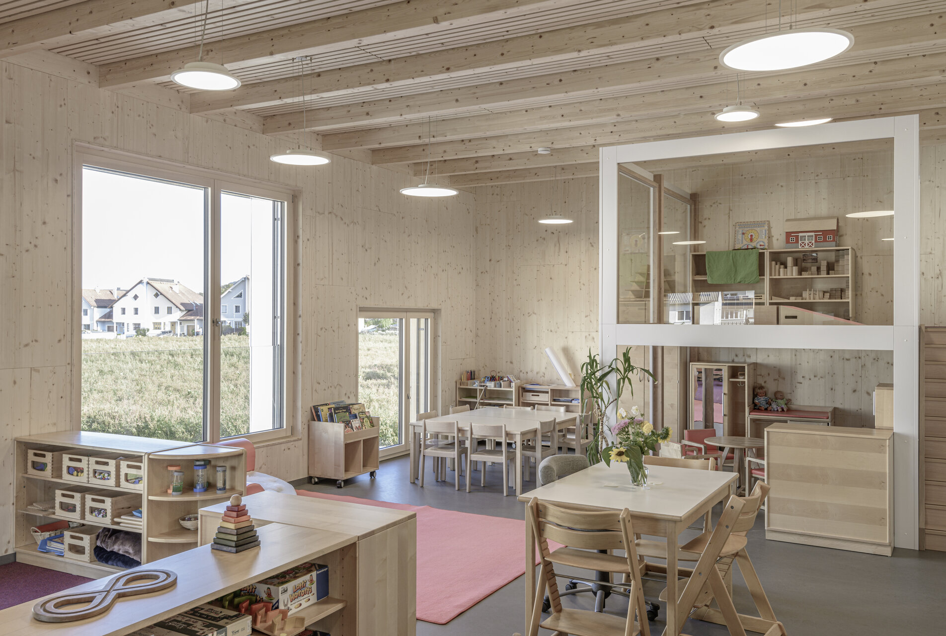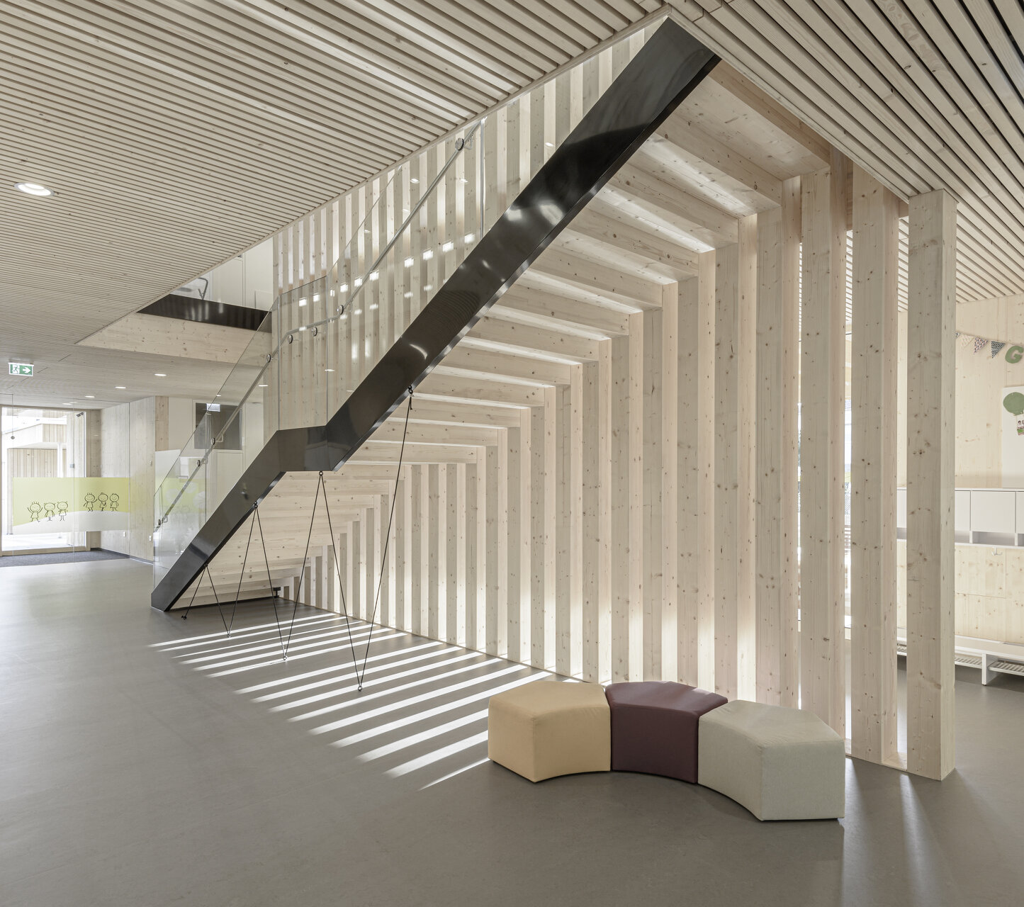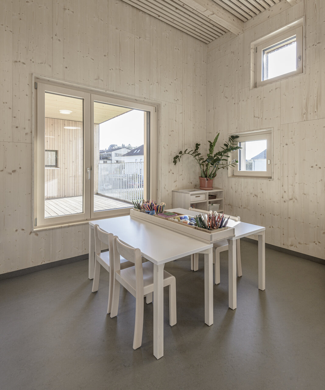 Links und rechts der Halle sind auf zwei Geschossen alle Funktionsbereiche für drei Kindergartengruppen, zwei Krabbelgruppen und eine Wechselgruppe übersichtlich aufgereiht.