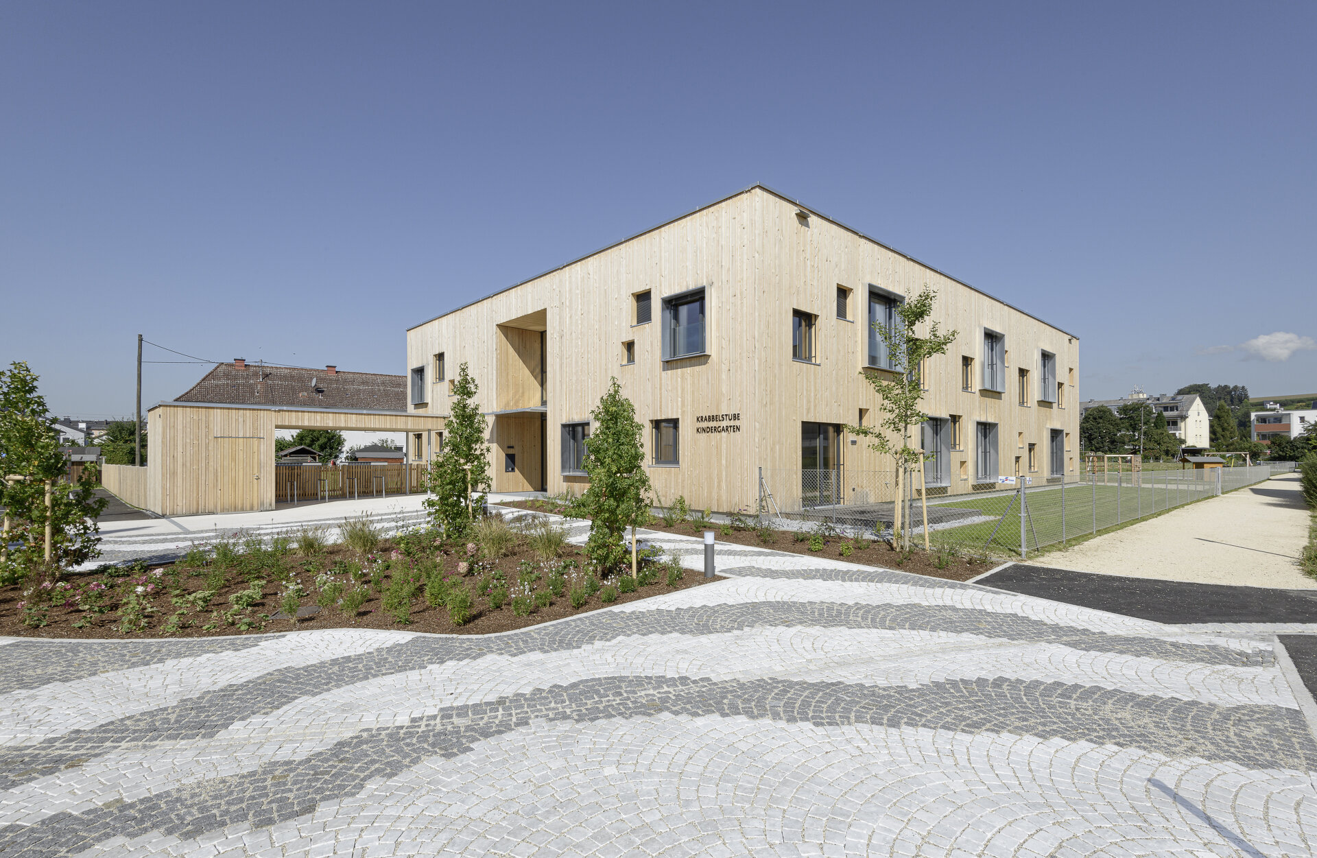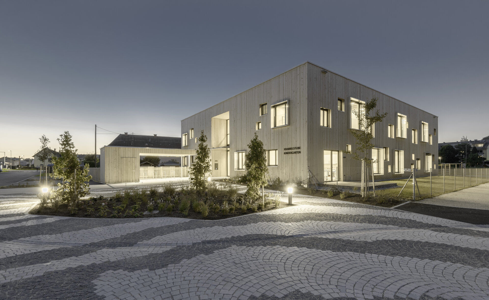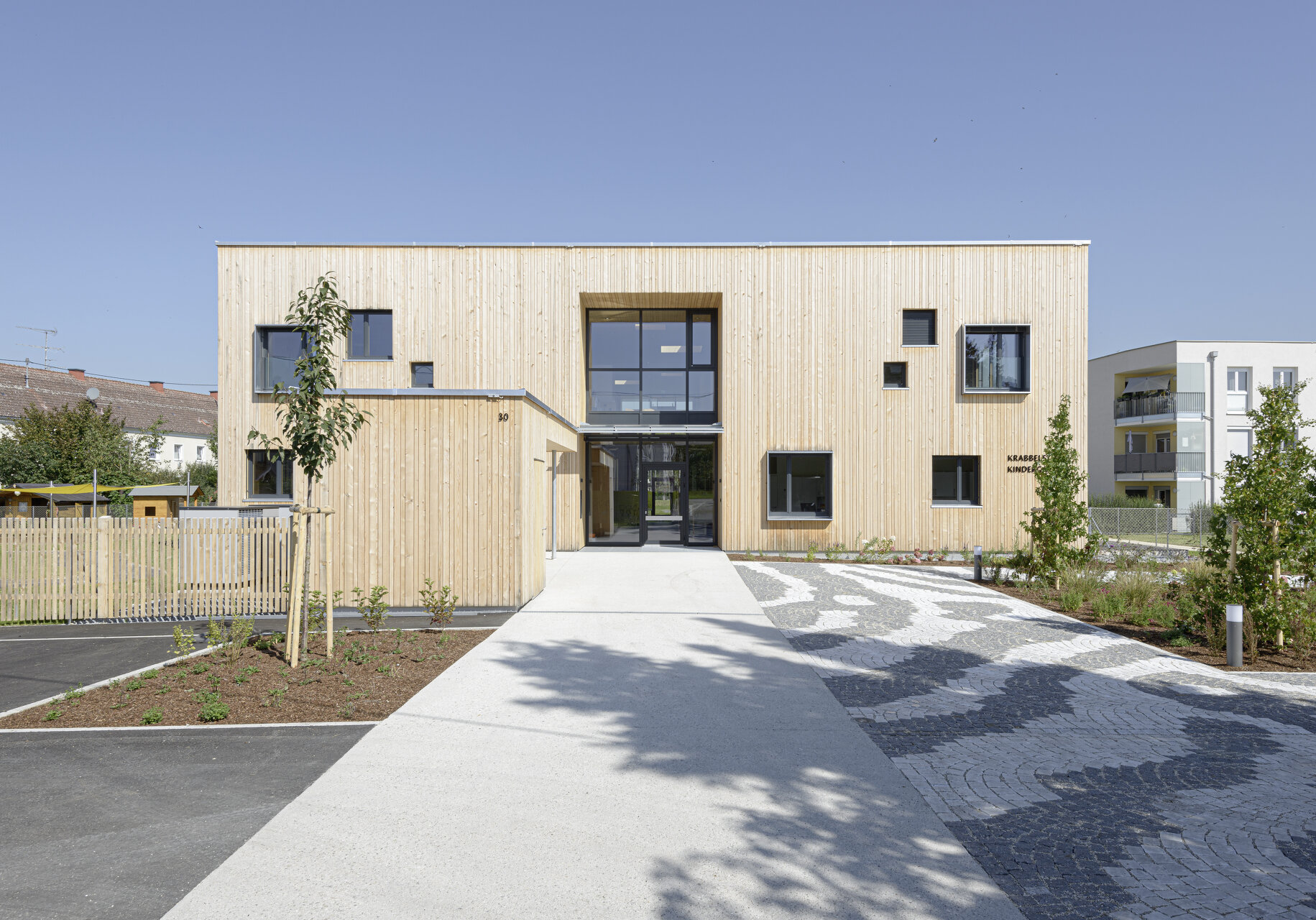 Links und rechts der Halle sind auf zwei Geschossen alle Funktionsbereiche für drei Kindergartengruppen, zwei Krabbelgruppen und eine Wechselgruppe übersichtlich aufgereiht.