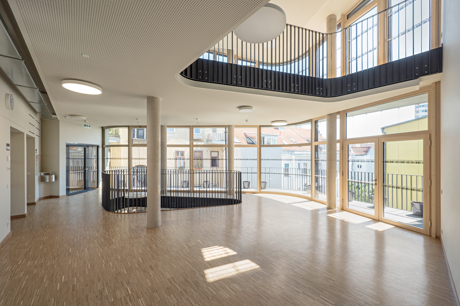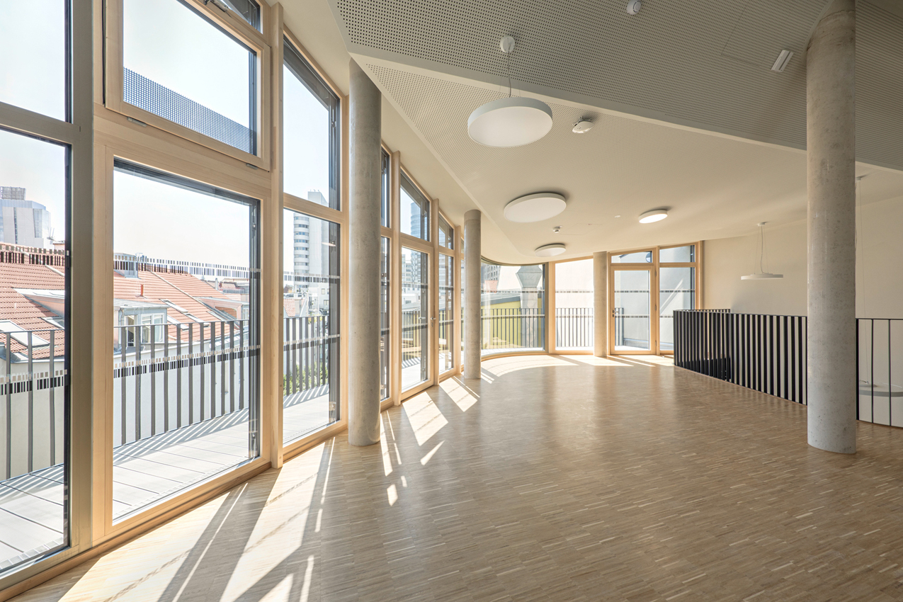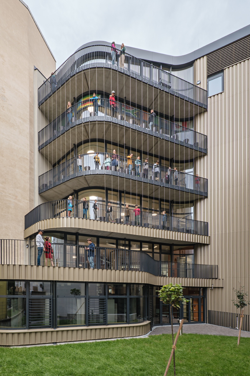 Zum Hof hin wurde das Gebäude entlang der Bestandsbrandwand so geformt, dass die bestehende Sichtachse entlang der angrenzenden Mittelschule nicht verstellt wurde und die beengte Raumsituation auch für die angrenzenden Liegenschaften am besten freigespielt werden konnte.