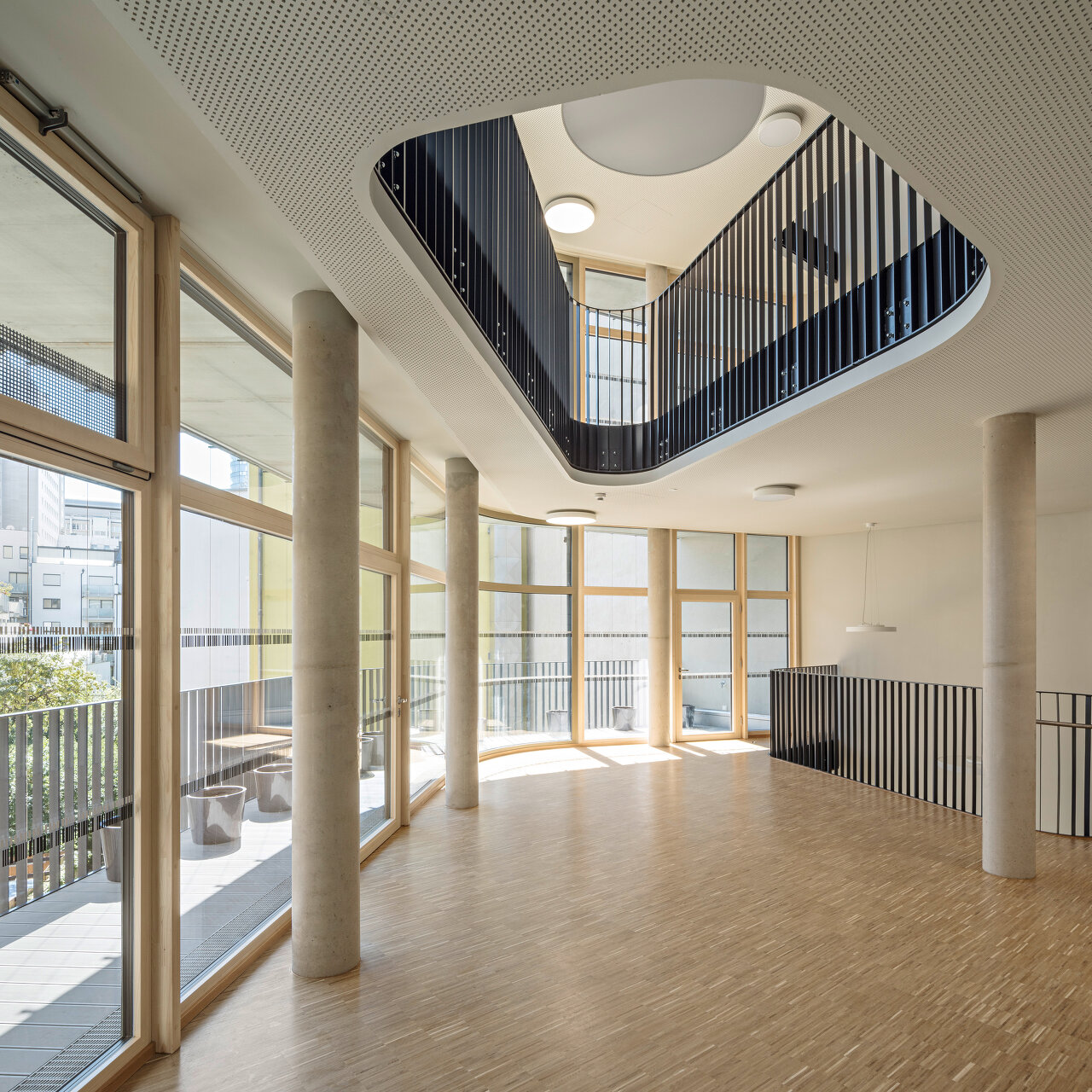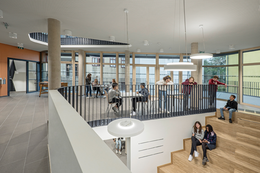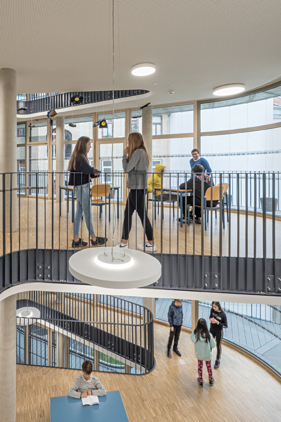 Den ruhigen und gleichmäßig belichteten Klassenräumen an der Straßenseite stehen die vollverglasten, hellen, im Winter überreichlich besonnten, lebendigen Lernzonen gegenüber. Frei geformte Deckendurchbrüche sorgen für großzügige Sichtverbindungen. (Autor: Achim Geissinger, nach einem Text der Architekten)