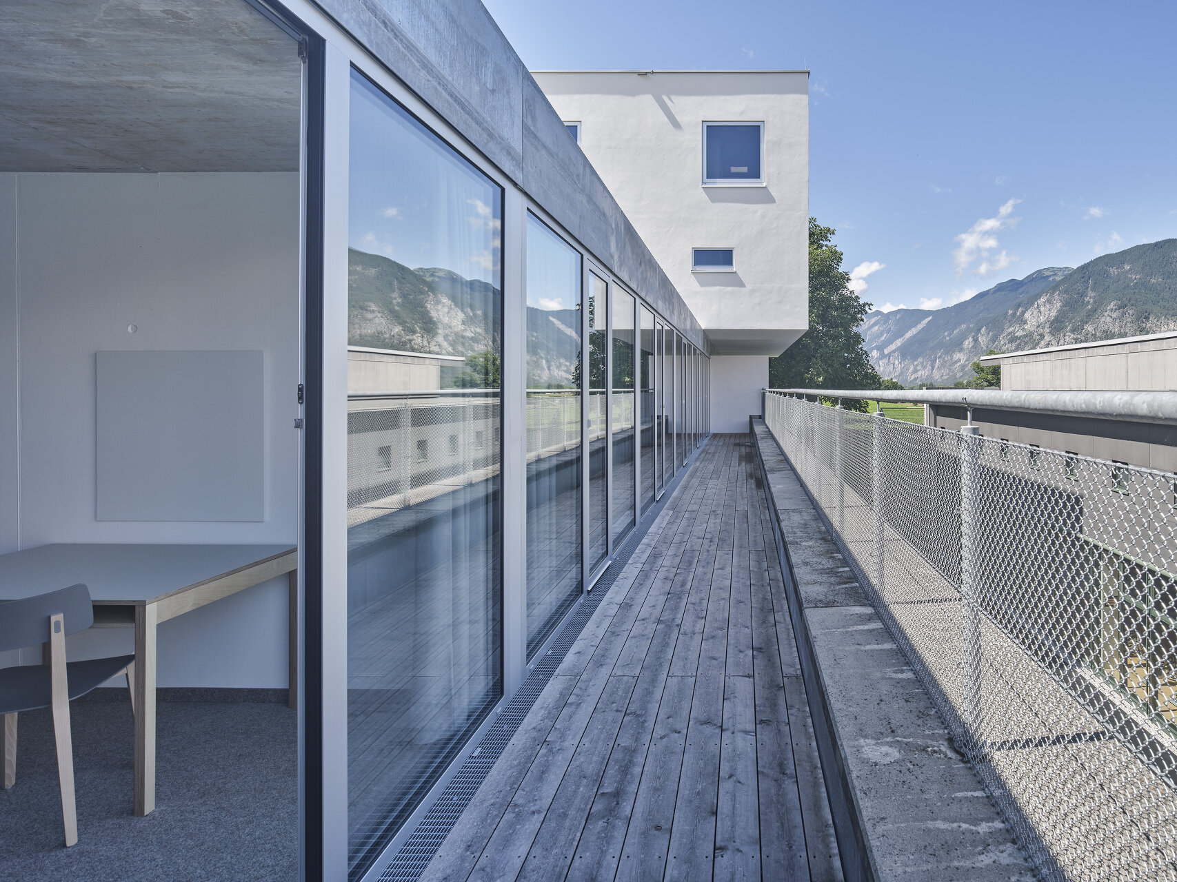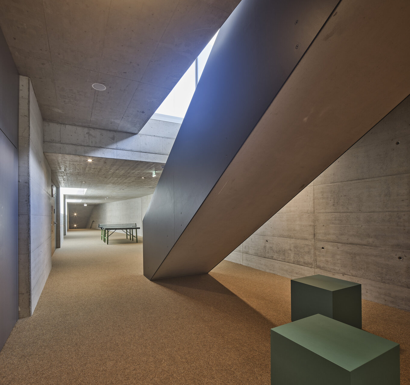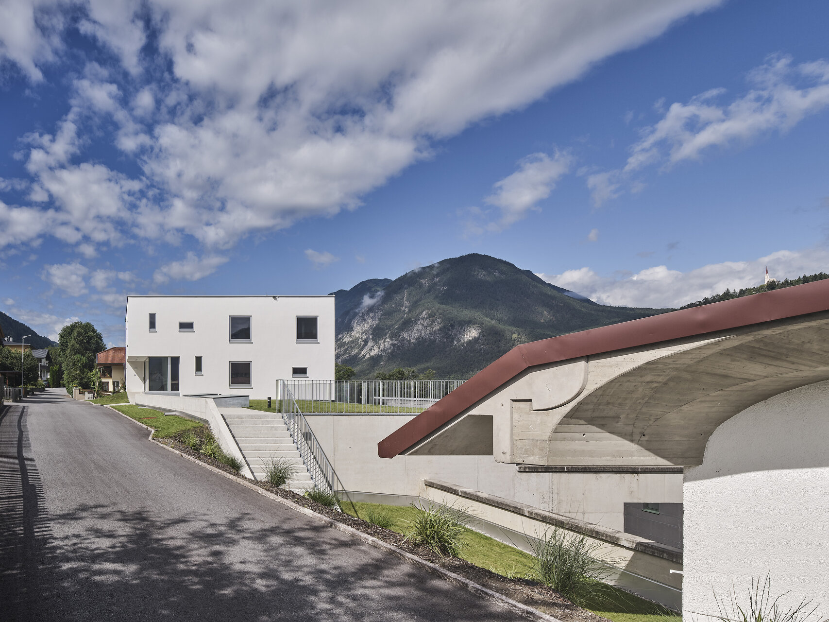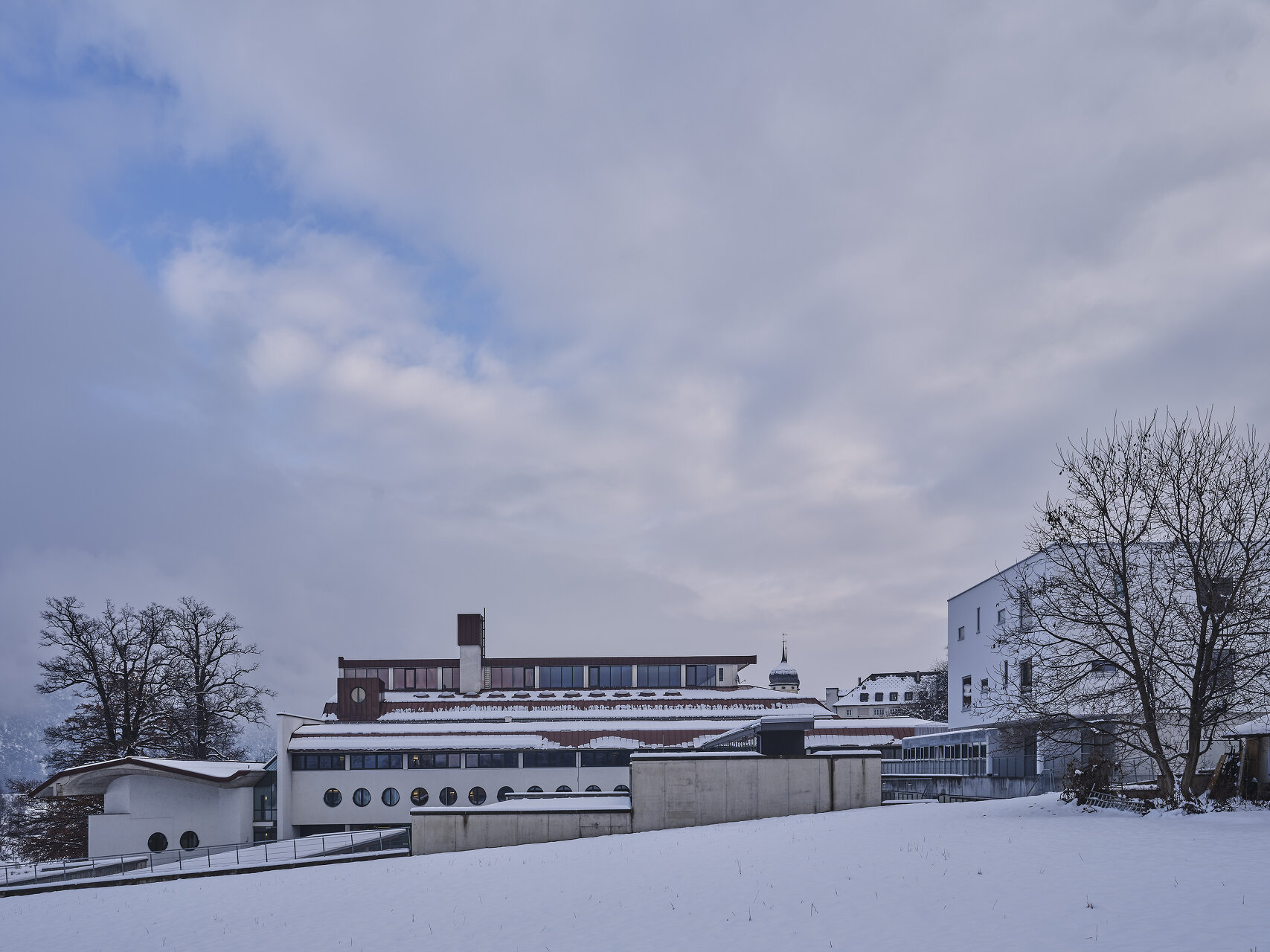 Über einen geladenen Realisierungswettbewerb wurde nach Lösungen für eine an den Bestand angebundene Erweiterung gesucht, die das Ensemble aus Stift und Schule so wenig wie möglich beeinträchtigt. Das Siegerprojekt von Kurt Rumplmayr und Sabine Penz war das einzige im Wettbewerb, dass die Südwestecke besetzt und dort auf einer, im Zuge der Sanierung und Erweiterung der Schule durch Albert Höhenwarter (2006) entstandenen Struktur aufbaut. Sie überbauten die Sporthalle mit einem eingeschoßigen Zimmertrakt, der am Ende in einen zweigeschoßigen Hochpunkt mündet. Ausgangspunkt für diesen Entwurf war die Weiterführung des im Schulgebäude verlaufenden „Schulwegs“. Beginnend beim bestehenden Zimmergang auf Ebene -1 führt dieser über einen Erschließungs- und Aufenthaltsbereich zu den Zimmererweiterungen im Westen und endet in der Vertikalerschließung des neuen Wohnhauses. Die 10 Zimmer in der Überbauung der Sporthalle öffnen sich – die Hanglage ausnutzend – über große Fensterfronten Richtung Norden zu einer vorgelagerten, schmalen Terrasse. Die unterirdisch liegende Erschließung der Zimmer wird über einen Lichthof und Oberlichte mit natürlichem Licht versorgt, auf ihrem Dach entstand ein für Sport und Freizeit nutzbarer Freibereich. Am westlichen Ende führt eine Treppe hinauf in das neue Wohnhaus an der Hauptmann-Kluibenschedl-Straße, einem weiß verputzten Kubus mit unregelmäßig angeordneten Fensteröffnungen, in dem auf zwei Geschoßen weitere 12 Zimmer untergebracht sind. In Respektabstand zum Skigymnasium platziert, leitet dieser Baukörper über zu der aus Einfamilienhäusern bestehenden Siedlungsstruktur des Dorfs. (Text: Claudia Wedekind)