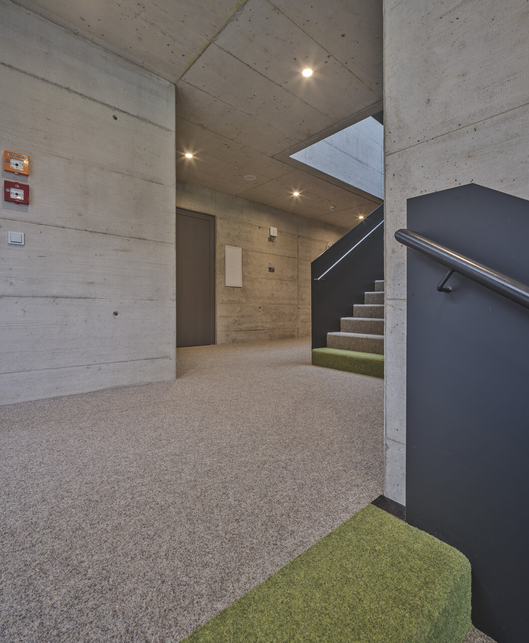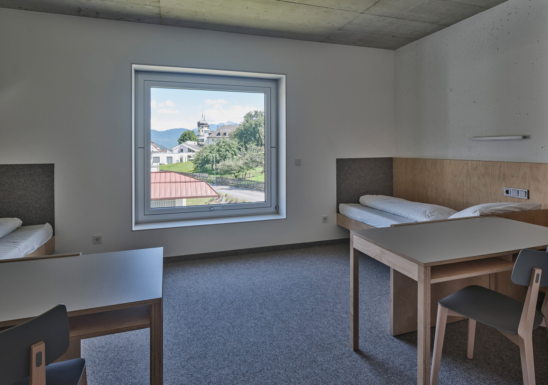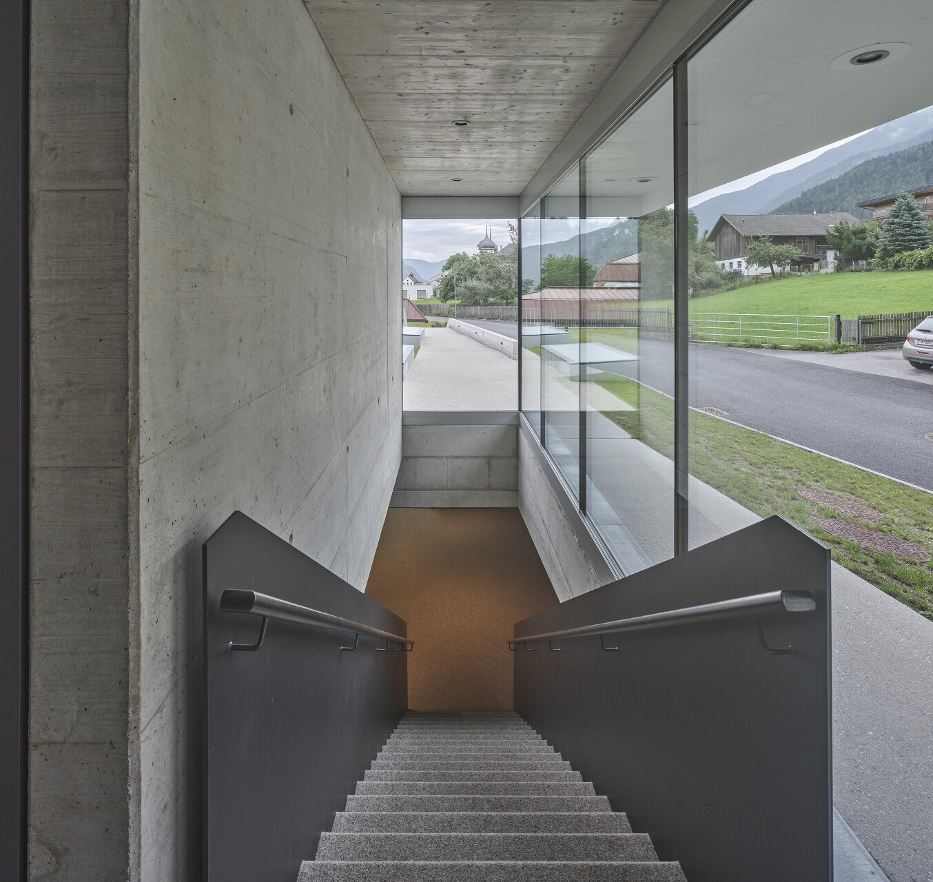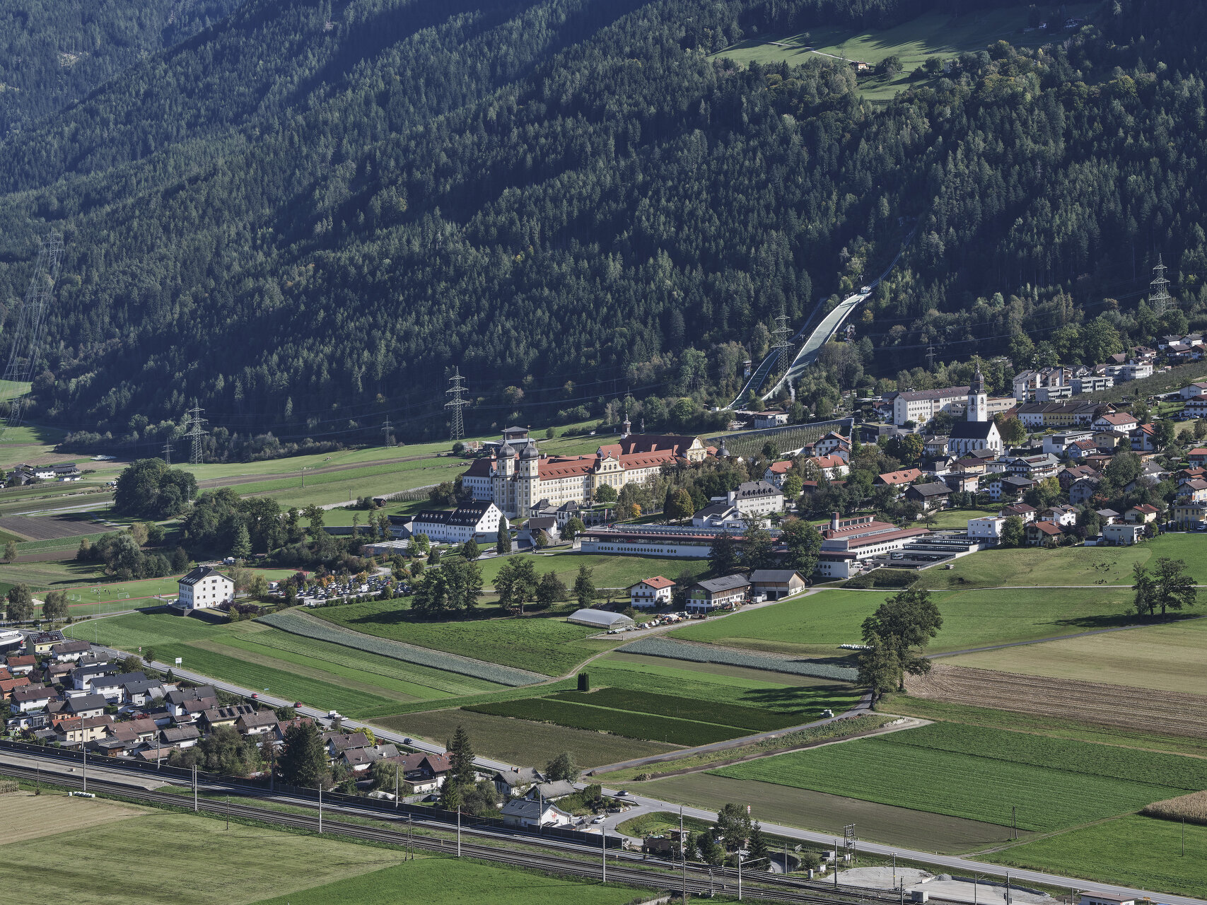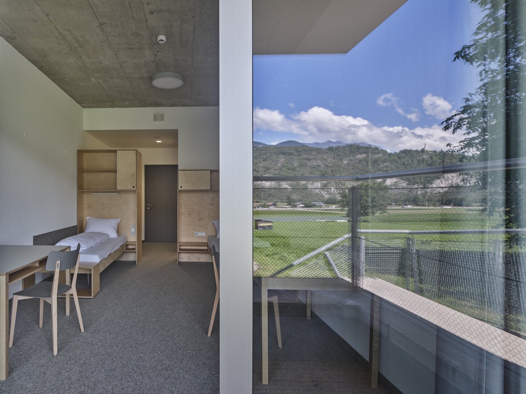 Über einen geladenen Realisierungswettbewerb wurde nach Lösungen für eine an den Bestand angebundene Erweiterung gesucht, die das Ensemble aus Stift und Schule so wenig wie möglich beeinträchtigt. Das Siegerprojekt von Kurt Rumplmayr und Sabine Penz war das einzige im Wettbewerb, dass die Südwestecke besetzt und dort auf einer, im Zuge der Sanierung und Erweiterung der Schule durch Albert Höhenwarter (2006) entstandenen Struktur aufbaut. Sie überbauten die Sporthalle mit einem eingeschoßigen Zimmertrakt, der am Ende in einen zweigeschoßigen Hochpunkt mündet. Ausgangspunkt für diesen Entwurf war die Weiterführung des im Schulgebäude verlaufenden „Schulwegs“. Beginnend beim bestehenden Zimmergang auf Ebene -1 führt dieser über einen Erschließungs- und Aufenthaltsbereich zu den Zimmererweiterungen im Westen und endet in der Vertikalerschließung des neuen Wohnhauses. Die 10 Zimmer in der Überbauung der Sporthalle öffnen sich – die Hanglage ausnutzend – über große Fensterfronten Richtung Norden zu einer vorgelagerten, schmalen Terrasse. Die unterirdisch liegende Erschließung der Zimmer wird über einen Lichthof und Oberlichte mit natürlichem Licht versorgt, auf ihrem Dach entstand ein für Sport und Freizeit nutzbarer Freibereich. Am westlichen Ende führt eine Treppe hinauf in das neue Wohnhaus an der Hauptmann-Kluibenschedl-Straße, einem weiß verputzten Kubus mit unregelmäßig angeordneten Fensteröffnungen, in dem auf zwei Geschoßen weitere 12 Zimmer untergebracht sind. In Respektabstand zum Skigymnasium platziert, leitet dieser Baukörper über zu der aus Einfamilienhäusern bestehenden Siedlungsstruktur des Dorfs. (Text: Claudia Wedekind)