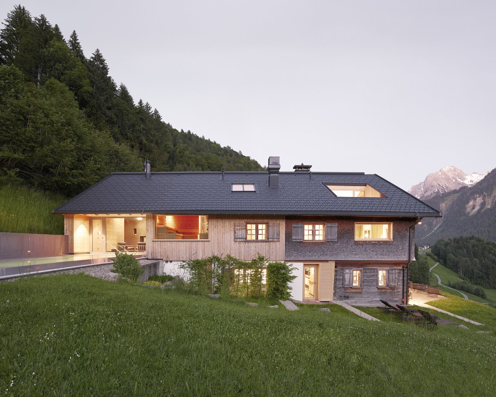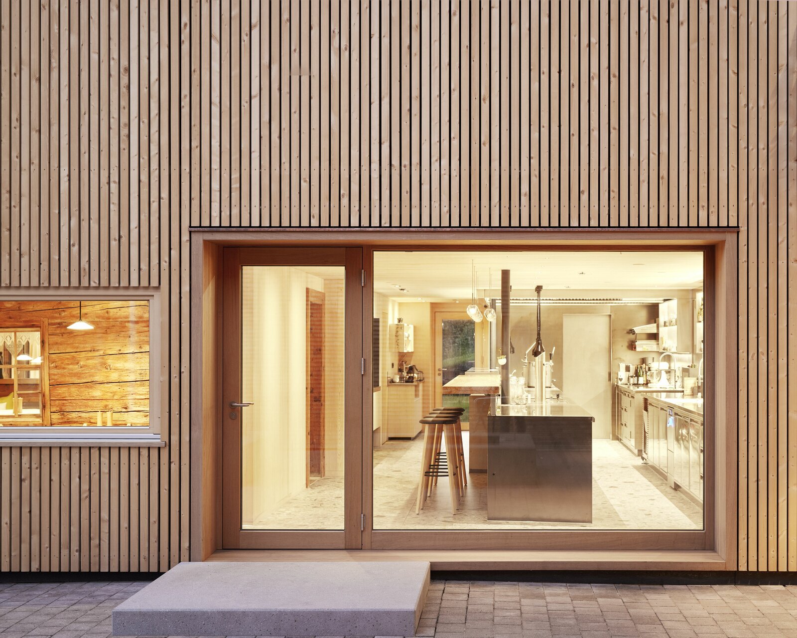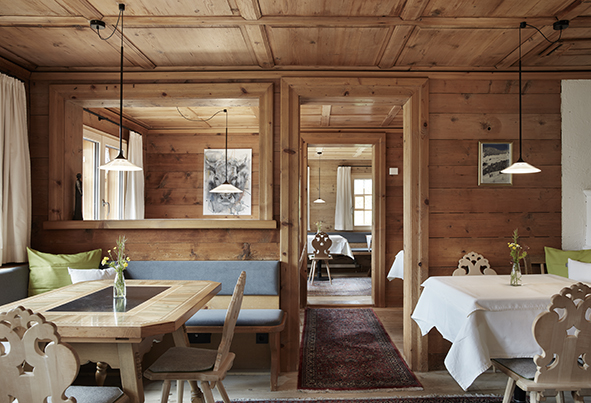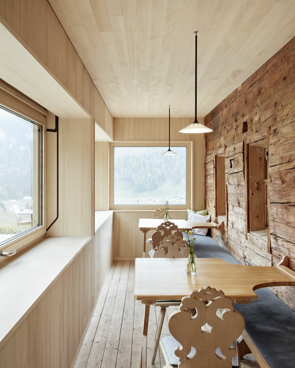 Begonnen wurde 2018 mit der Errichtung einer Wellnessanlage im ersten Obergeschoss des ehemaligen Bauernhauses. Wo früher der Stadel war, wurde der Saunabereich eingerichtet, im Verbindungsbau entstand eine großzügige Ruhelandschaft, außen wurde ein Pool ergänzt. Mit der zweiten Etappe im Jahr 2021 verwandelte sich das Erdgeschoss des Zwischenbauteils in eine Lobby als Aufenthaltsbereich und zum Empfang für die Gäste. Zwischen Eingangsbereich und Gasträumen wurde eine offene Küche eingerichtet. Der Hausherr, zugleich Küchenchef, bleibt so in Kontakt mit den Gästen, die umgekehrt einen Einblick in die Zubereitung der Speisen erhalten. Als leichtes Trennelement dient eine höhenverstellbare Theke, die morgens fürs Frühstücksbuffet, nachmittags zur Auslage der Kuchen und abends schließlich als Bar oder „Chef‘s Table“ genutzt wird. Die weitgehend intakten Gaststuben wurden im Wesentlichen belassen. Hier wurde nur repariert, etwas umarrangiert und um zwei Räume erweitert.
