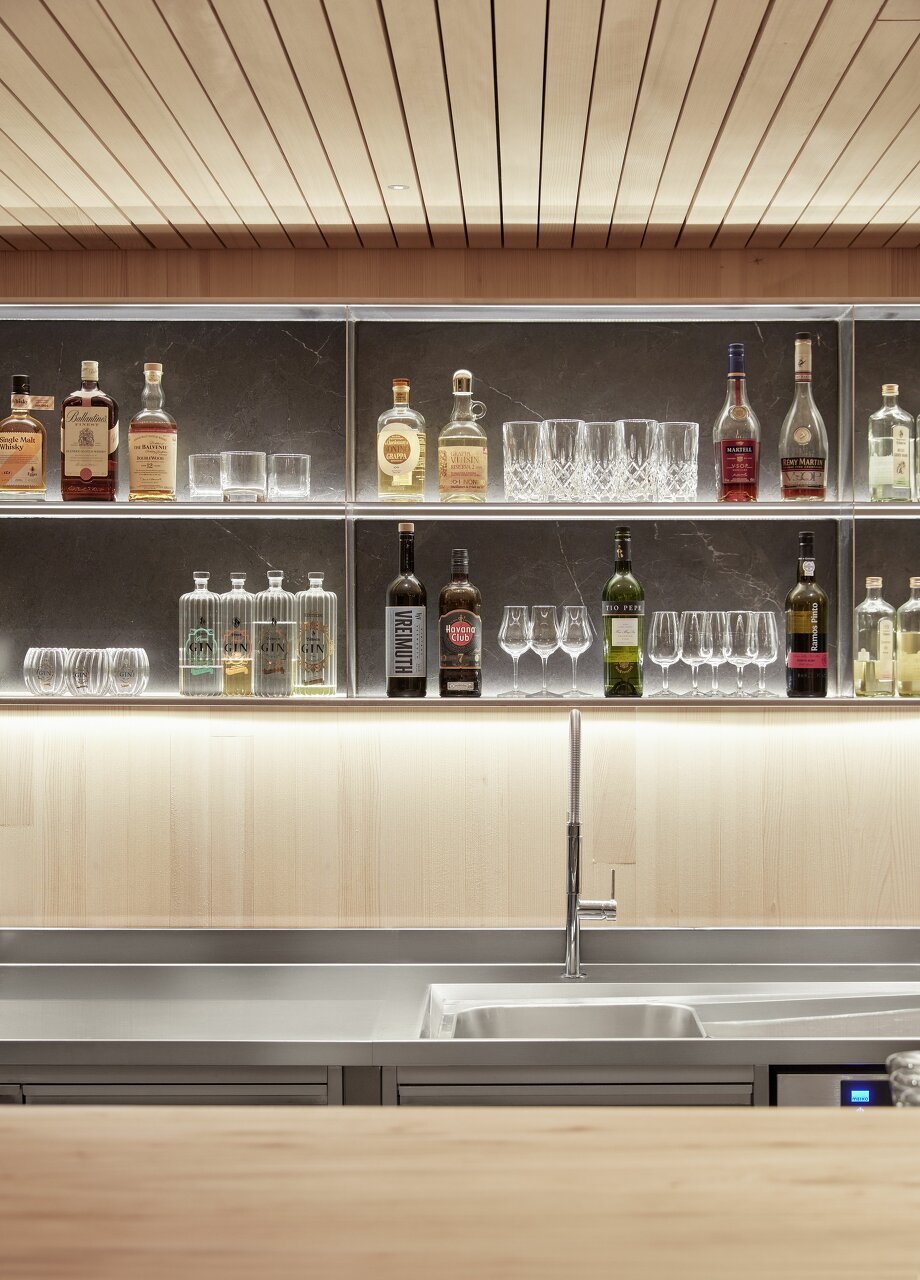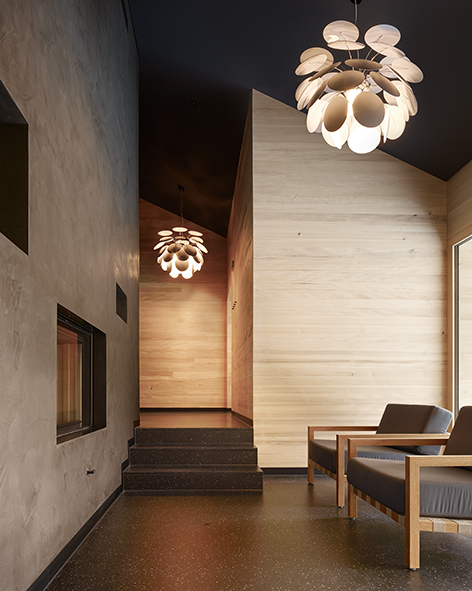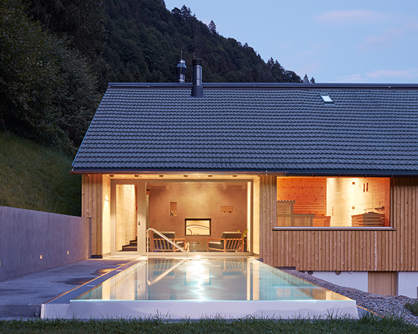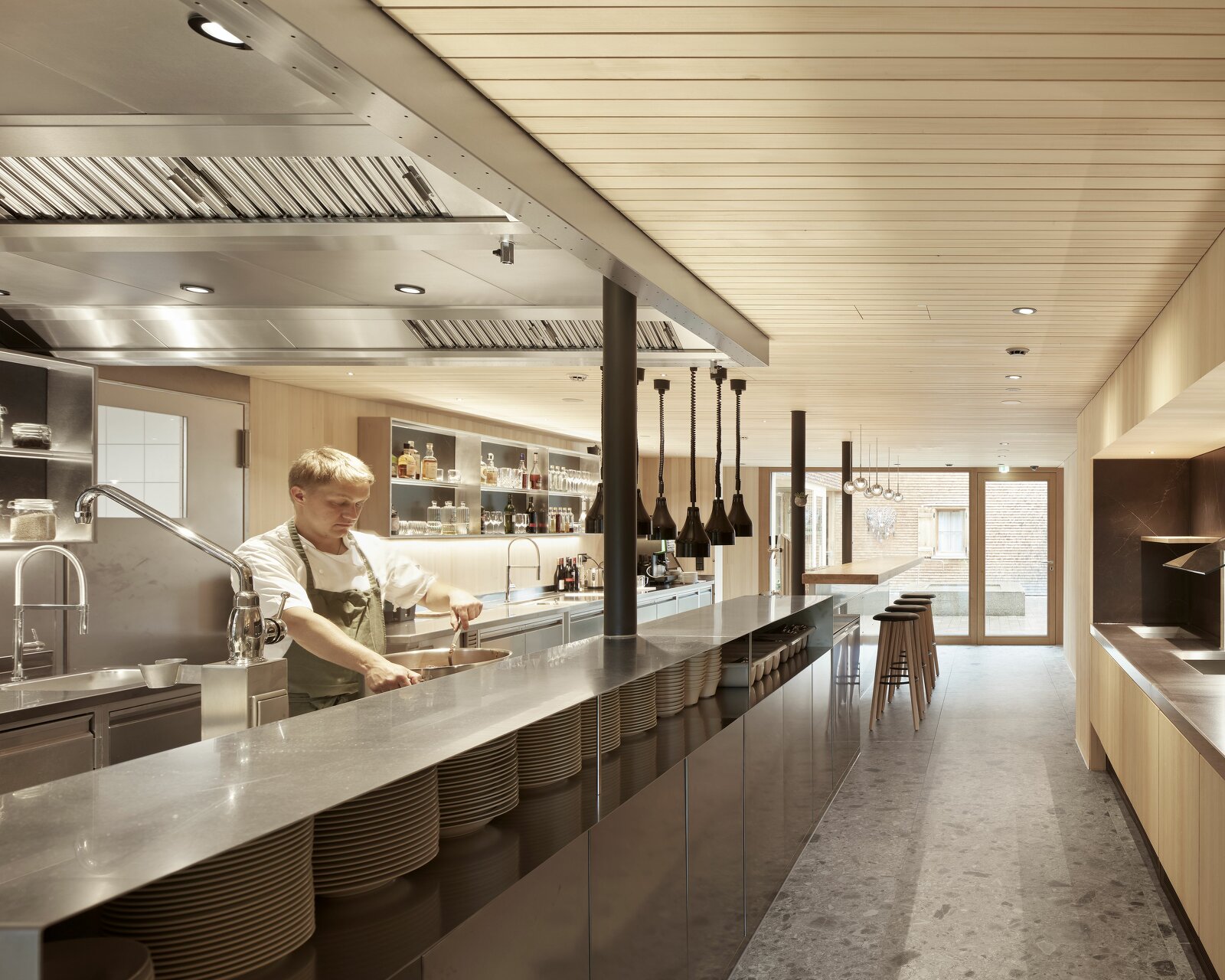 Begonnen wurde 2018 mit der Errichtung einer Wellnessanlage im ersten Obergeschoss des ehemaligen Bauernhauses. Wo früher der Stadel war, wurde der Saunabereich eingerichtet, im Verbindungsbau entstand eine großzügige Ruhelandschaft, außen wurde ein Pool ergänzt. Mit der zweiten Etappe im Jahr 2021 verwandelte sich das Erdgeschoss des Zwischenbauteils in eine Lobby als Aufenthaltsbereich und zum Empfang für die Gäste. Zwischen Eingangsbereich und Gasträumen wurde eine offene Küche eingerichtet. Der Hausherr, zugleich Küchenchef, bleibt so in Kontakt mit den Gästen, die umgekehrt einen Einblick in die Zubereitung der Speisen erhalten. Als leichtes Trennelement dient eine höhenverstellbare Theke, die morgens fürs Frühstücksbuffet, nachmittags zur Auslage der Kuchen und abends schließlich als Bar oder „Chef‘s Table“ genutzt wird. Die weitgehend intakten Gaststuben wurden im Wesentlichen belassen. Hier wurde nur repariert, etwas umarrangiert und um zwei Räume erweitert.