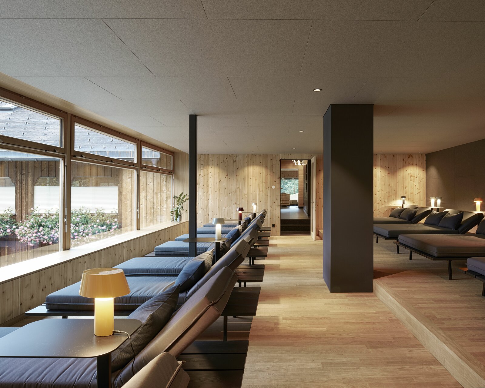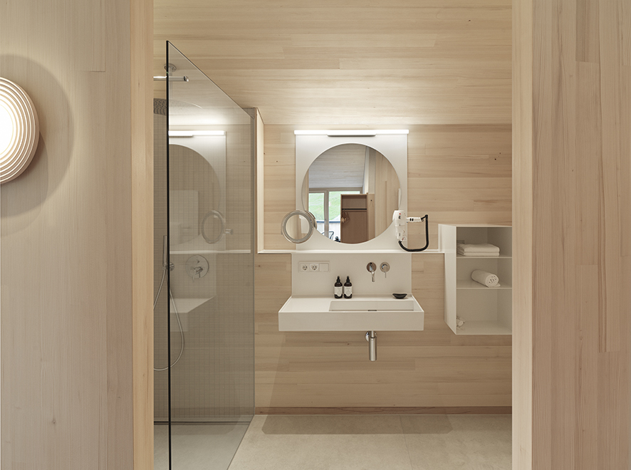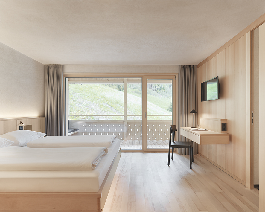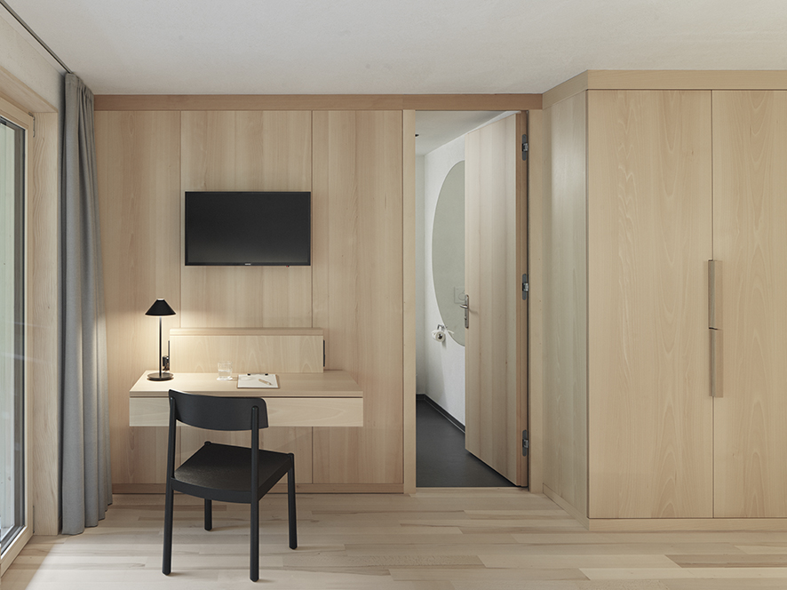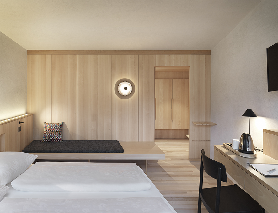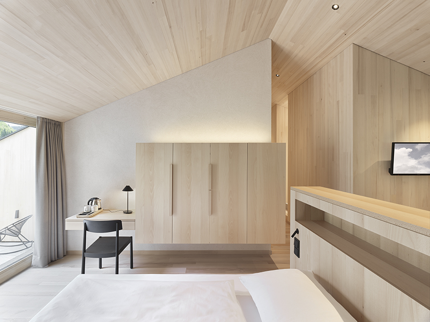 Mit Eingang, Schlafbereich und Bad sind die neuen Zimmer in klaren, wohnlichen Grundrissen organisiert. Die drei Suiten überraschen mit freistehenden Duschen oder Badewannen mit Aussicht in den Himmel. In der dritten Bauetappe (2023) erhielten auch die elf Zimmer im östlichen Baukörper des Ensembles eine Generalsanierung. Sämtliche Oberflächen, Mobiliar und Beleuchtung wurden erneuert. Alle Zimmer erhielten mit der neuen Balkonzone einen eigenen Außenraum. Im Dachgeschoss sind drei Suiten mit Terrasse untergebracht. Bei allen drei Bauphasen wurde auf konsequente Regionalität geachtet: Verwendung von heimischen Hölzern, hochwertige Umsetzung mit Handwerksbetrieben aus dem Ort. Wände und Decken sind aus gebürstetem Tannenholz, die Zimmerböden aus geseifter, sägerauer Buche. In den dunkel gebeizten Buchenmöbeln finden die hellen Holzoberflächen der Zimmer einen wirksamen Kontrast. (Text: Tobias Hagleitner)