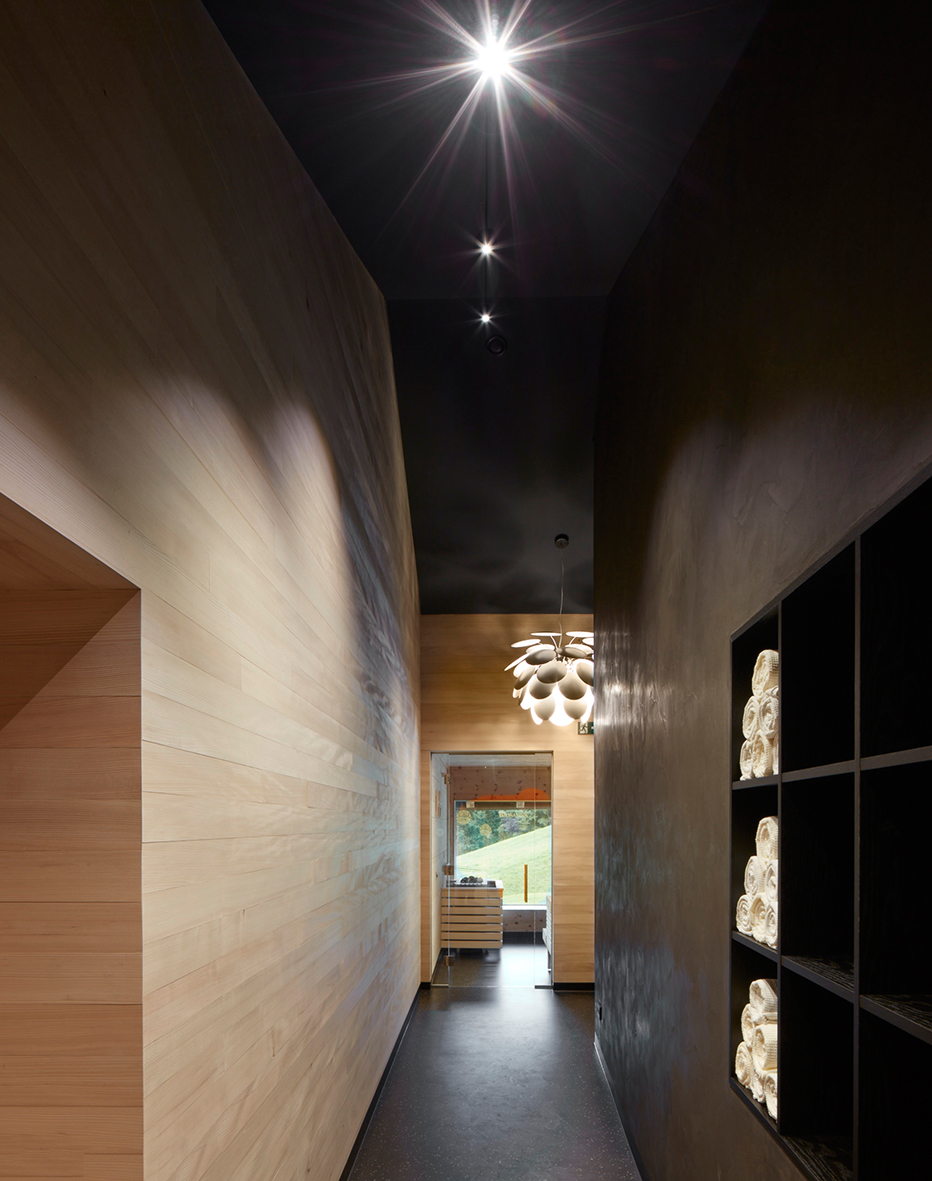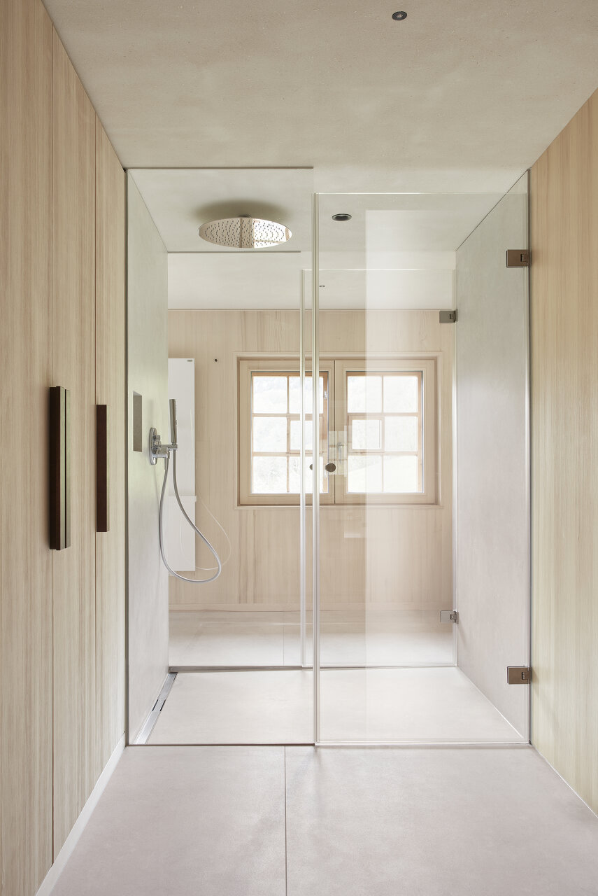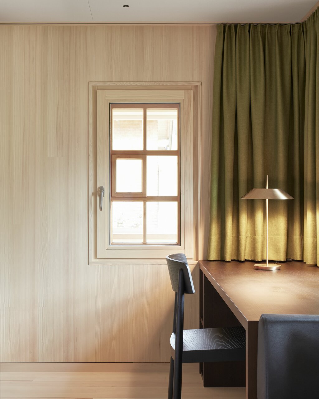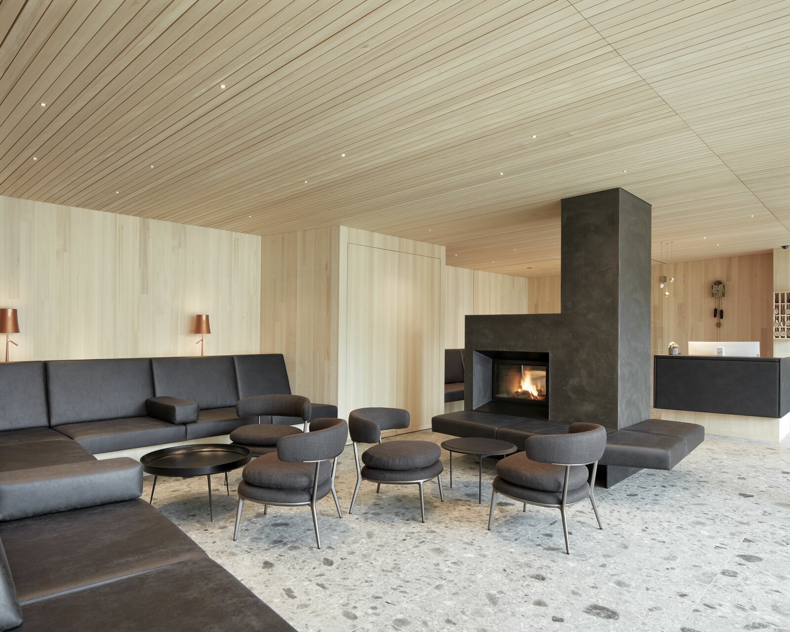 Mit Eingang, Schlafbereich und Bad sind die neuen Zimmer in klaren, wohnlichen Grundrissen organisiert. Die drei Suiten überraschen mit freistehenden Duschen oder Badewannen mit Aussicht in den Himmel. In der dritten Bauetappe (2023) erhielten auch die elf Zimmer im östlichen Baukörper des Ensembles eine Generalsanierung. Sämtliche Oberflächen, Mobiliar und Beleuchtung wurden erneuert. Alle Zimmer erhielten mit der neuen Balkonzone einen eigenen Außenraum. Im Dachgeschoss sind drei Suiten mit Terrasse untergebracht. Bei allen drei Bauphasen wurde auf konsequente Regionalität geachtet: Verwendung von heimischen Hölzern, hochwertige Umsetzung mit Handwerksbetrieben aus dem Ort. Wände und Decken sind aus gebürstetem Tannenholz, die Zimmerböden aus geseifter, sägerauer Buche. In den dunkel gebeizten Buchenmöbeln finden die hellen Holzoberflächen der Zimmer einen wirksamen Kontrast. (Text: Tobias Hagleitner)