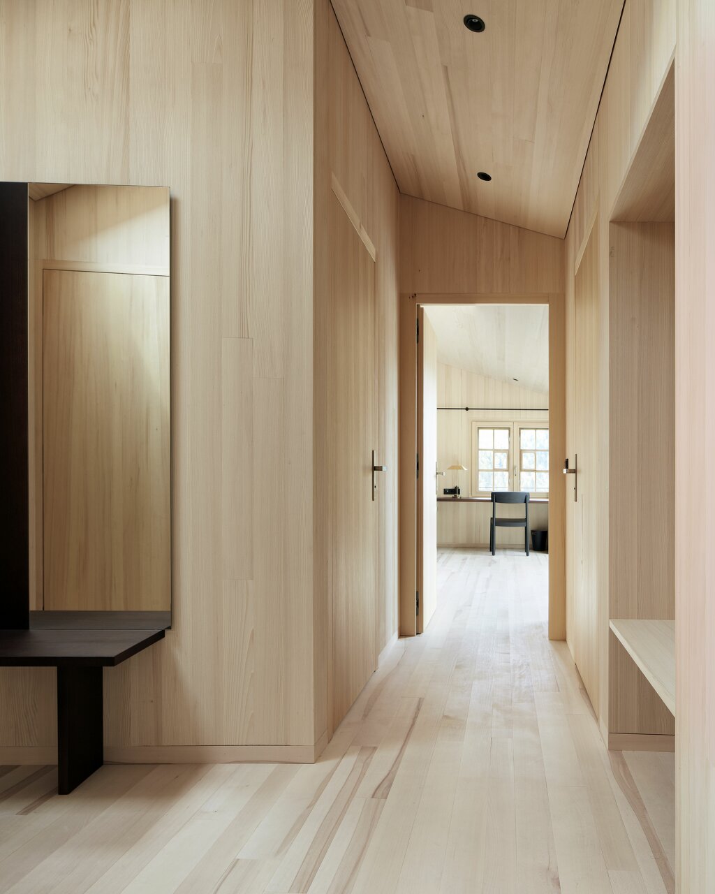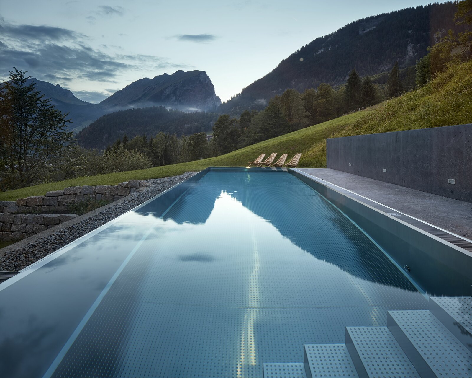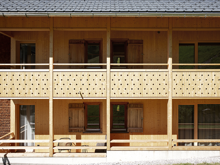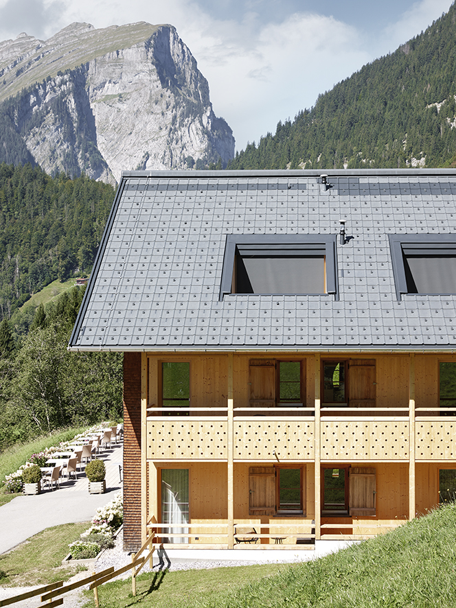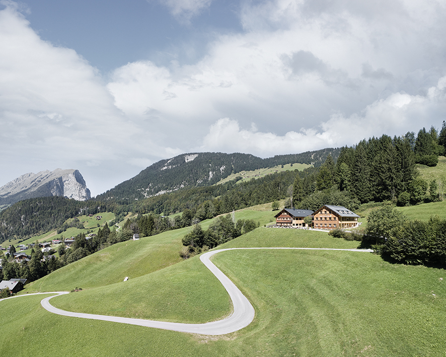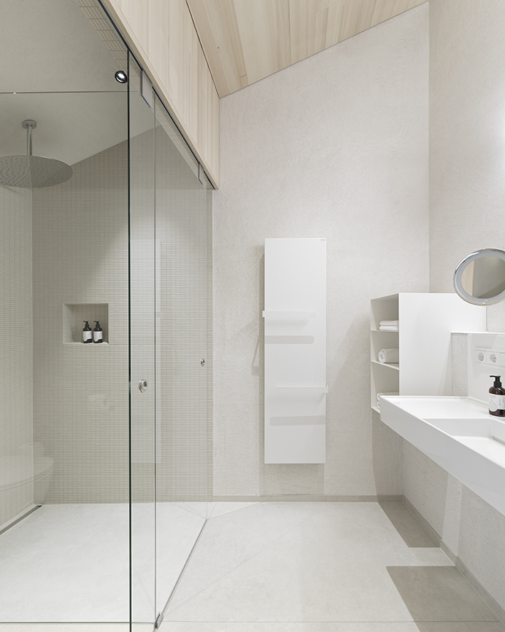 Mit Eingang, Schlafbereich und Bad sind die neuen Zimmer in klaren, wohnlichen Grundrissen organisiert. Die drei Suiten überraschen mit freistehenden Duschen oder Badewannen mit Aussicht in den Himmel. In der dritten Bauetappe (2023) erhielten auch die elf Zimmer im östlichen Baukörper des Ensembles eine Generalsanierung. Sämtliche Oberflächen, Mobiliar und Beleuchtung wurden erneuert. Alle Zimmer erhielten mit der neuen Balkonzone einen eigenen Außenraum. Im Dachgeschoss sind drei Suiten mit Terrasse untergebracht. Bei allen drei Bauphasen wurde auf konsequente Regionalität geachtet: Verwendung von heimischen Hölzern, hochwertige Umsetzung mit Handwerksbetrieben aus dem Ort. Wände und Decken sind aus gebürstetem Tannenholz, die Zimmerböden aus geseifter, sägerauer Buche. In den dunkel gebeizten Buchenmöbeln finden die hellen Holzoberflächen der Zimmer einen wirksamen Kontrast. (Text: Tobias Hagleitner)