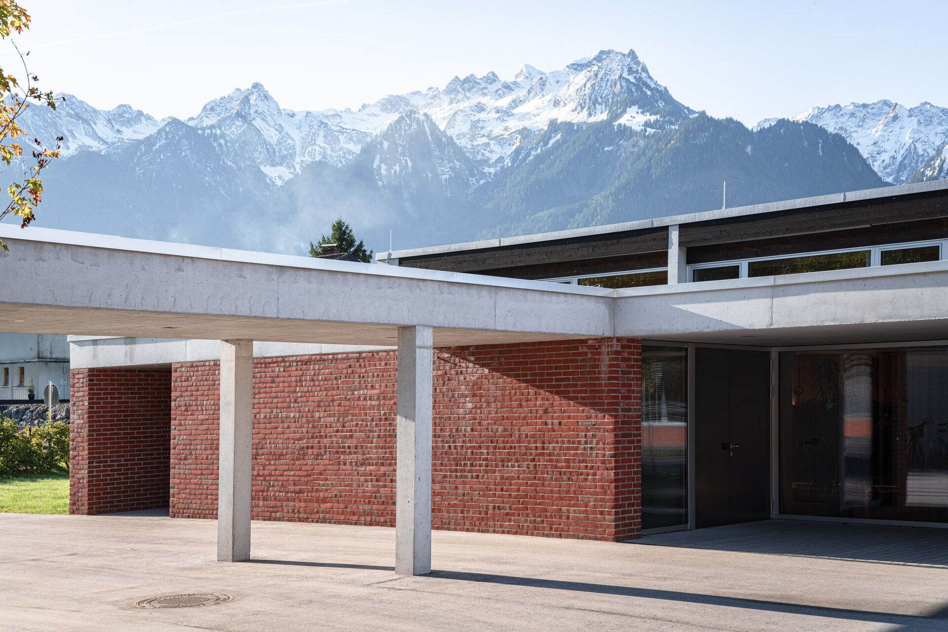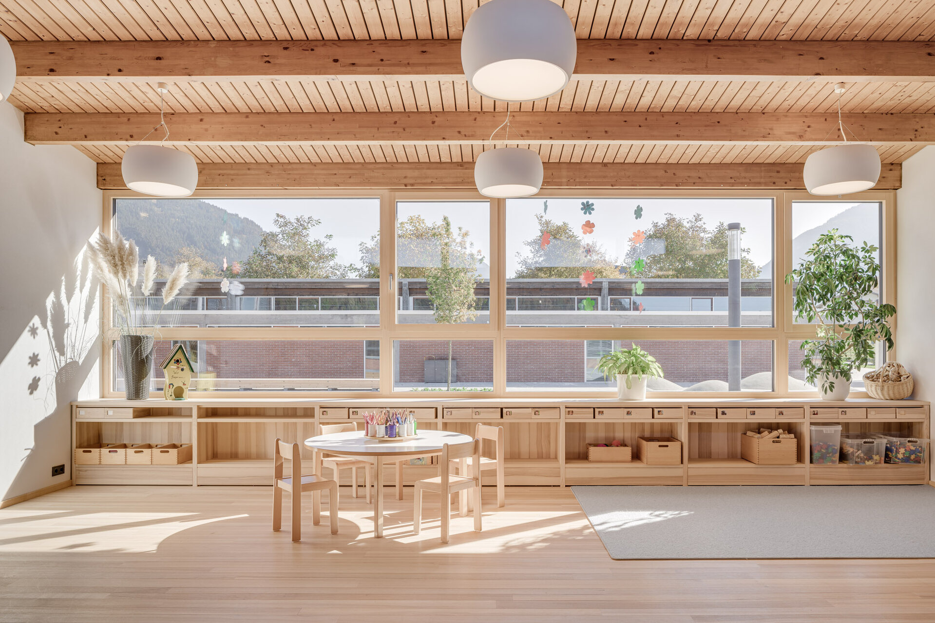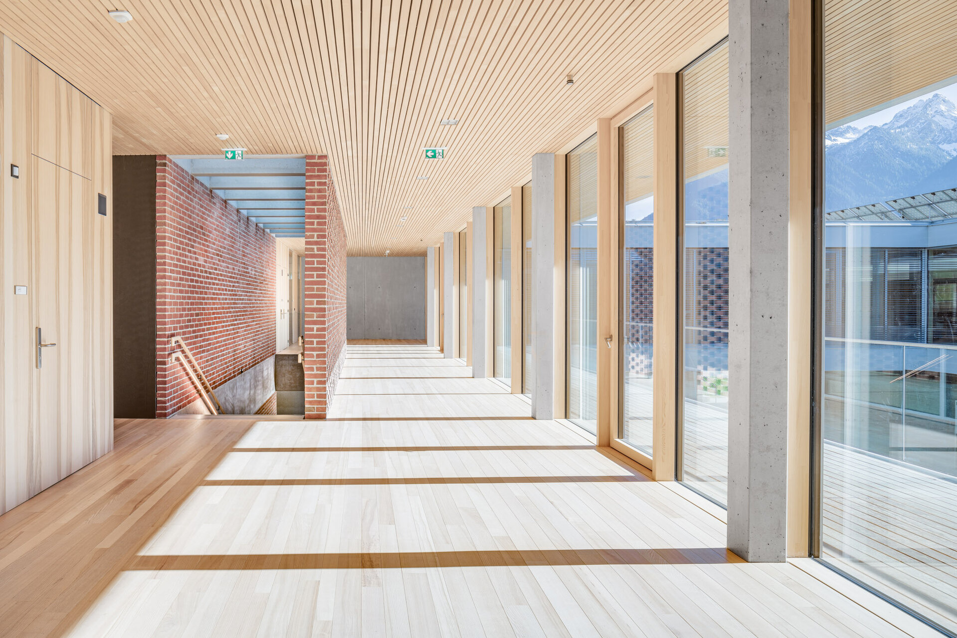 Die VS Nüziders ist eine Ikone moderner Bildungsarchitektur. Sie wurde von der Architektengemeinschaft C4 (die drei Vorarlberger Max Fohn, Helmut Pfanner, Karl Sillaber und der Tiroler Friedrich Wengler) geplant und von 1959 – 1963 errichtet. Sie war der erste Bau der Architektengemeinschaft C4 und schon ein Meilenstein. 2002-2004 wurde die Schule von Architekt Bruno Spagolla teilsaniert und um einen aufgeständerten Klassentrakt erweitert. Seither haben sich die räumlichen und didaktischen Anforderungen an einen modernen Bildungscampus zu entsprechen, musste der Bestand grundlegend umstrukturiert werden. 2017 schrieb die Gemeinde dafür einen Wettbewerb aus, bei dem das Projekt von Fink Thurner Architekten überzeugte. Die Architekten legten großes Augenmerk auf den schonenden Umgang mit der baukulturell wertvollen Bausubstanz aus den 1960er Jahren. Auch die bereits 2002 sanierten Bauteile bleiben weitgehend unberührt.Die eingeschossige Bestandsschule umschließt im Prinzip einen Hofraum und fügt sich gut in ihre ländliche Umgebung. Der westliche Bestandstrakt wird auf den Rohbau zurückgeführt und nimmt im Erdgeschoss nun auch Teile des Kindergartens auf. Die Nutzung des Untergeschosses durch Sonderunterrichtsräume der Volksschule, die von Oberlichtbändern natürlich erhellt und sehr hochwertig ausgeführt sind, bleibt bestehen. Die für den Bestand charakteristische Materialität aus Sichtbeton, Holz und Sichtziegelmauerwerk wird aufgenommen und zeitgemäß weitergeführt.