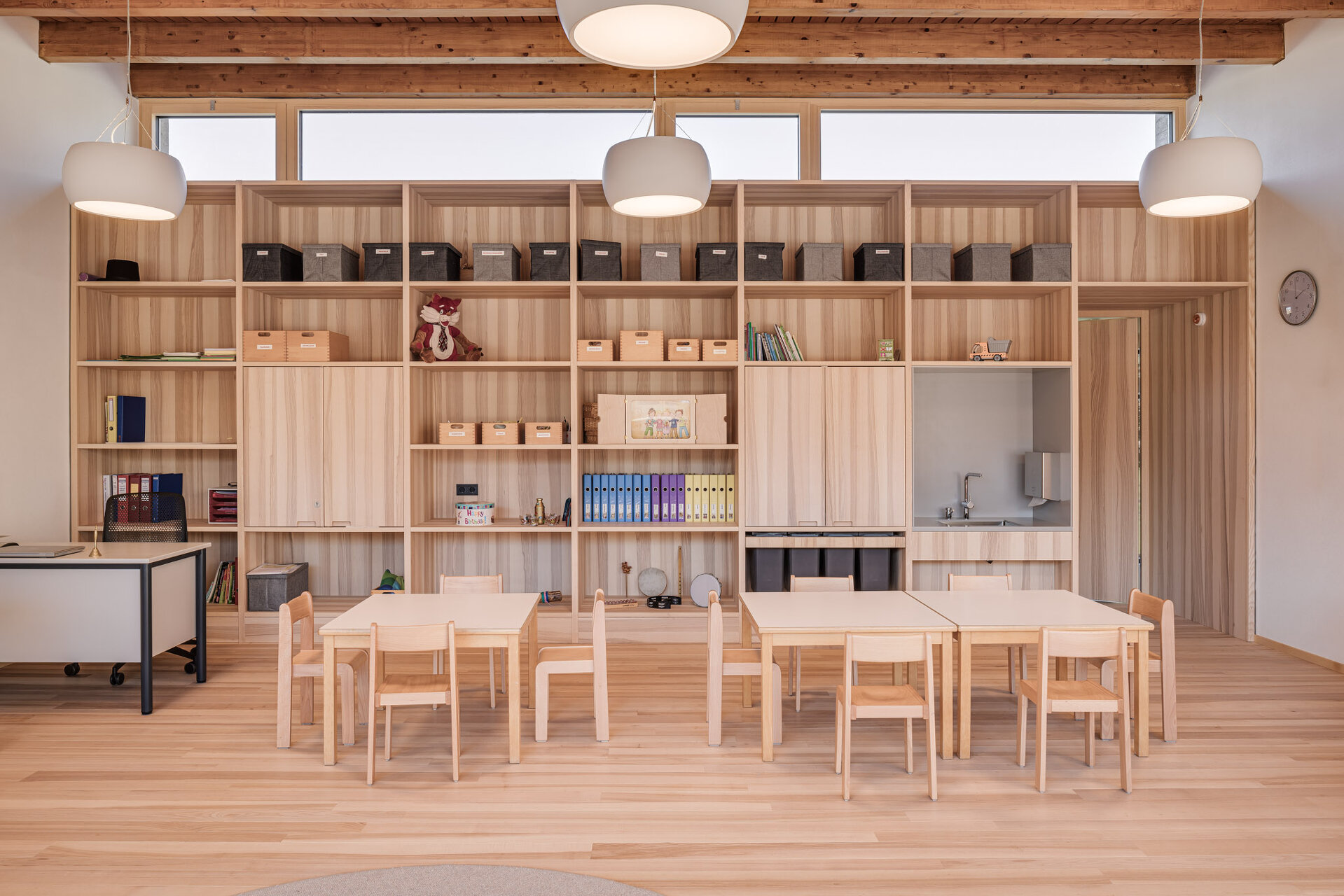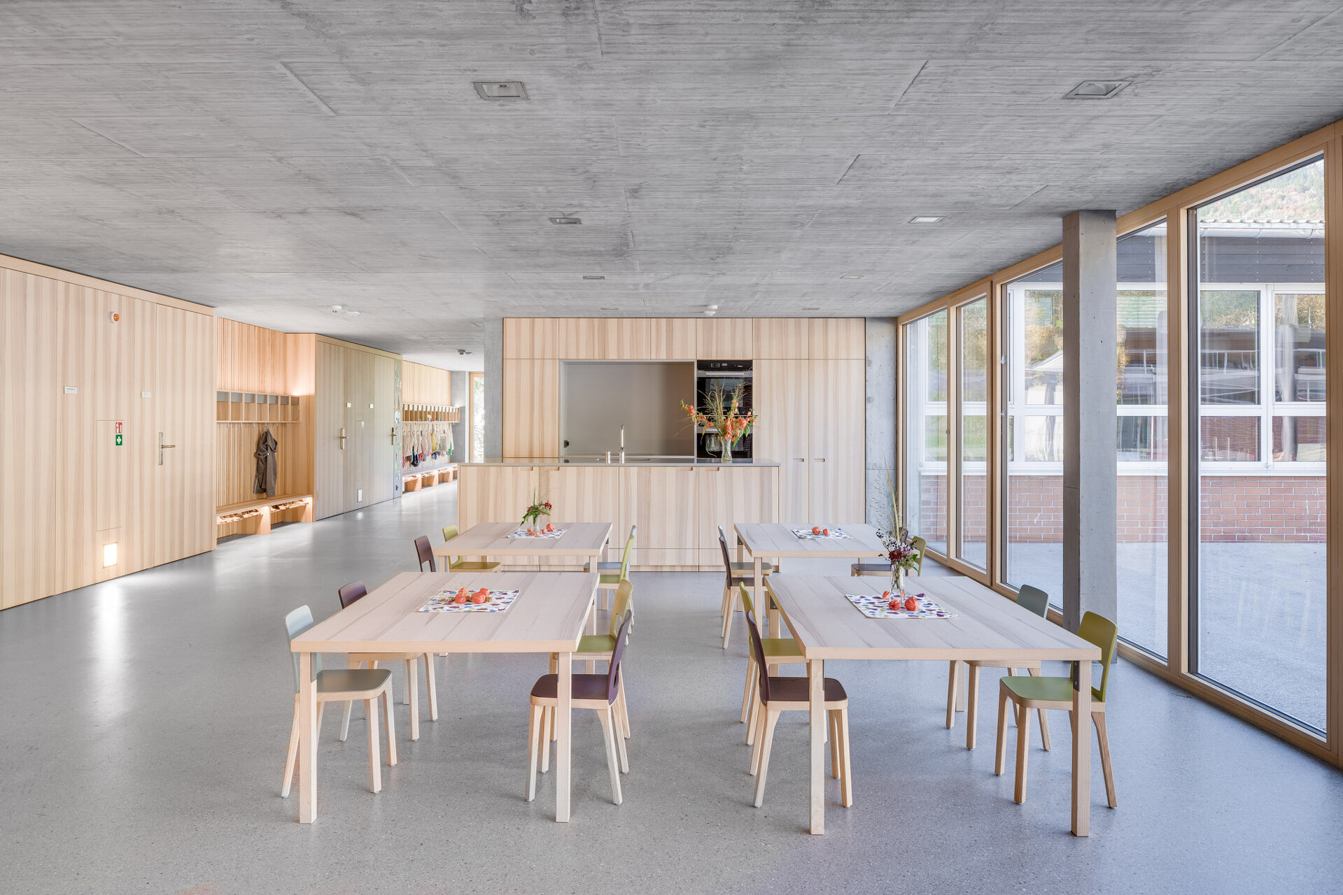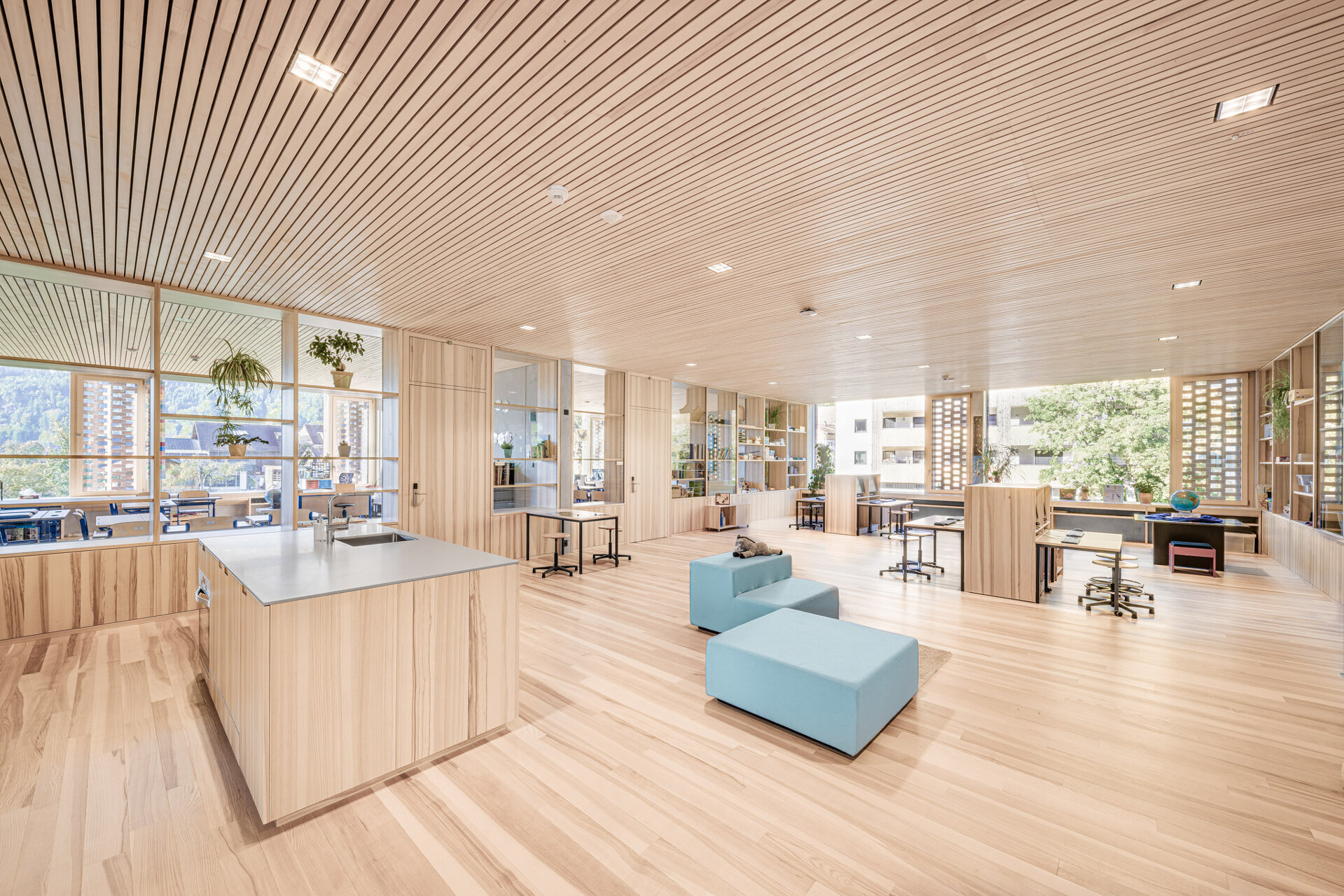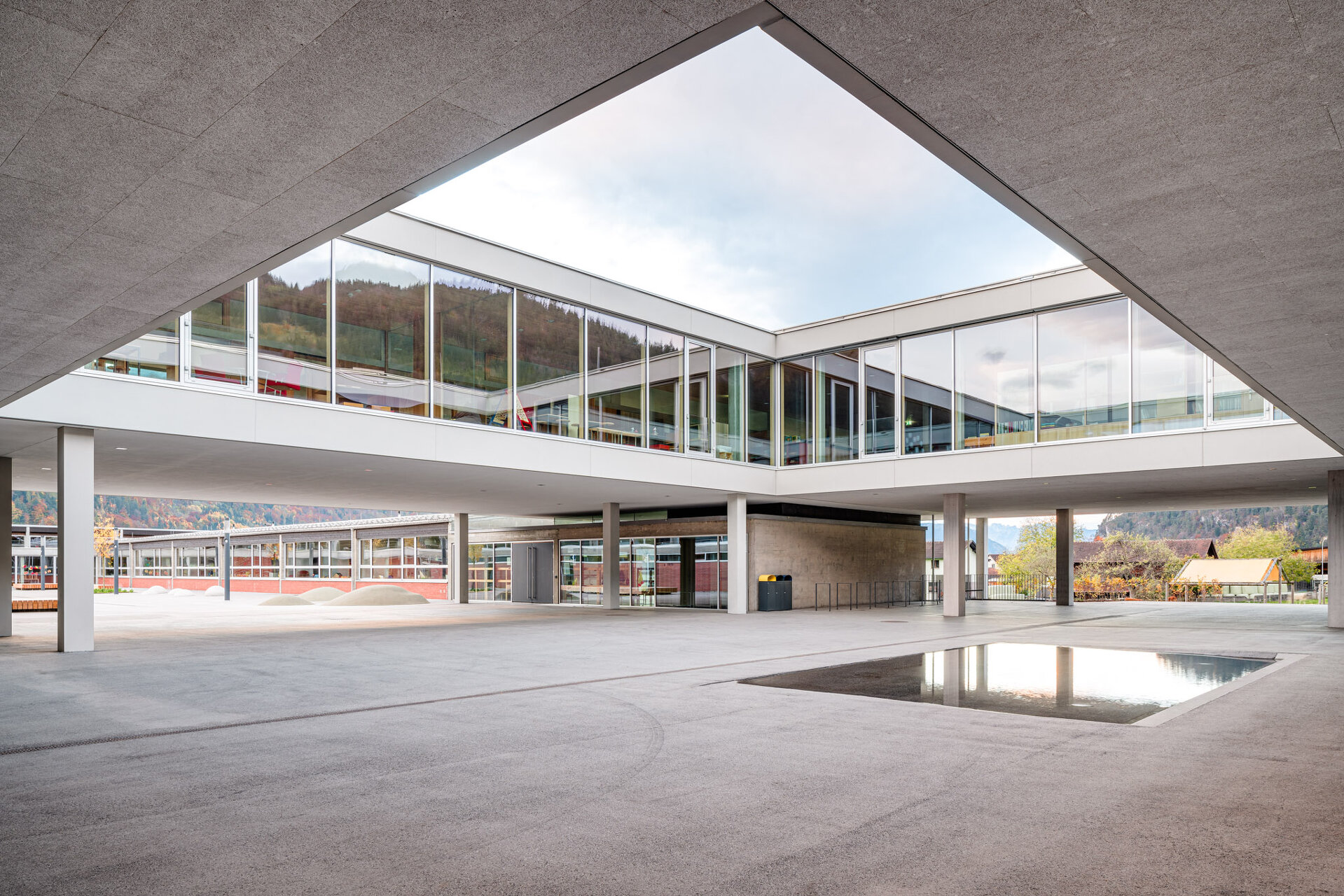 Die VS Nüziders ist eine Ikone moderner Bildungsarchitektur. Sie wurde von der Architektengemeinschaft C4 (die drei Vorarlberger Max Fohn, Helmut Pfanner, Karl Sillaber und der Tiroler Friedrich Wengler) geplant und von 1959 – 1963 errichtet. Sie war der erste Bau der Architektengemeinschaft C4 und schon ein Meilenstein. 2002-2004 wurde die Schule von Architekt Bruno Spagolla teilsaniert und um einen aufgeständerten Klassentrakt erweitert. Seither haben sich die räumlichen und didaktischen Anforderungen an einen modernen Bildungscampus zu entsprechen, musste der Bestand grundlegend umstrukturiert werden. 2017 schrieb die Gemeinde dafür einen Wettbewerb aus, bei dem das Projekt von Fink Thurner Architekten überzeugte. Die Architekten legten großes Augenmerk auf den schonenden Umgang mit der baukulturell wertvollen Bausubstanz aus den 1960er Jahren. Auch die bereits 2002 sanierten Bauteile bleiben weitgehend unberührt.Die eingeschossige Bestandsschule umschließt im Prinzip einen Hofraum und fügt sich gut in ihre ländliche Umgebung. Der westliche Bestandstrakt wird auf den Rohbau zurückgeführt und nimmt im Erdgeschoss nun auch Teile des Kindergartens auf. Die Nutzung des Untergeschosses durch Sonderunterrichtsräume der Volksschule, die von Oberlichtbändern natürlich erhellt und sehr hochwertig ausgeführt sind, bleibt bestehen. Die für den Bestand charakteristische Materialität aus Sichtbeton, Holz und Sichtziegelmauerwerk wird aufgenommen und zeitgemäß weitergeführt.