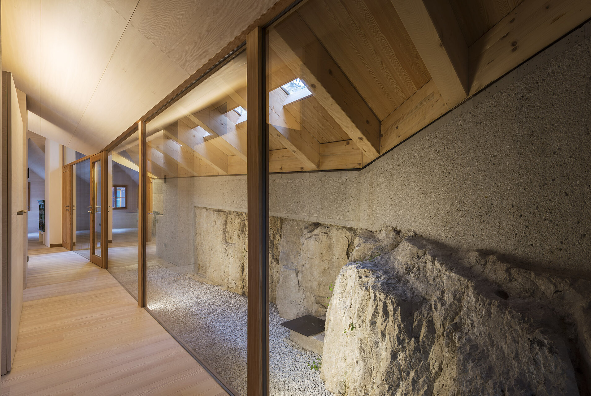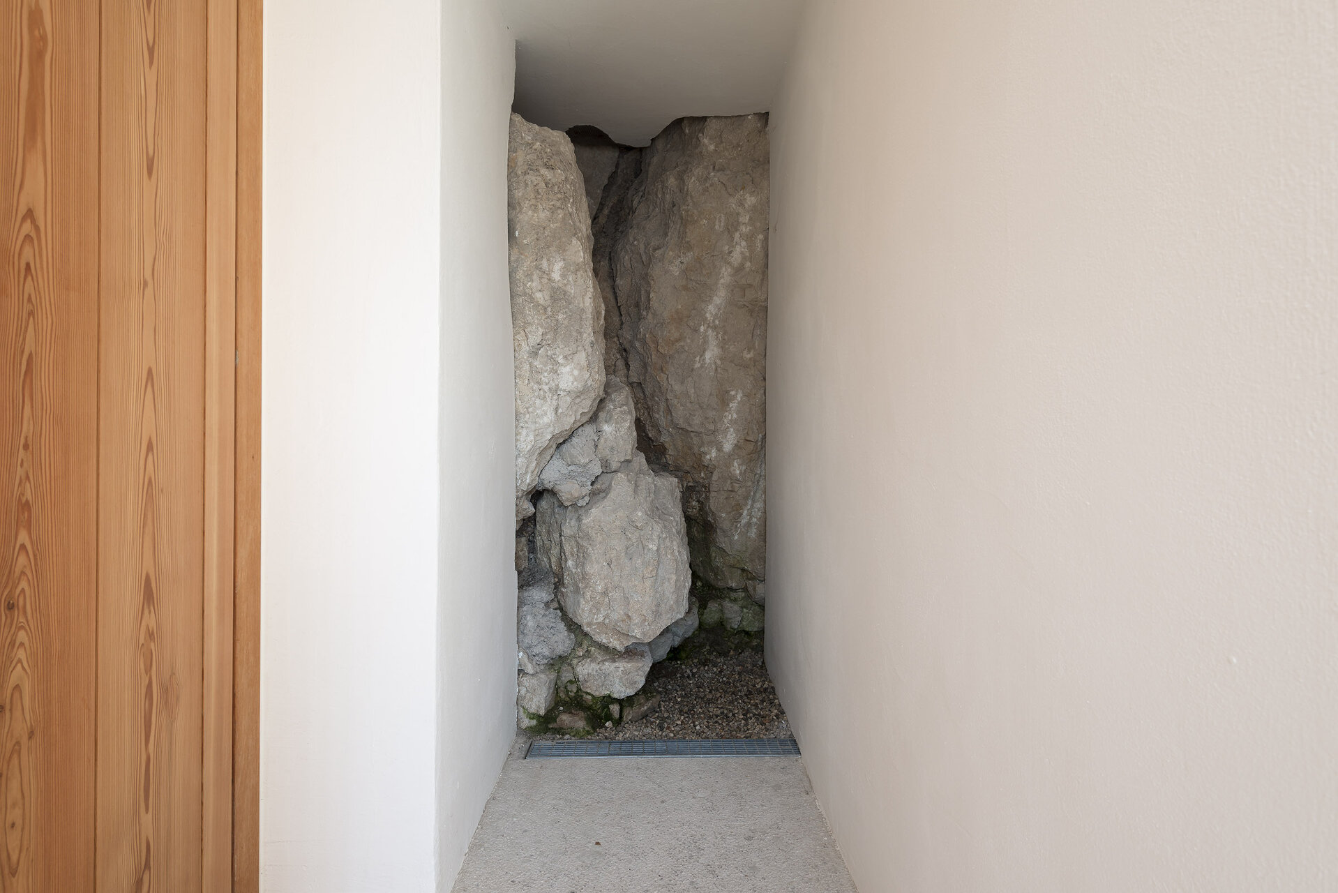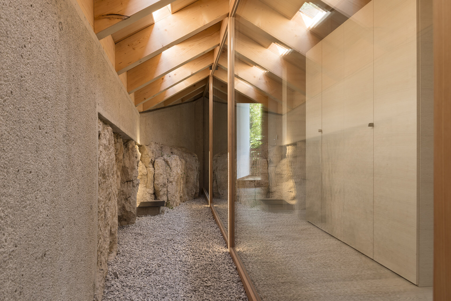 Die Grundrisse folgen den Gegebenheiten der natürlichen Topografie vor Ort. Stimmung und Atmosphäre sind den einzelnen Bauteilen geschuldet, unter Einbeziehung des rohen Felsens in die Innenräume. Von außen kaum wahrnehmbar, bringen hangwärts zusätzliche Verglasungen mehr Tageslicht und Weite ins Gebäude. Eine Besonderheit: Die vertikale Erschließung des Hauses verläuft intern und extern, eine innenliegende Stiege über alle drei Geschoße gab und gibt es nicht. Nun wird die Wegeführung um einen Lift als neue Haupterschließung ergänzt. Eine historische Stiegenanlage, die während des Bauprozesses gefunden wurde, konnte dank Restaurator und Beharrungsvermögen der Bauherrschaft ins Konzept integriert werden.