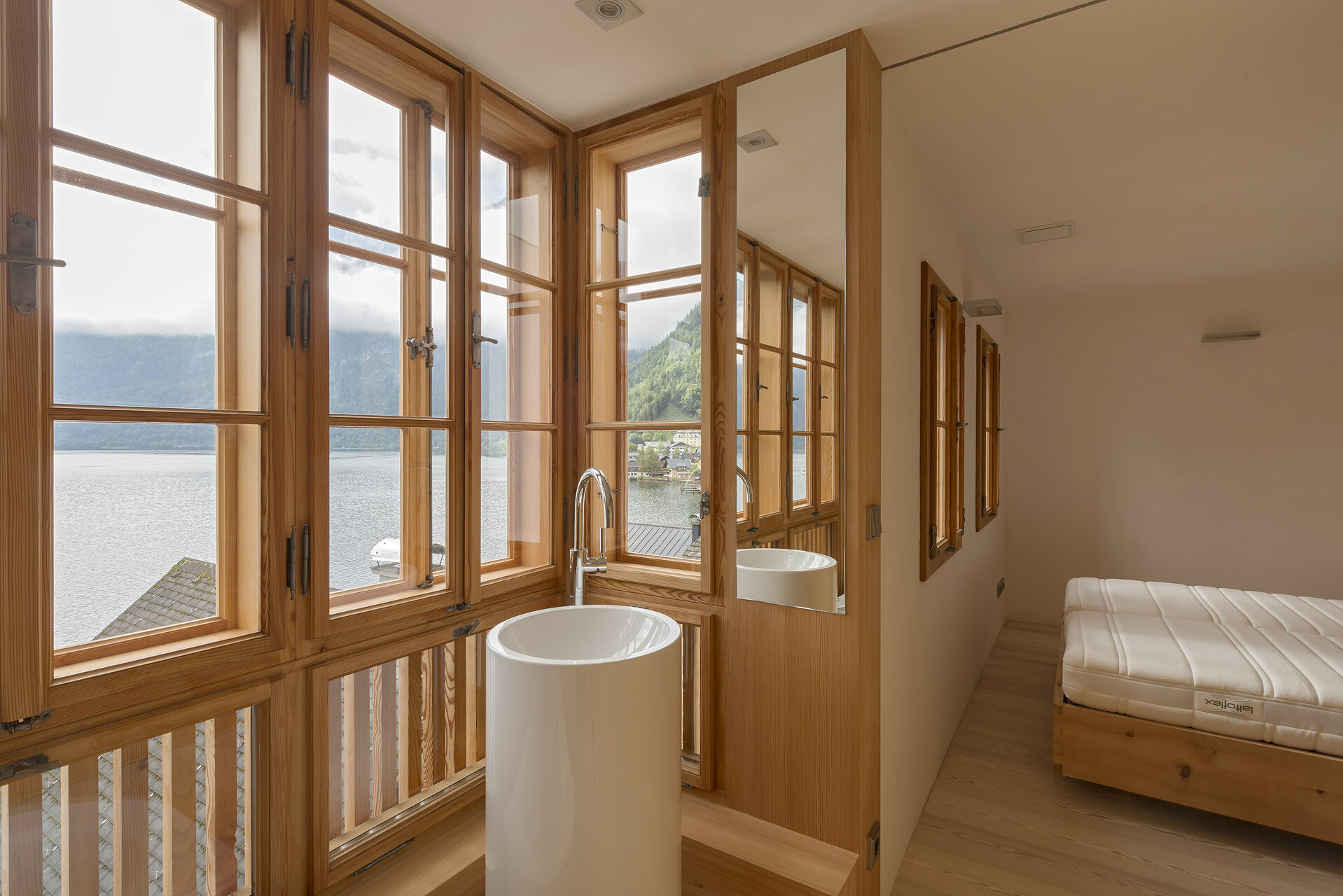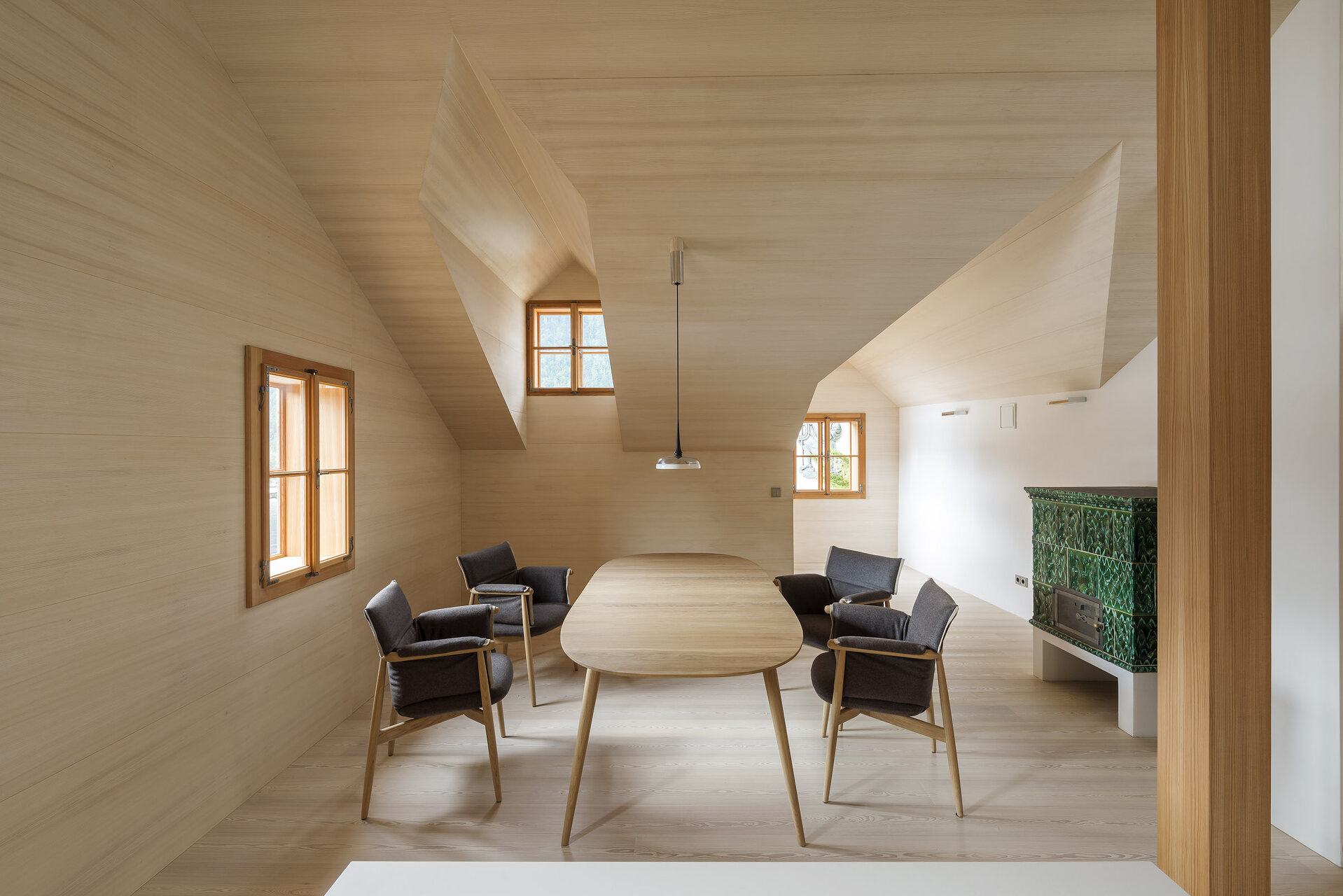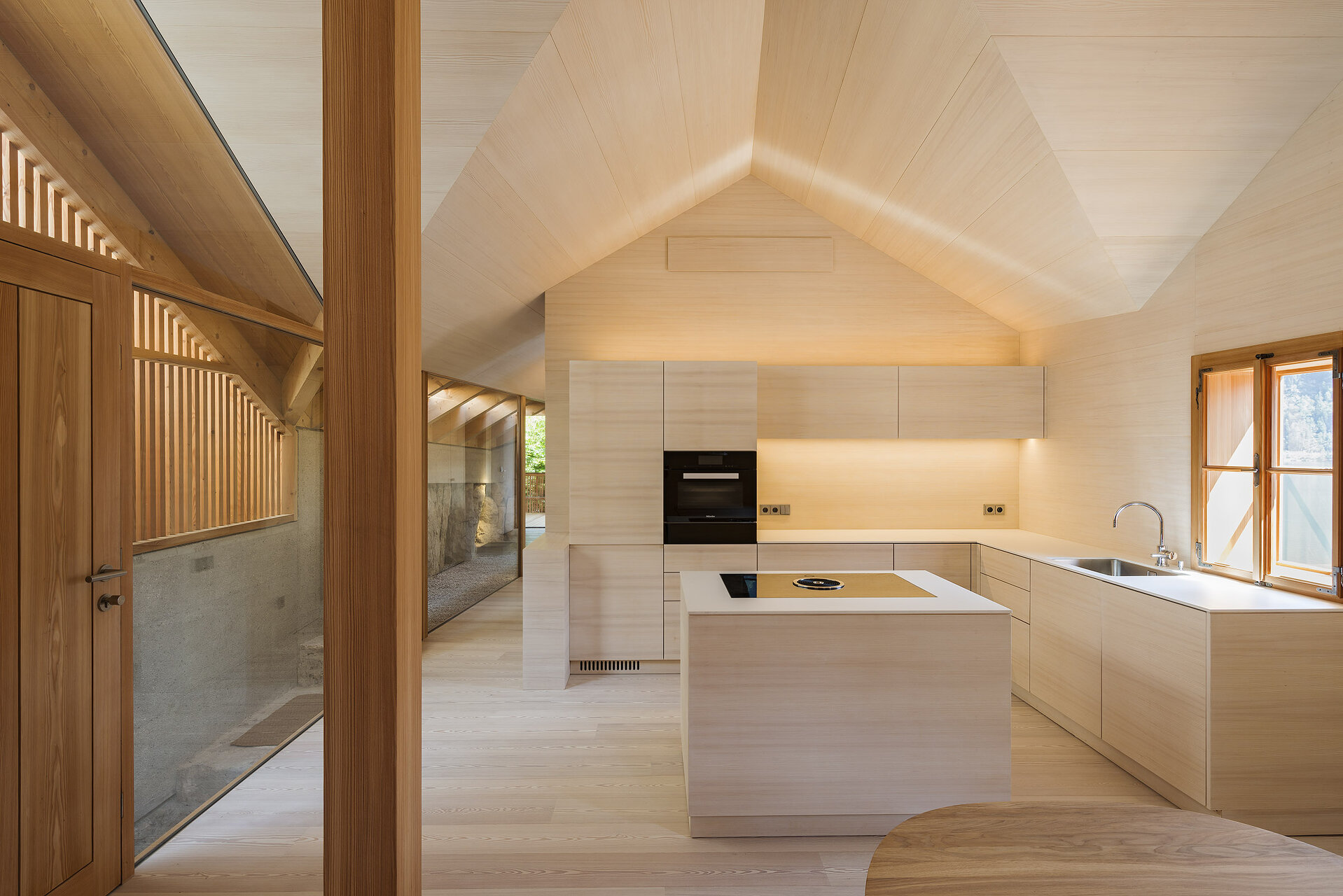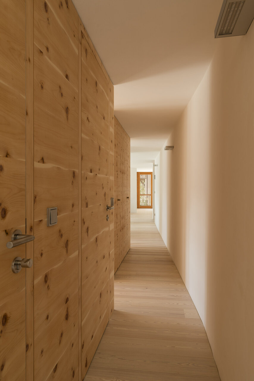 Die Grundrisse folgen den Gegebenheiten der natürlichen Topografie vor Ort. Stimmung und Atmosphäre sind den einzelnen Bauteilen geschuldet, unter Einbeziehung des rohen Felsens in die Innenräume. Von außen kaum wahrnehmbar, bringen hangwärts zusätzliche Verglasungen mehr Tageslicht und Weite ins Gebäude. Eine Besonderheit: Die vertikale Erschließung des Hauses verläuft intern und extern, eine innenliegende Stiege über alle drei Geschoße gab und gibt es nicht. Nun wird die Wegeführung um einen Lift als neue Haupterschließung ergänzt. Eine historische Stiegenanlage, die während des Bauprozesses gefunden wurde, konnte dank Restaurator und Beharrungsvermögen der Bauherrschaft ins Konzept integriert werden.