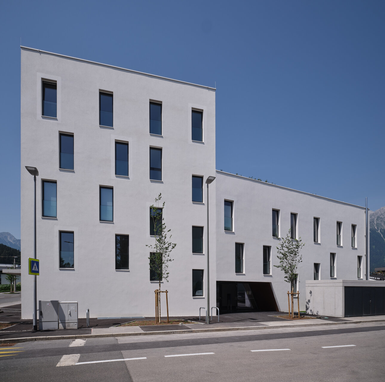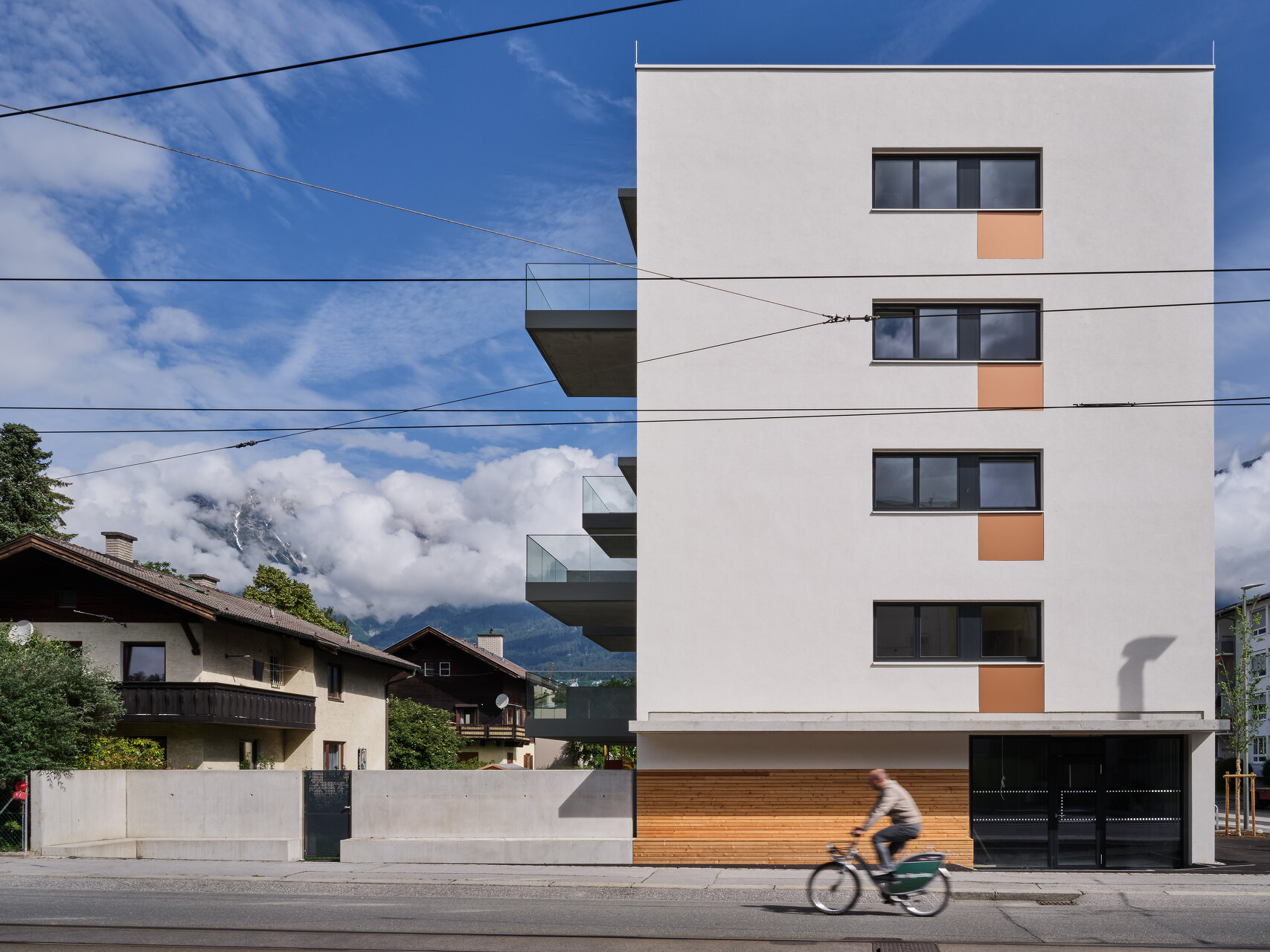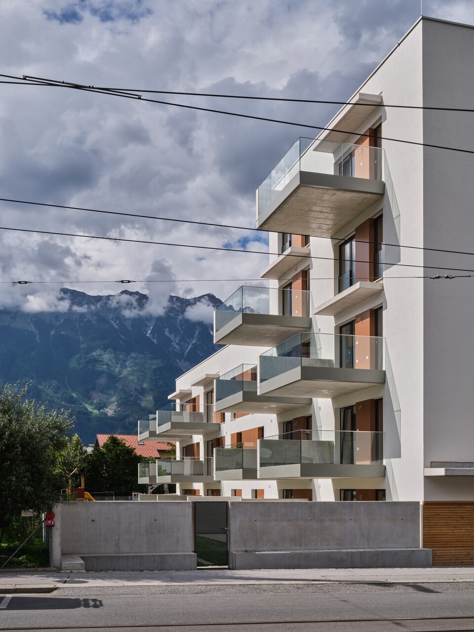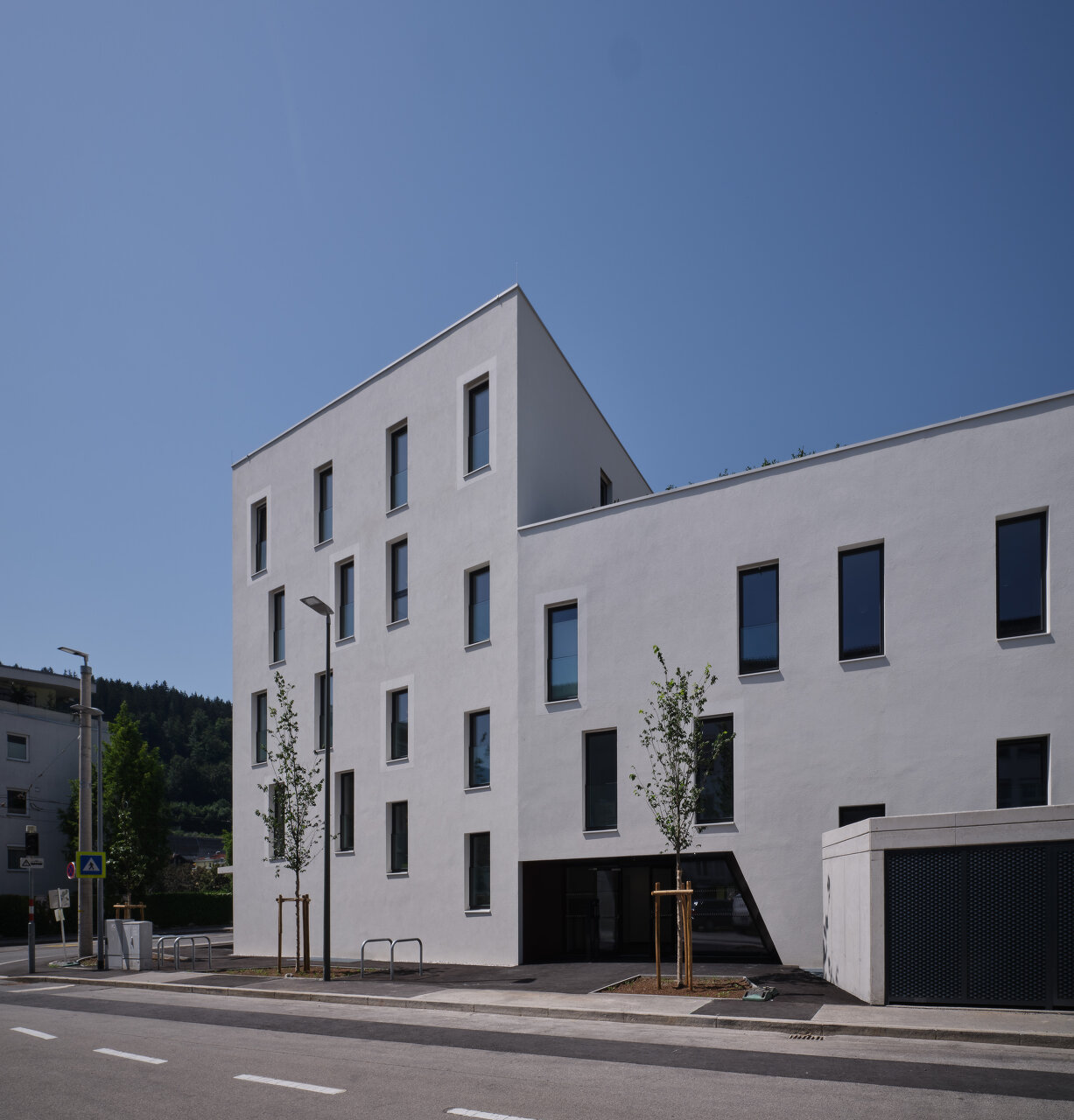 Die leicht abgeschwenkten, den Straßenraum begleitenden Fassaden des Massivbaukörpers prägt eine strukturierte, helle Putzoberfläche mit versetzt angeordneten Fensteröffnungen. Die Gehsteigflächen wurden hier erweitert und zum Teil mit Sitzgelegenheiten ausgestattet, um eine öffentliche Vorplatznutzung zu unterstützen. Richtung Einfamilienhausbebauung im Süd-Westen bestimmen große Fensteröffnungen mit verschiebbaren Beschattungselementen und vorspringende tiefe Balkone das Erscheinungsbild und bieten den insgesamt 14 Wohnungen entsprechen hochwertige Freibereiche. Vorgelagert befindet sich eine gemeinschaftliche Grün- und Freifläche, die durch einen kleinen Niveausprung von den privaten Terrassen und Gärten abgesetzt ist. Auf dem Dach des dreigeschoßigen Gebäudeteils entstand außerdem ein mit Hochbeeten ausgestatteter Gemeinschaftsgarten. (Text: Claudia Wedekind, nach einem Text der Architekt:innen)