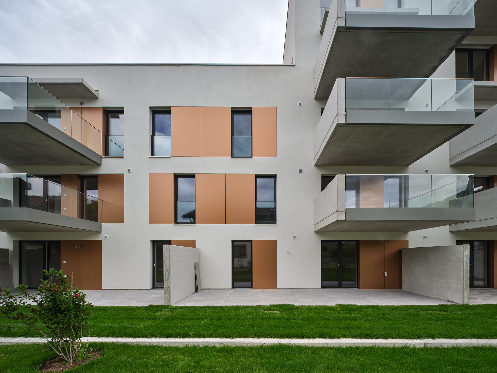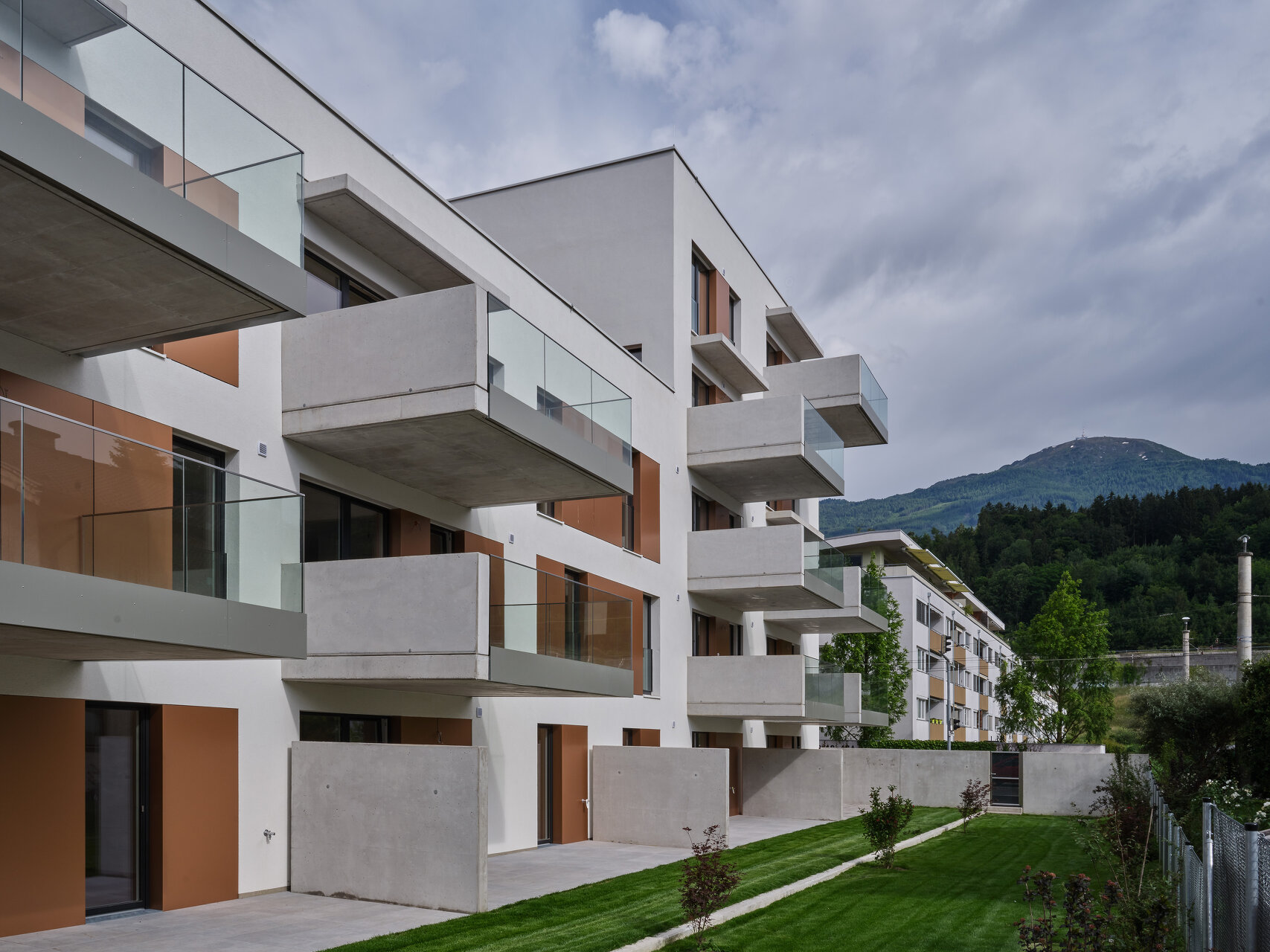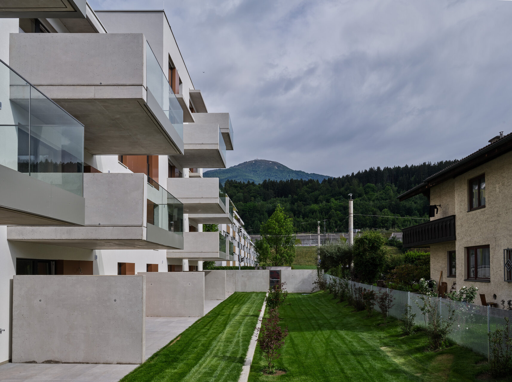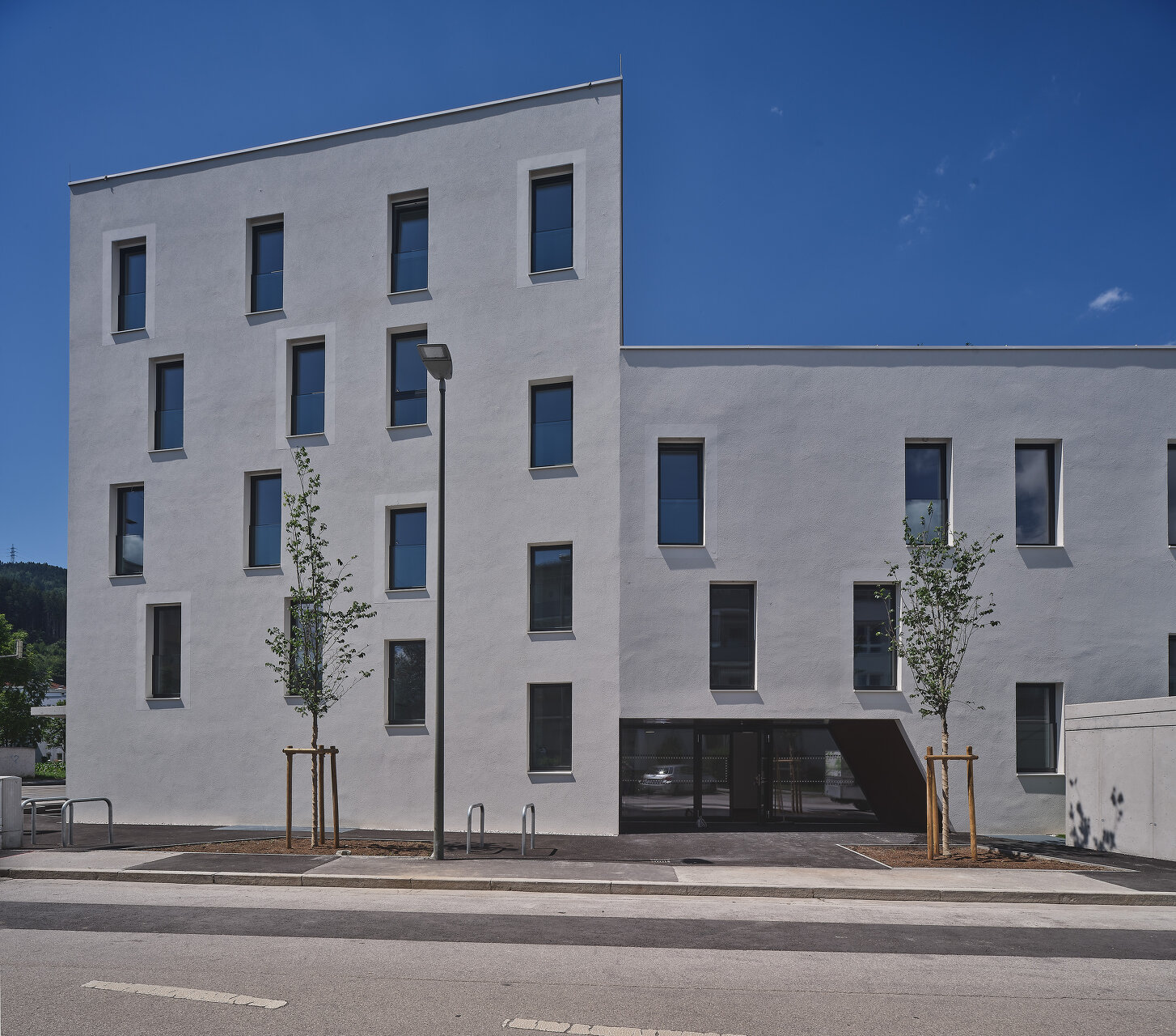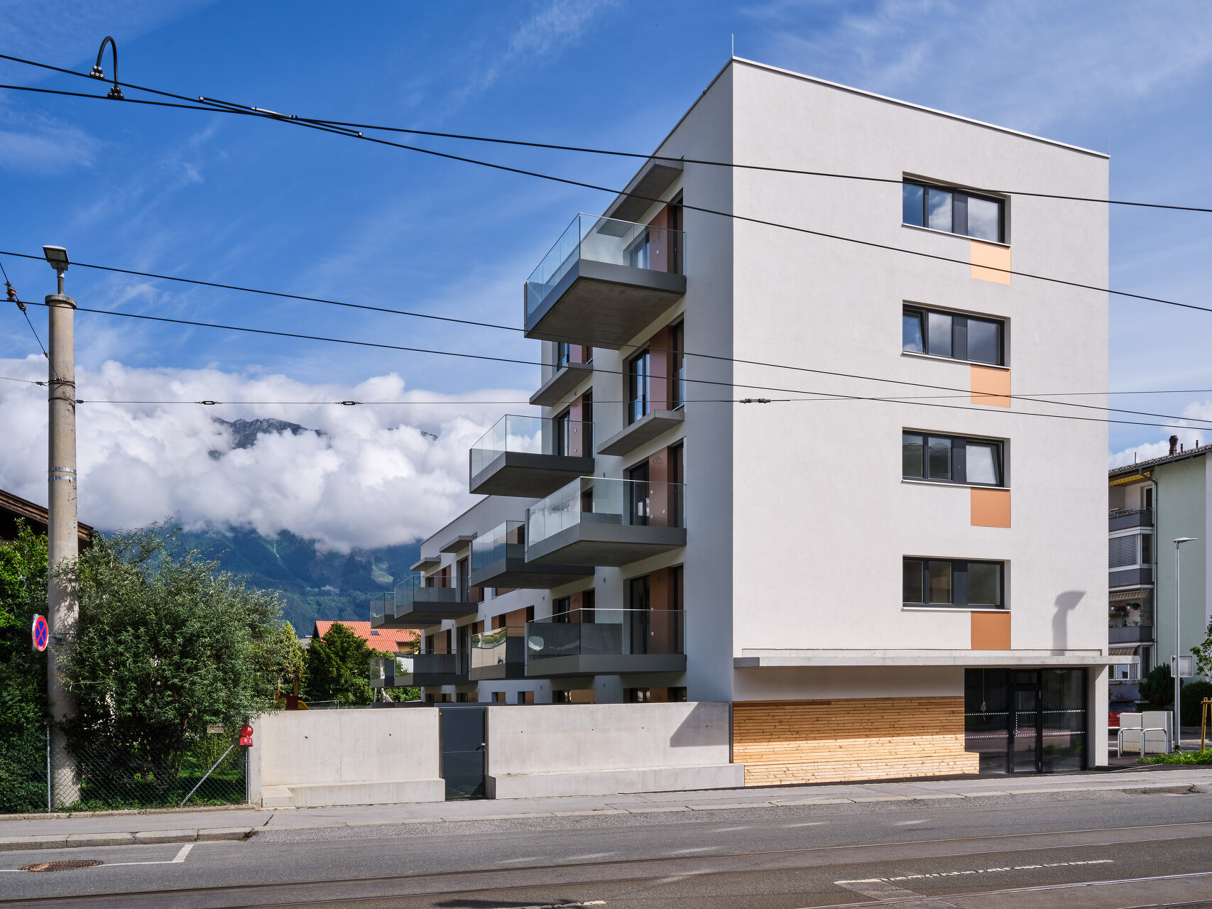 Die leicht abgeschwenkten, den Straßenraum begleitenden Fassaden des Massivbaukörpers prägt eine strukturierte, helle Putzoberfläche mit versetzt angeordneten Fensteröffnungen. Die Gehsteigflächen wurden hier erweitert und zum Teil mit Sitzgelegenheiten ausgestattet, um eine öffentliche Vorplatznutzung zu unterstützen. Richtung Einfamilienhausbebauung im Süd-Westen bestimmen große Fensteröffnungen mit verschiebbaren Beschattungselementen und vorspringende tiefe Balkone das Erscheinungsbild und bieten den insgesamt 14 Wohnungen entsprechen hochwertige Freibereiche. Vorgelagert befindet sich eine gemeinschaftliche Grün- und Freifläche, die durch einen kleinen Niveausprung von den privaten Terrassen und Gärten abgesetzt ist. Auf dem Dach des dreigeschoßigen Gebäudeteils entstand außerdem ein mit Hochbeeten ausgestatteter Gemeinschaftsgarten. (Text: Claudia Wedekind, nach einem Text der Architekt:innen)