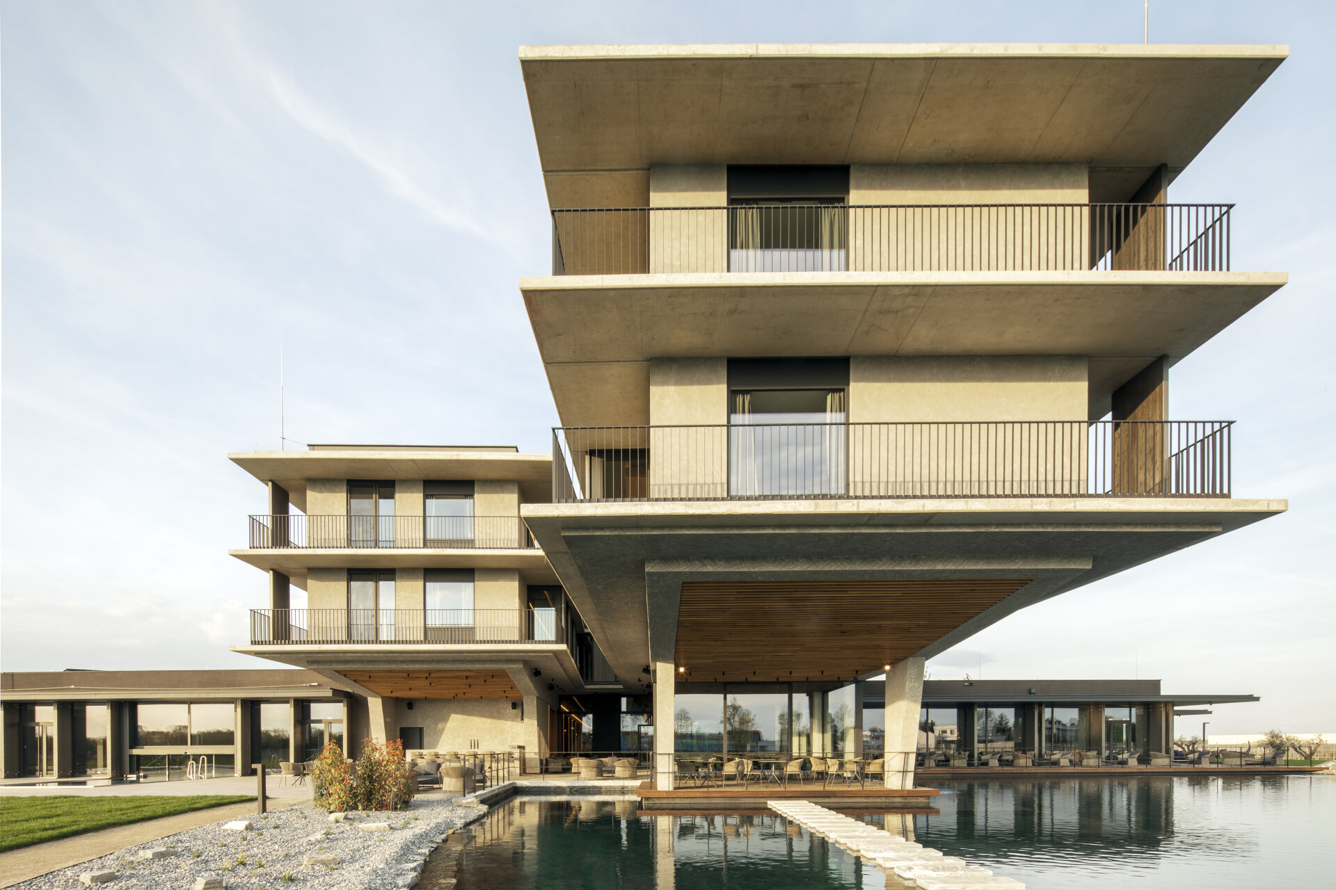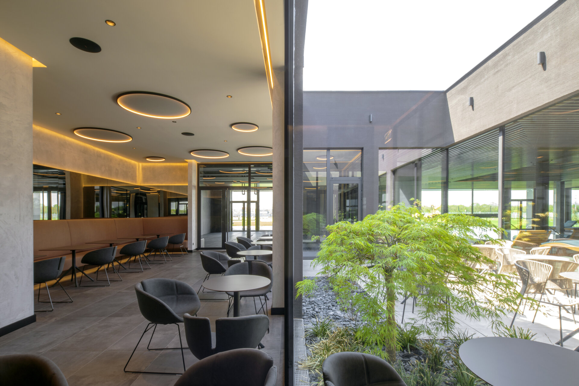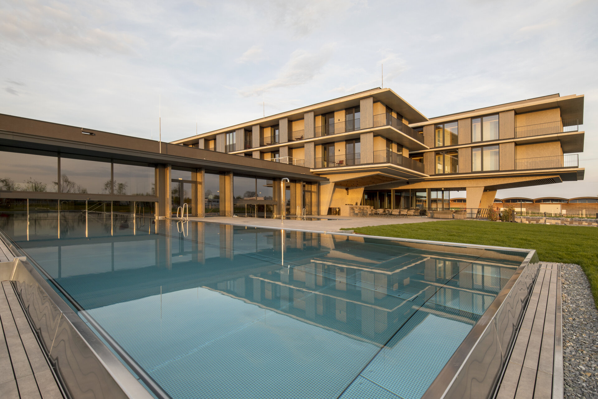 Verstärkt wird die Wirkung eines Dorfplatzes von der grünen Gestaltung und den lebendigen, natürlichen Materialien und Oberflächen. Der ausschließlich für Hotelgäste vorgesehene Bereich überrascht mit ungewöhnlichen, großzügigen Raumhöhen, auch die Sichtachsen ergeben immer wieder andere Perspektiven und damit unterschiedliche räumliche Erlebnisse im Resort. Sowohl im Restaurant als auch am Dorfplatz sind die verschiedenen Zonen und Nischen mit Pflanzen und Bäumen variantenreich ausgestattet. Ein gemeinsam bespielter und lebendiger Dorfplatz. Den jeweiligen funktionalen Bereichen sind wiederum eigene Höfe und Außenräume zugeordnet, die halböffentlich oder privat (Saunahof) genutzt werden können. Die Höfe sind uneinsichtig und windgeschützt und bieten somit ganzjährig nutzbaren Außenraum. Fenster, Schlitze und Einschnitte im Baukörper machen das Innen und Außen von überall erlebbar und belichten und belüften auf natürliche Weise. Der Dorfplatz geht südwestlich in eine Terrasse mit vorgelagertem Naturteich über.