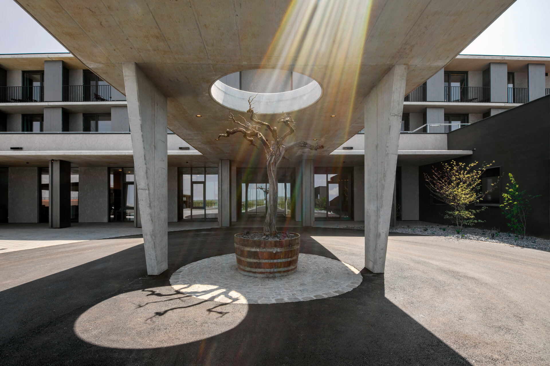 Entlang der nordwestlichen bzw. südöstlichen Grundstücksgrenze schließt ein baumhoher Grünstreifen das Gelände ab. Im Südwesten bzw. am „Kopf“ des Gebäudes soll ein „Steppensee“ in Form eines Zierbeckens das Element Wasser aufnehmen. Rund um das Haus soll eine benutzbare Grünfläche samt Obstbäumen, Ziersträuchern und Kräutergarten entstehen. Der Großteil des Grundstückes soll aber – mit Ausnahme des Kinderspielbereichs samt Spielhügel im nordwestlichen Areal des Hotels – weiterhin als Weinbaufläche genutzt werden. (Text: Architekt, bearbeitet)