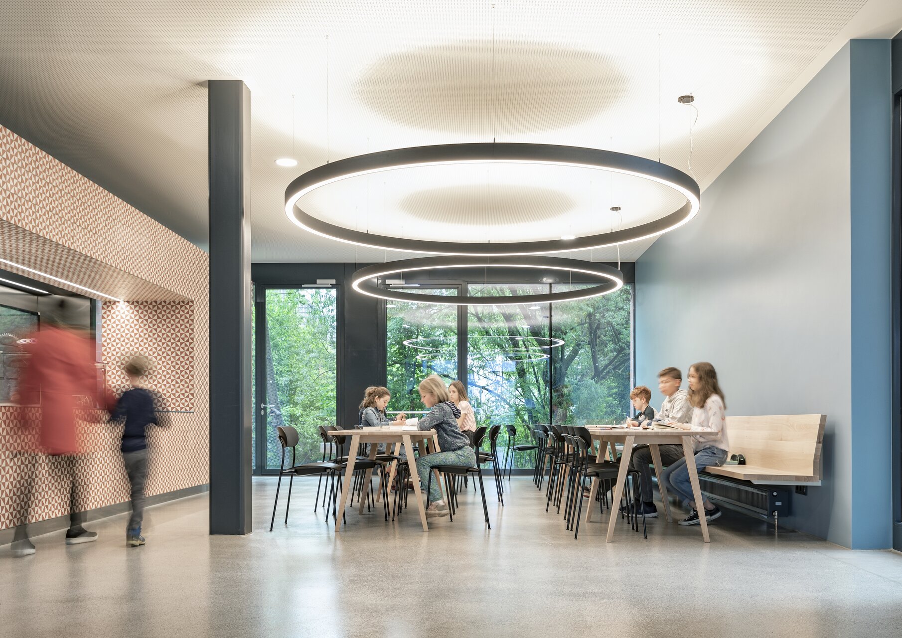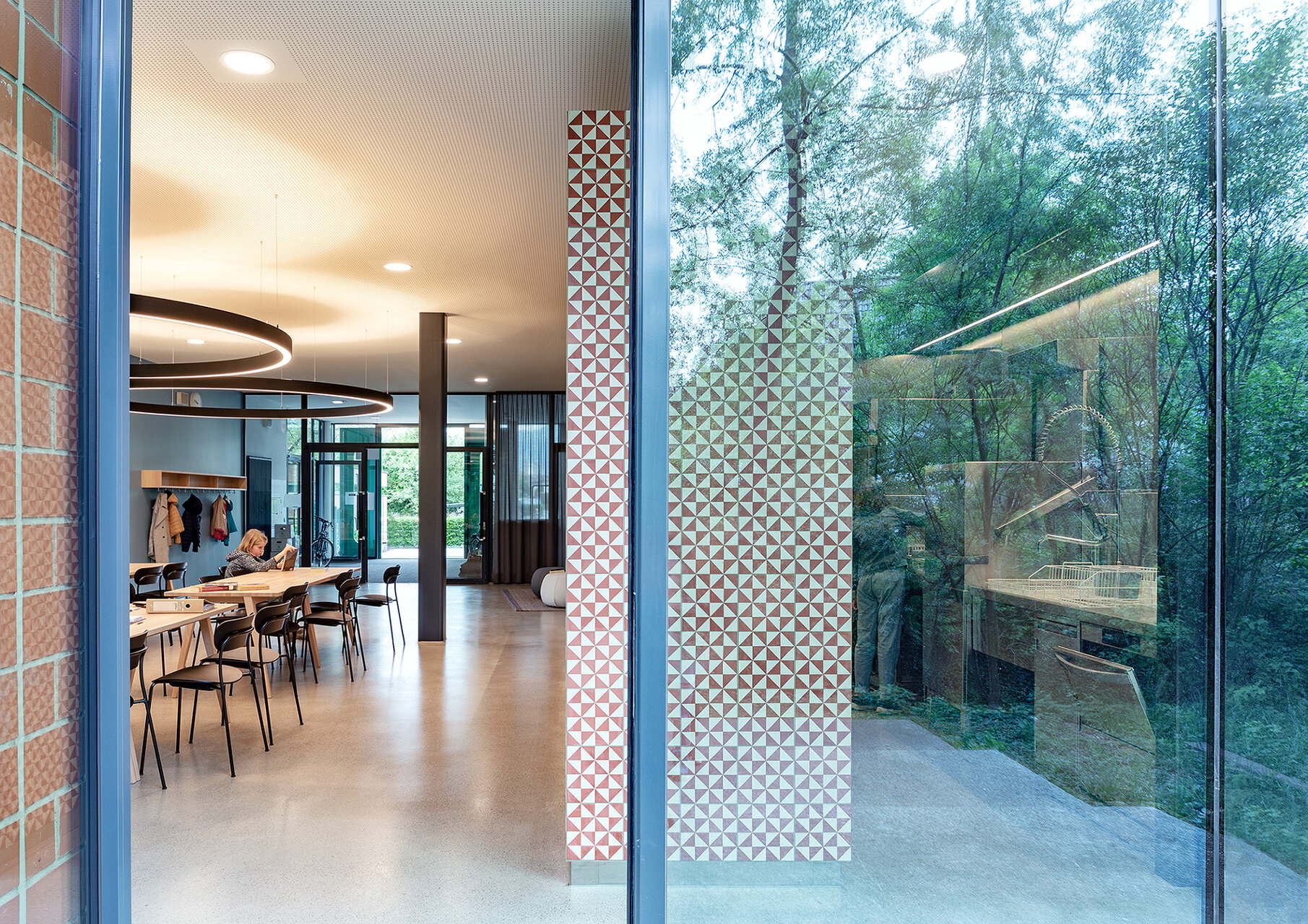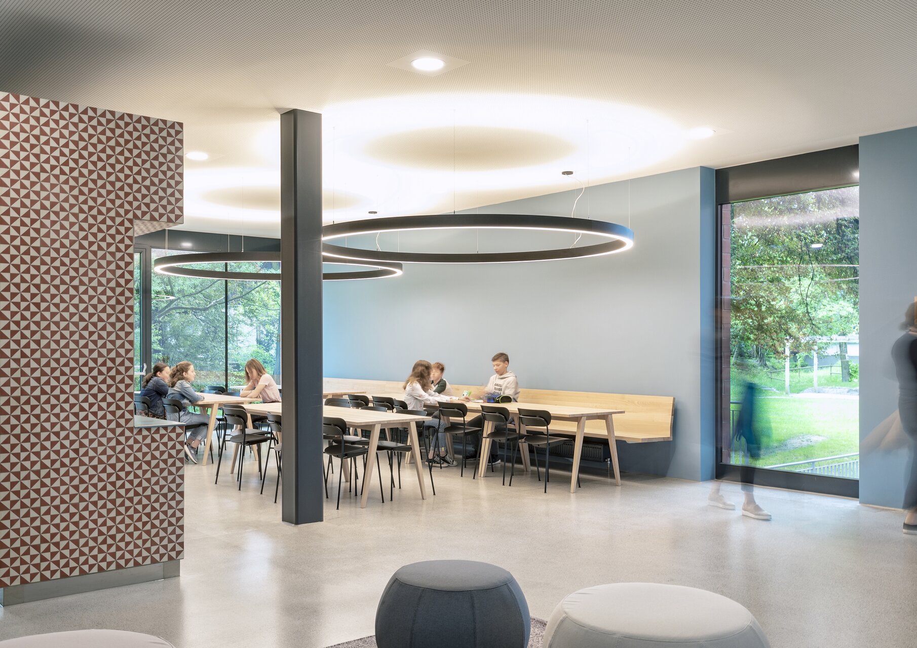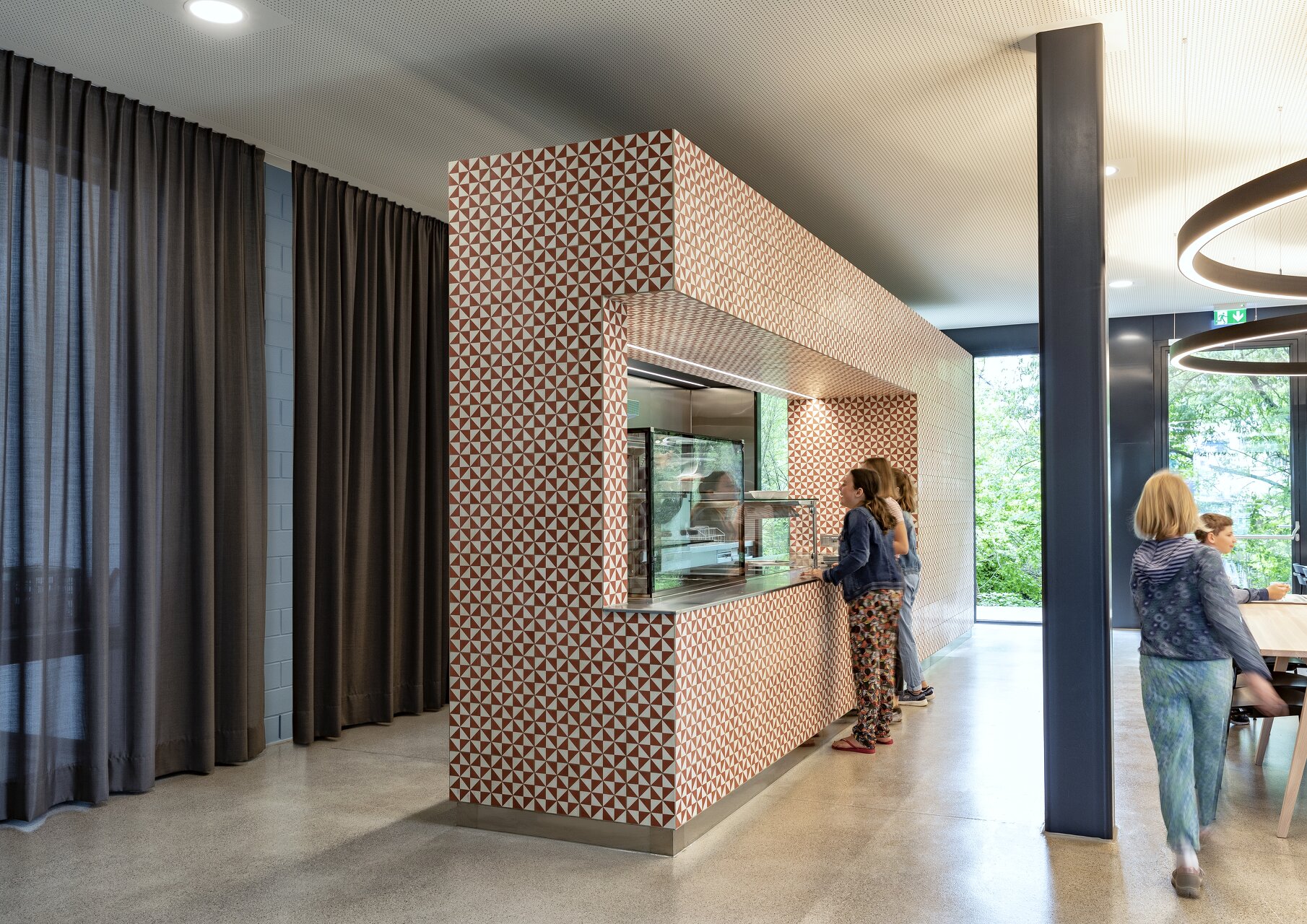 Die Architektur rückt den unmittelbaren Bezug ins Grüne in den Mittelpunkt. Als markantes Element tritt das Thekenmöbel der Küche in Erscheinung, das durch seine Verkleidung mit ornamentalen, rotbraunen Zementfliesen subtil auf den „Grundton“ des Gebäudes mit seinem Sichtziegelmauerwerk referiert. Die Küche wurde für optimale Arbeitsabläufe und nach höchsten hygienischen Standards eingerichtet. Sitzbänke und Tische aus Buchenholz sowie leichte, dunkle Stühle bieten sich zum Essen, Lernen und Spielen an. Diagonal im Raum versetzt, lädt eine Loungeecke zum Lesen und Verweilen ein. Große, ringförmige Beleuchtungskörper, blau getünchte Wände und Vorhänge ergänzen das gestalterische Konzept und tragen zu einer entspannten, wohnlichen Atmosphäre bei. (Text: Tobias Hagleitner, nach einem Text der Architekt:innen)