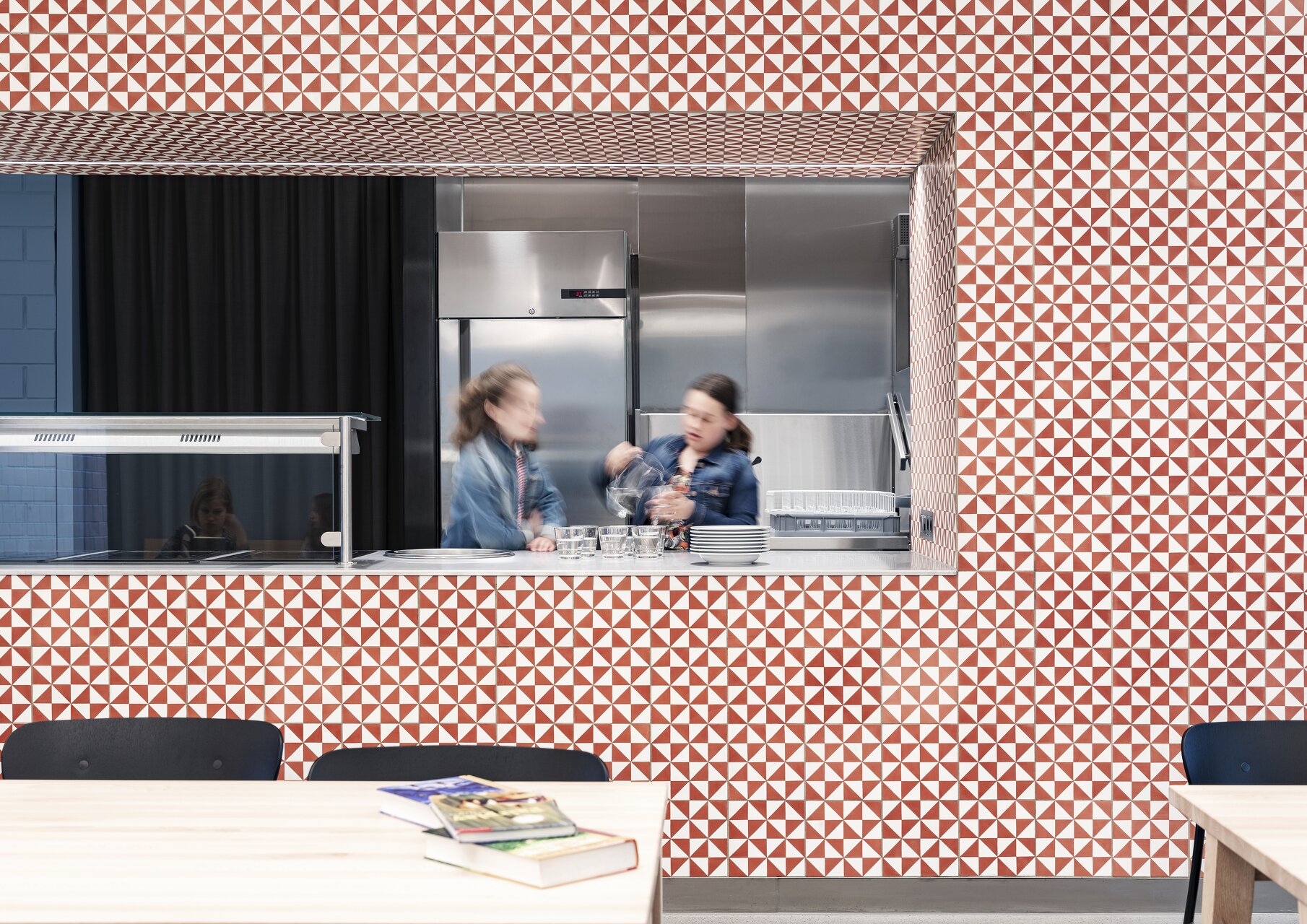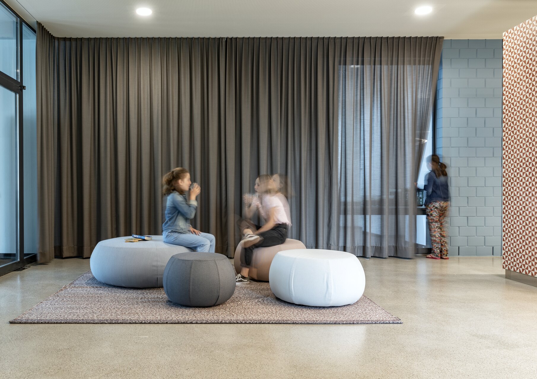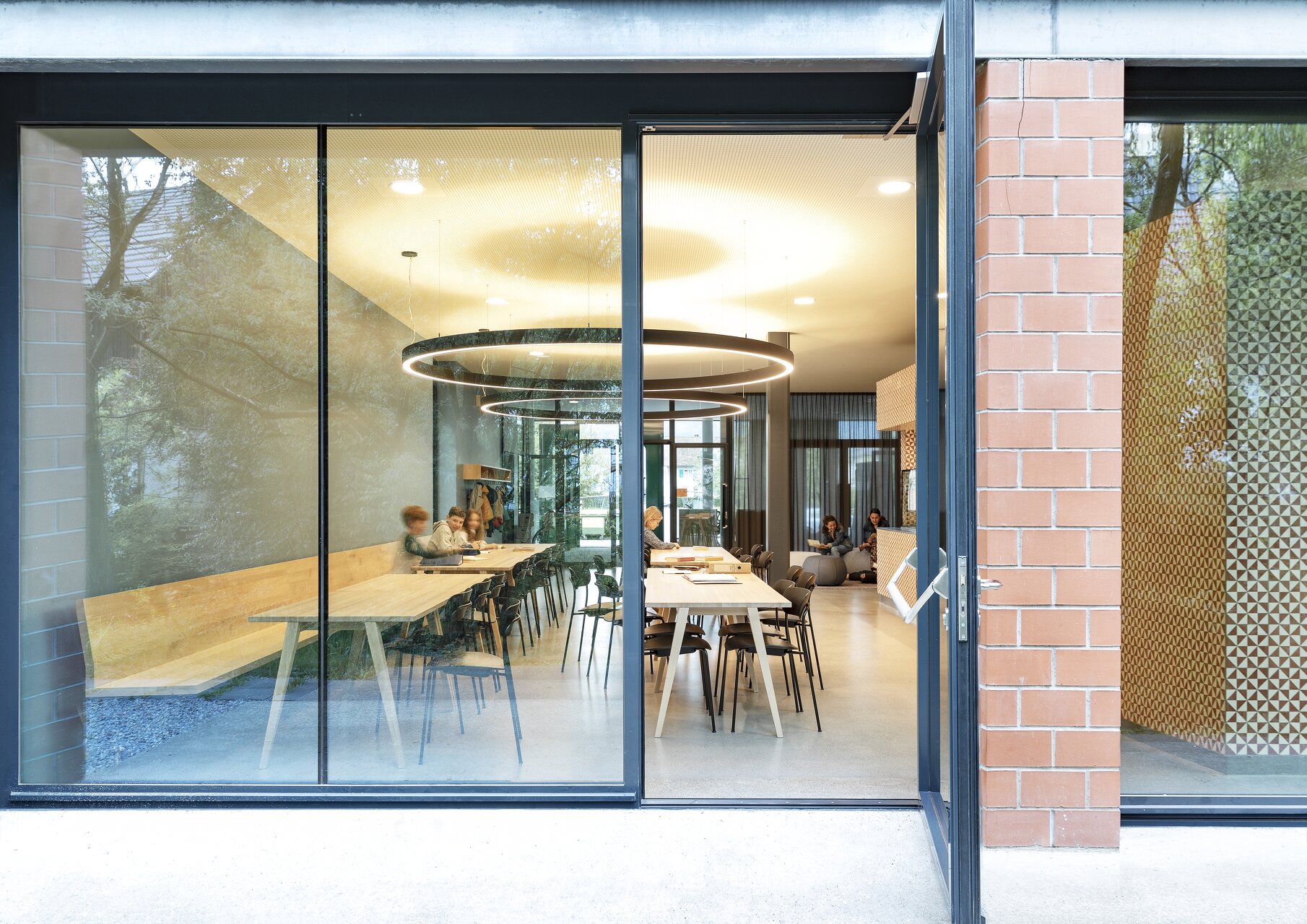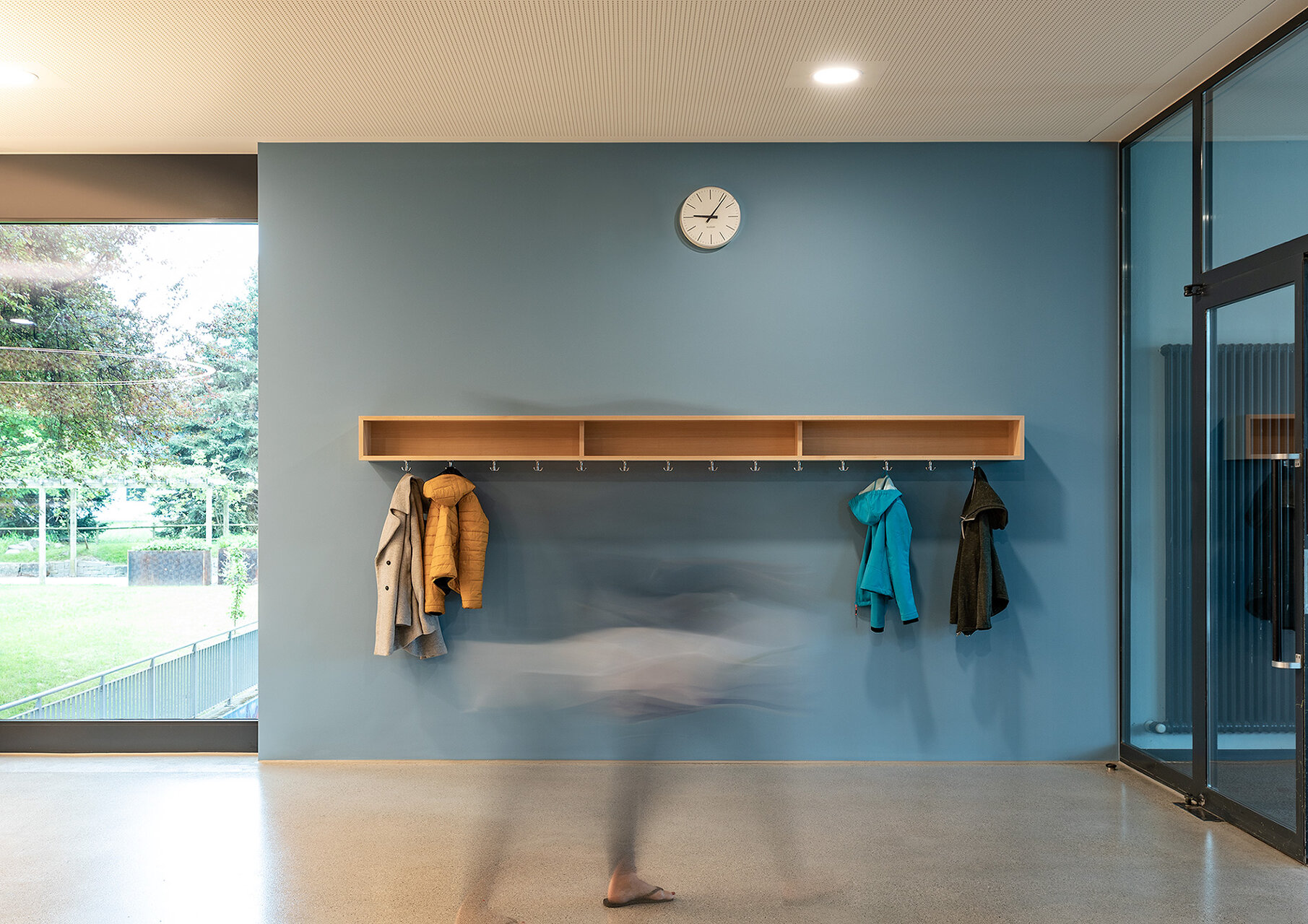 Die Architektur rückt den unmittelbaren Bezug ins Grüne in den Mittelpunkt. Als markantes Element tritt das Thekenmöbel der Küche in Erscheinung, das durch seine Verkleidung mit ornamentalen, rotbraunen Zementfliesen subtil auf den „Grundton“ des Gebäudes mit seinem Sichtziegelmauerwerk referiert. Die Küche wurde für optimale Arbeitsabläufe und nach höchsten hygienischen Standards eingerichtet. Sitzbänke und Tische aus Buchenholz sowie leichte, dunkle Stühle bieten sich zum Essen, Lernen und Spielen an. Diagonal im Raum versetzt, lädt eine Loungeecke zum Lesen und Verweilen ein. Große, ringförmige Beleuchtungskörper, blau getünchte Wände und Vorhänge ergänzen das gestalterische Konzept und tragen zu einer entspannten, wohnlichen Atmosphäre bei. (Text: Tobias Hagleitner, nach einem Text der Architekt:innen)