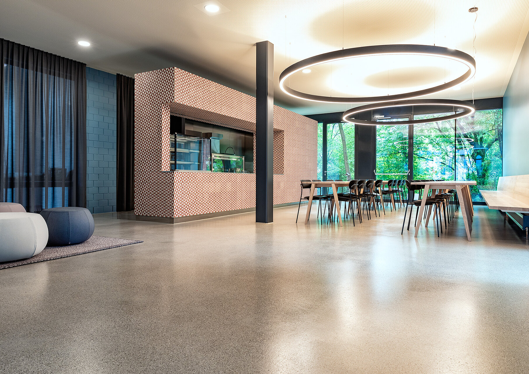 Im Zuge mehrerer Begehungen wurde in unmittelbarer Nähe zum Eingang ein geeigneter Bereich dafür ausgemacht: Der vor einigen Jahren mit einer Verglasung versehene, dennoch wenig genutzte Außenraum in Richtung Grindelbach sollte mit der neuen Nutzung sein eigentliches Potenzial entfalten. Der Raum wurde thermisch saniert und als „Schulcafé“ neu gestaltet. Hier wird gegessen und gechillt, die Loungemöbel auf dem Terrassendeck bieten in der warmen Jahreszeit zusätzliche Aufenthaltsmöglichkeiten im Freien. Der großzügig angelegte Raum kann dank der flexiblen Möblierung auch für Konferenzen, Elternabende und Veranstaltungen genutzt werden oder als Ausweichraum für den Unterricht dienen.