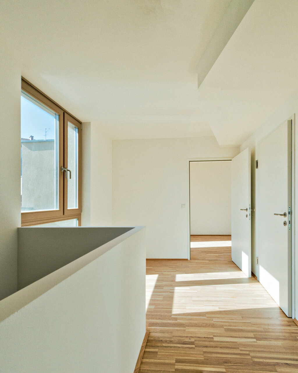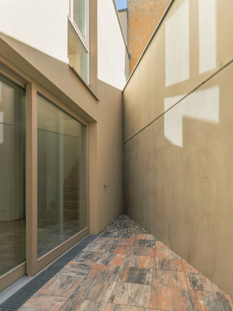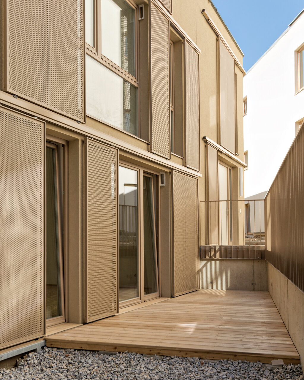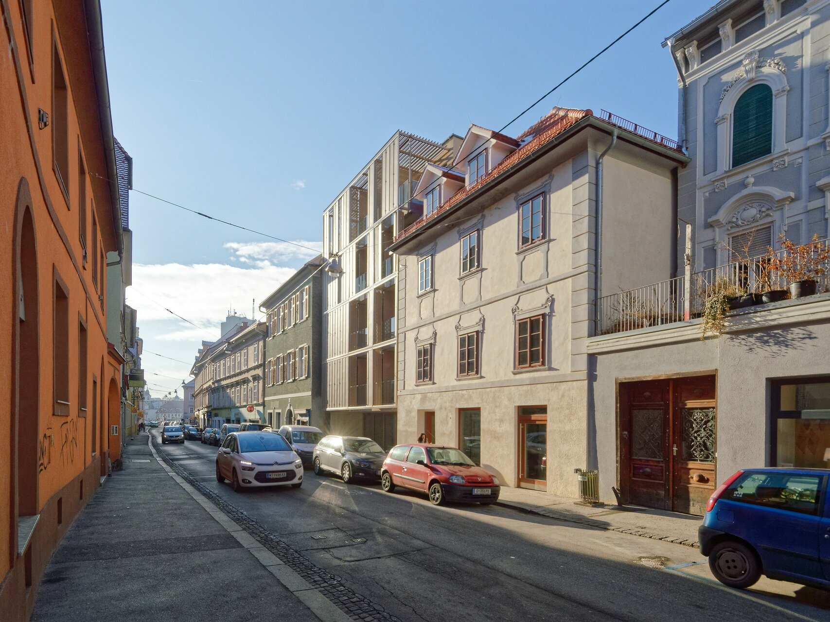 Der Neubau in der Baulücke versteht sich als Pioniergewächs im Stadtteil. Sein Baukörper reflektiert die Umgebung in anderer Form. Lange durchgehende Grundrisse bieten beidseitige Belichtung und Belüftung für ein neues Wohnen. Zur Gasse springt der Bau, ähnlich wie beim Nachbarn, zurück und nimmt neue Loggien auf. Diese grenzen sich mit perforierten, stählernen Lamellen, dreh- und verschiebbar, zum Stadtraum ab. Die Bewohner bestimmen über das Öffnen der Elemente selbst das Maß der Interaktion zwischen privatem und öffentlichem Raum. Im denkmalgeschützten Objekt wird mit dem gleichen Konzept die historische Struktur neu verknüpft. Die kleinen Reihenhäuser im Hof, frei vor der Feuerwand des Nachbarn, sind ebenfalls beidseitig belichtet und bilden jeweils ein privates Atrium aus. Alle 23 Wohnungen haben eine eigene Freifläche. Es wird bewusst keine gängige Symbolik des Wohnens angewendet, sondern ein urbanes Zielpublikum angesprochen. Im beengten Stadtraum entsteht so luftiges, offenes Wohnen.
