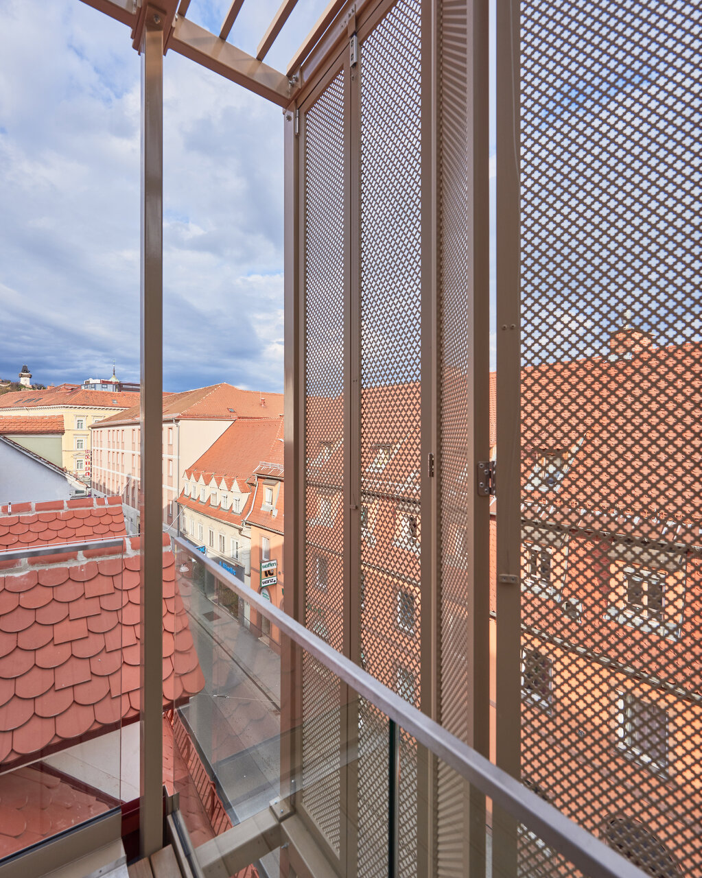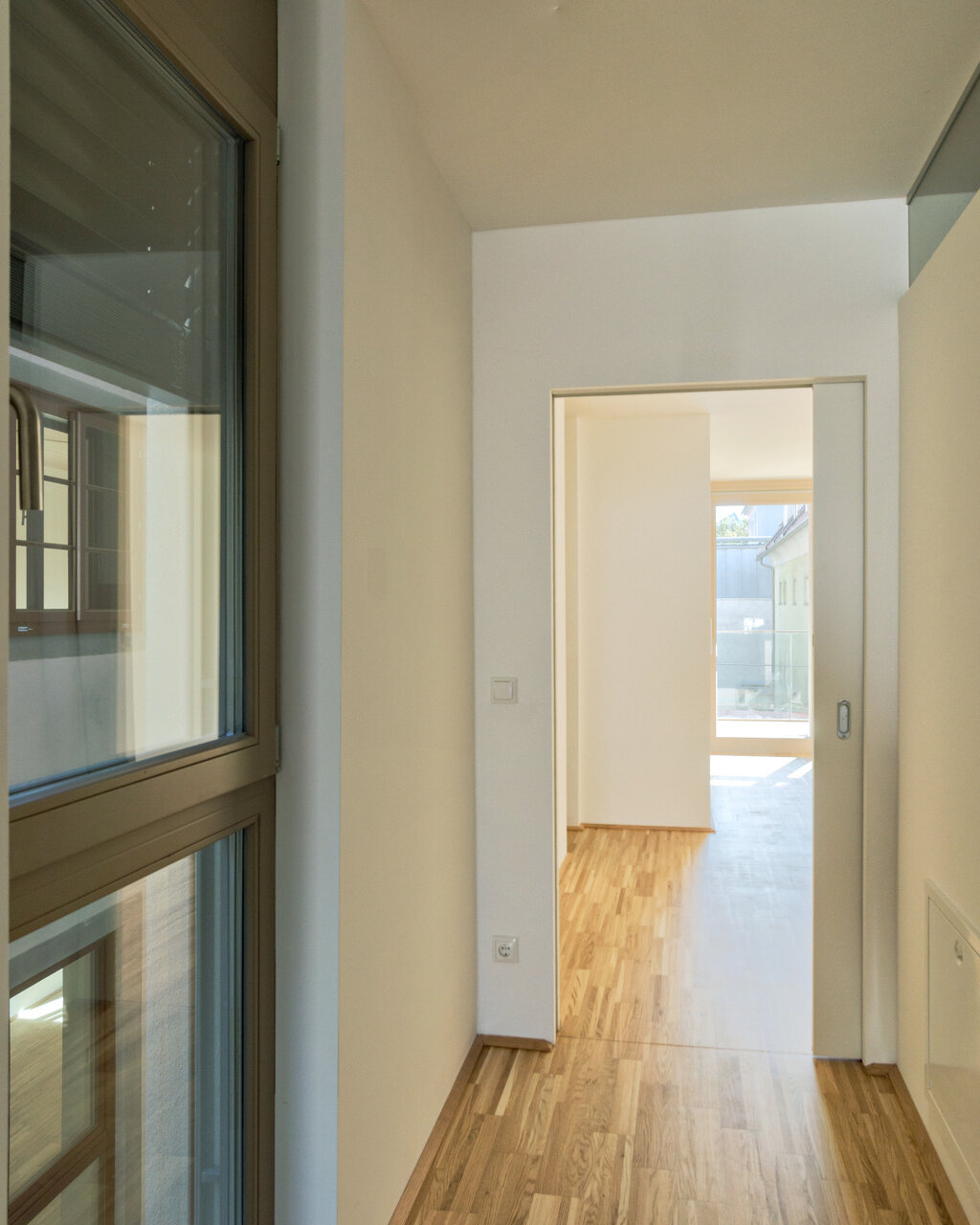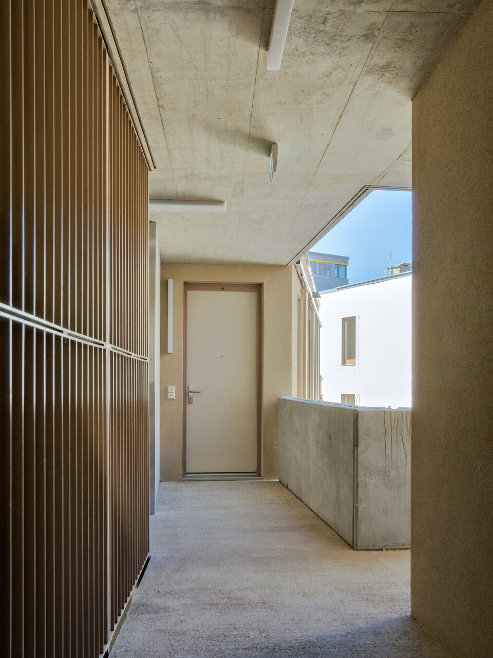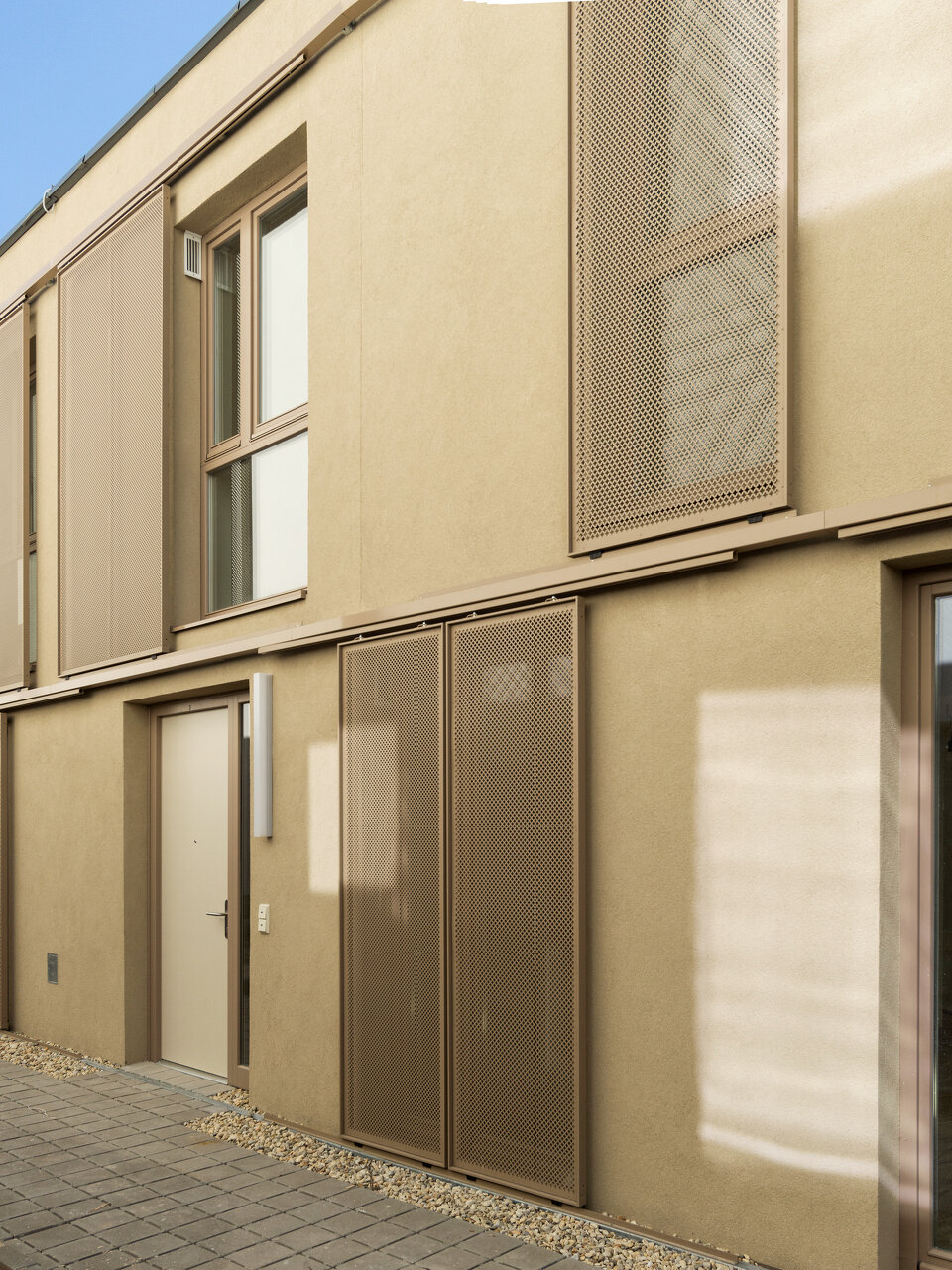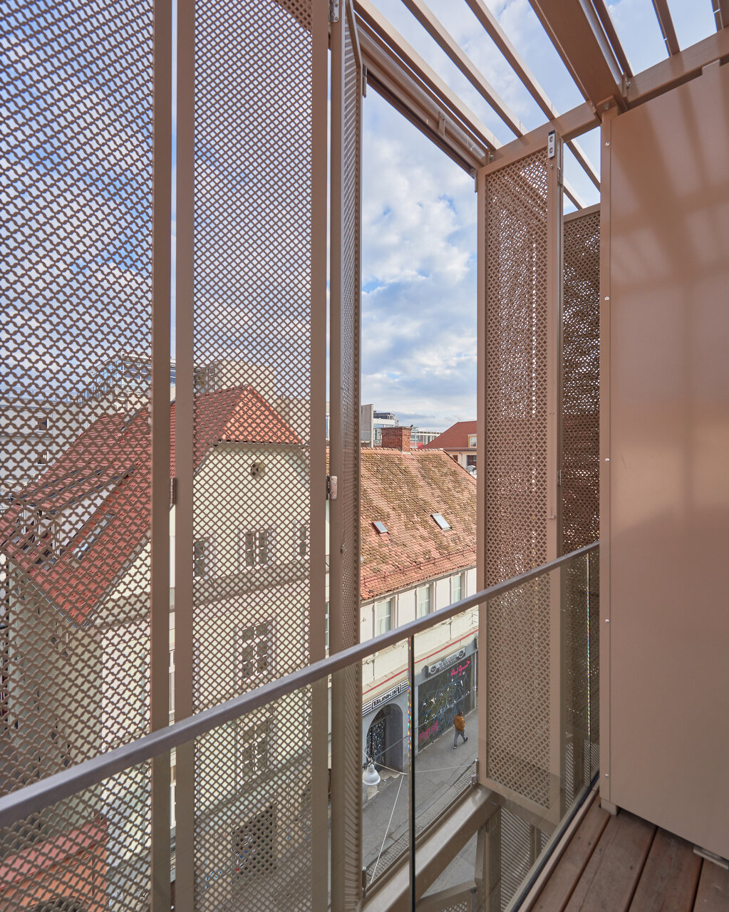 Der Neubau in der Baulücke versteht sich als Pioniergewächs im Stadtteil. Sein Baukörper reflektiert die Umgebung in anderer Form. Lange durchgehende Grundrisse bieten beidseitige Belichtung und Belüftung für ein neues Wohnen. Zur Gasse springt der Bau, ähnlich wie beim Nachbarn, zurück und nimmt neue Loggien auf. Diese grenzen sich mit perforierten, stählernen Lamellen, dreh- und verschiebbar, zum Stadtraum ab. Die Bewohner bestimmen über das Öffnen der Elemente selbst das Maß der Interaktion zwischen privatem und öffentlichem Raum. Im denkmalgeschützten Objekt wird mit dem gleichen Konzept die historische Struktur neu verknüpft. Die kleinen Reihenhäuser im Hof, frei vor der Feuerwand des Nachbarn, sind ebenfalls beidseitig belichtet und bilden jeweils ein privates Atrium aus. Alle 23 Wohnungen haben eine eigene Freifläche. Es wird bewusst keine gängige Symbolik des Wohnens angewendet, sondern ein urbanes Zielpublikum angesprochen. Im beengten Stadtraum entsteht so luftiges, offenes Wohnen.