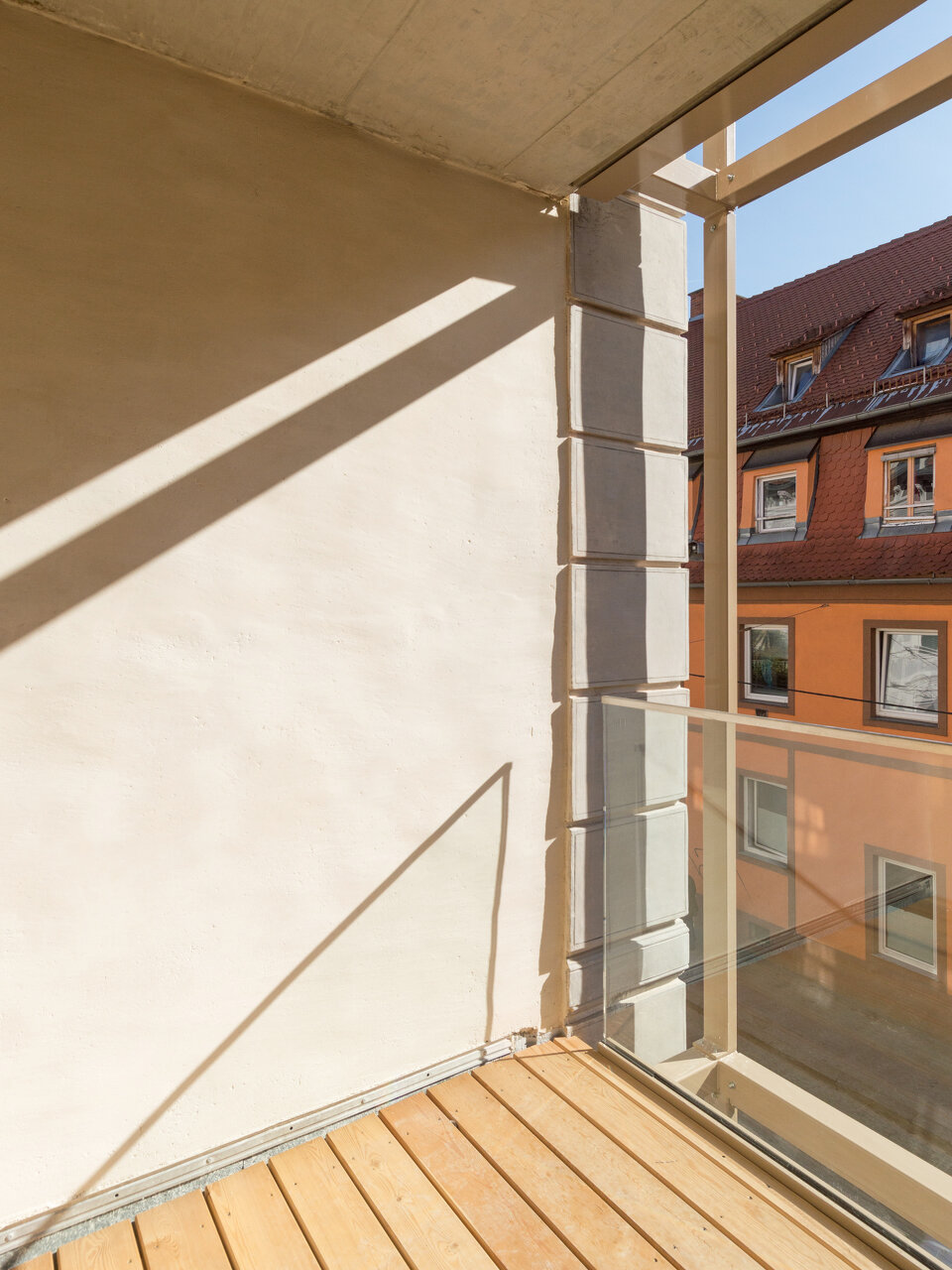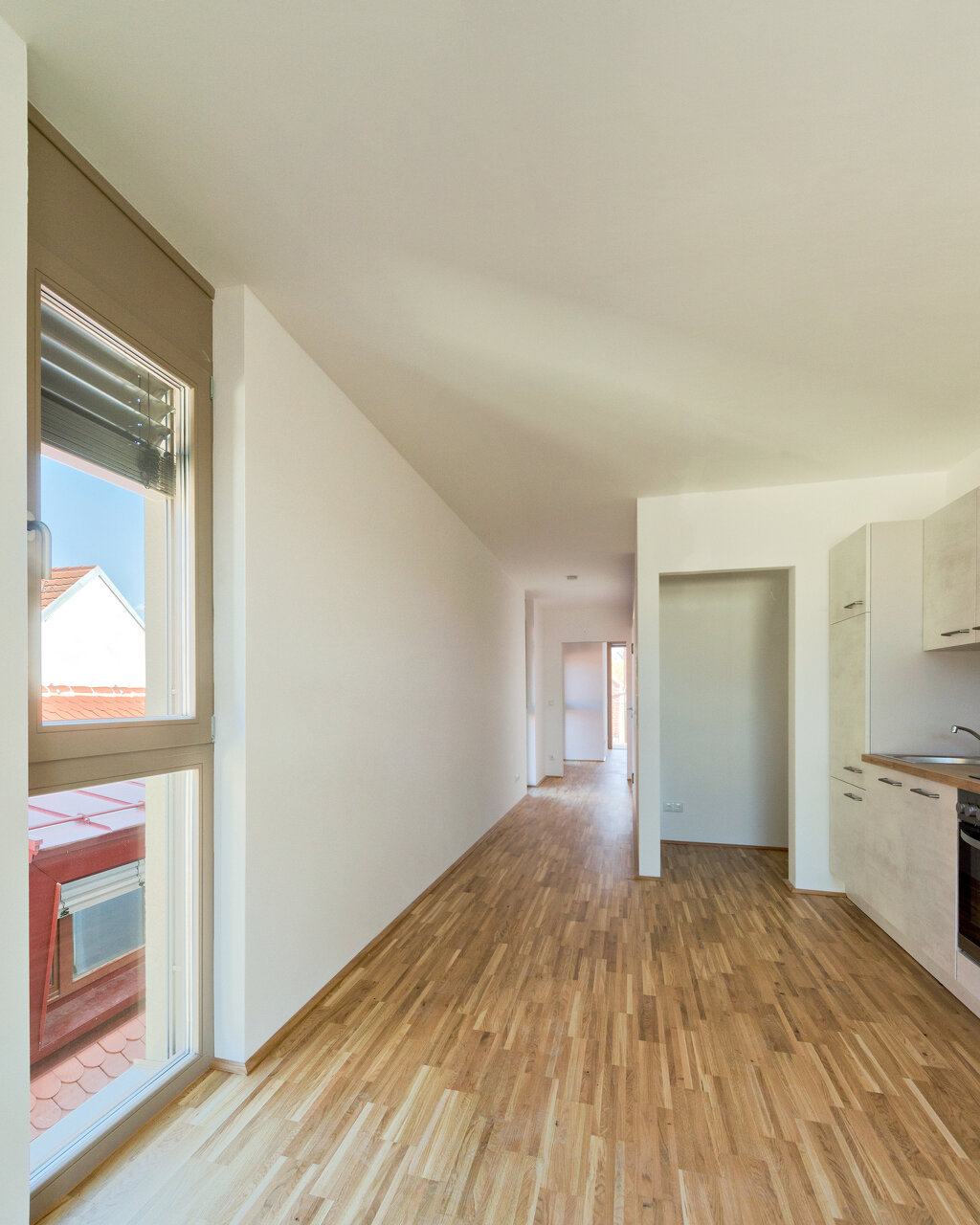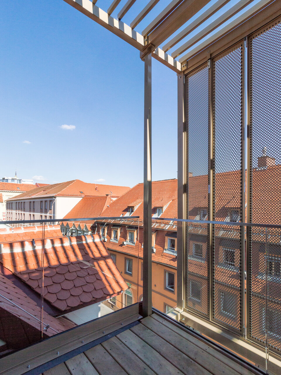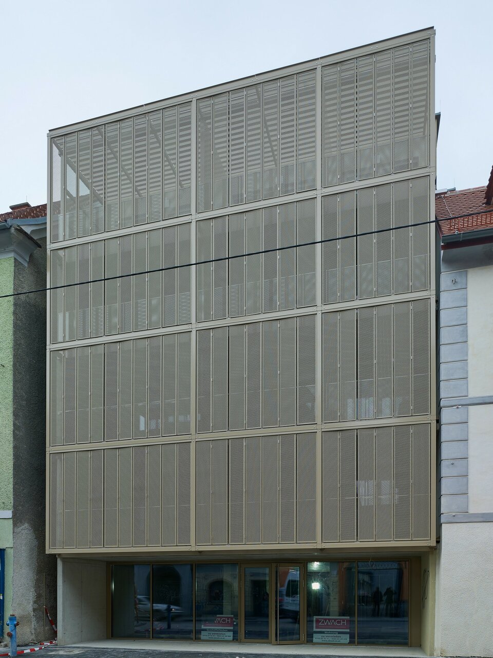 Der Neubau in der Baulücke versteht sich als Pioniergewächs im Stadtteil. Sein Baukörper reflektiert die Umgebung in anderer Form. Lange durchgehende Grundrisse bieten beidseitige Belichtung und Belüftung für ein neues Wohnen. Zur Gasse springt der Bau, ähnlich wie beim Nachbarn, zurück und nimmt neue Loggien auf. Diese grenzen sich mit perforierten, stählernen Lamellen, dreh- und verschiebbar, zum Stadtraum ab. Die Bewohner bestimmen über das Öffnen der Elemente selbst das Maß der Interaktion zwischen privatem und öffentlichem Raum. Im denkmalgeschützten Objekt wird mit dem gleichen Konzept die historische Struktur neu verknüpft. Die kleinen Reihenhäuser im Hof, frei vor der Feuerwand des Nachbarn, sind ebenfalls beidseitig belichtet und bilden jeweils ein privates Atrium aus. Alle 23 Wohnungen haben eine eigene Freifläche. Es wird bewusst keine gängige Symbolik des Wohnens angewendet, sondern ein urbanes Zielpublikum angesprochen. Im beengten Stadtraum entsteht so luftiges, offenes Wohnen.