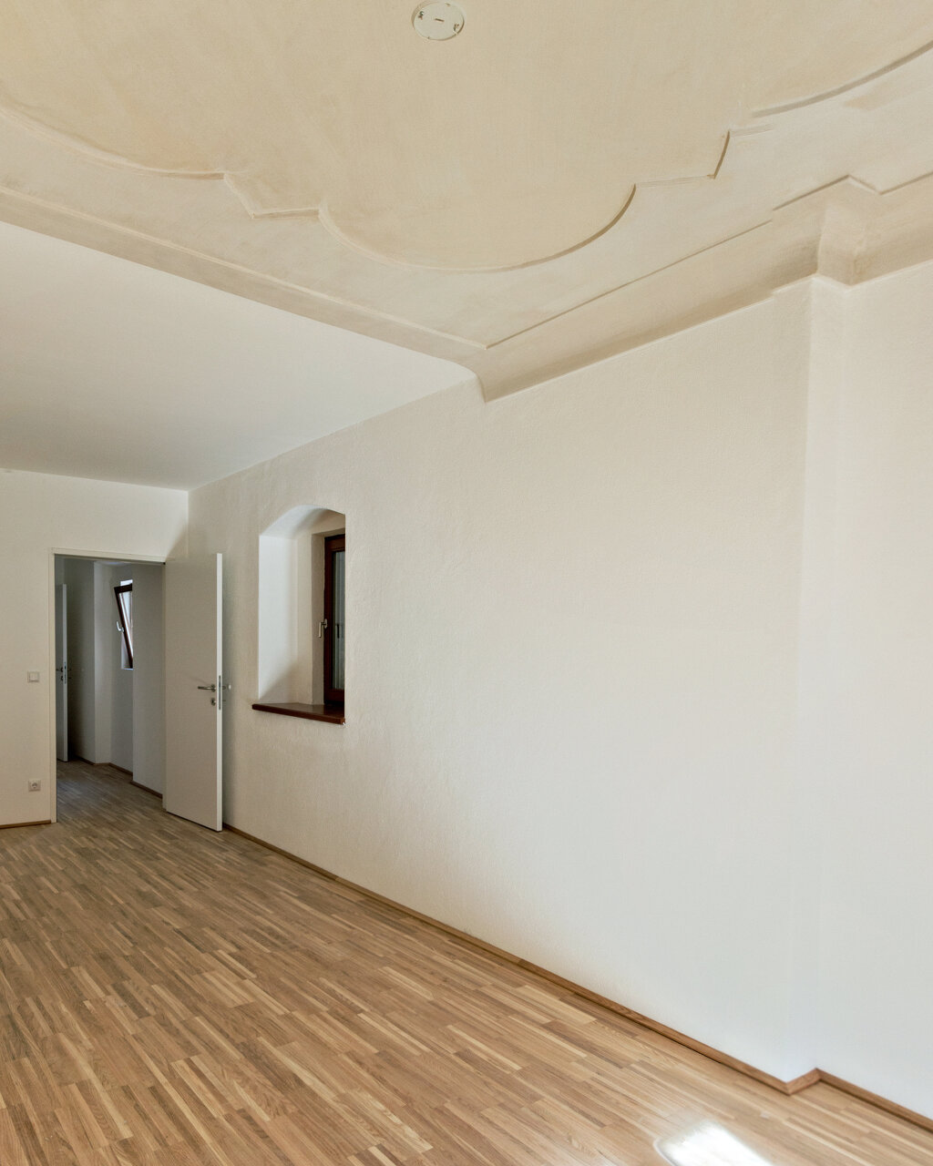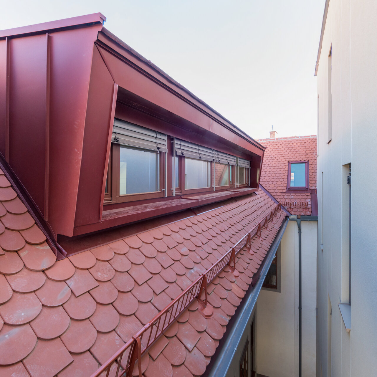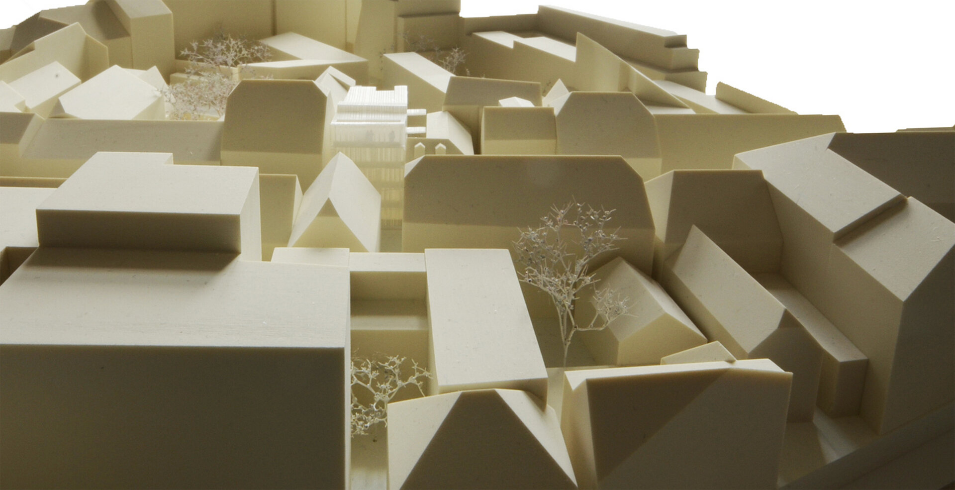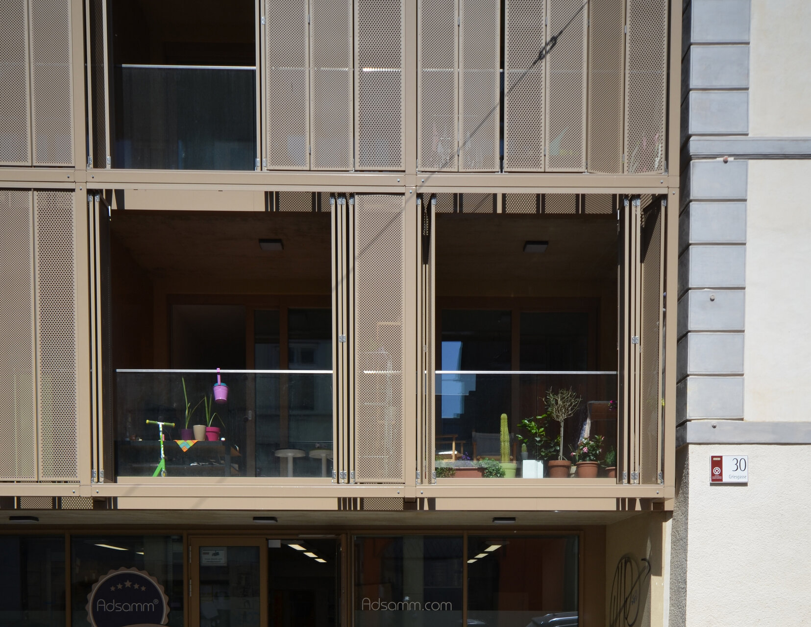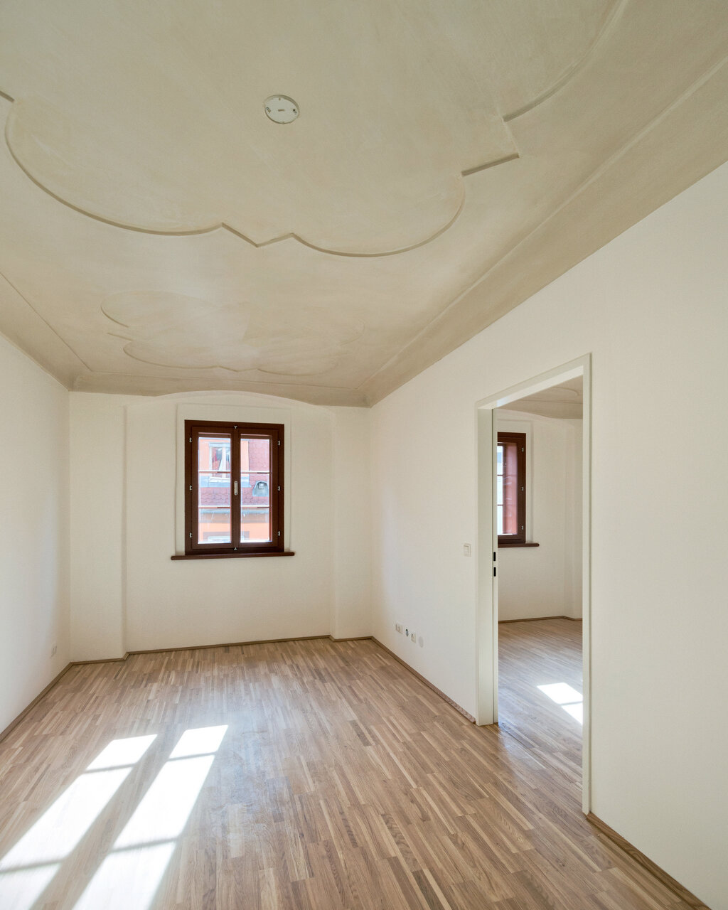 Der Neubau in der Baulücke versteht sich als Pioniergewächs im Stadtteil. Sein Baukörper reflektiert die Umgebung in anderer Form. Lange durchgehende Grundrisse bieten beidseitige Belichtung und Belüftung für ein neues Wohnen. Zur Gasse springt der Bau, ähnlich wie beim Nachbarn, zurück und nimmt neue Loggien auf. Diese grenzen sich mit perforierten, stählernen Lamellen, dreh- und verschiebbar, zum Stadtraum ab. Die Bewohner bestimmen über das Öffnen der Elemente selbst das Maß der Interaktion zwischen privatem und öffentlichem Raum. Im denkmalgeschützten Objekt wird mit dem gleichen Konzept die historische Struktur neu verknüpft. Die kleinen Reihenhäuser im Hof, frei vor der Feuerwand des Nachbarn, sind ebenfalls beidseitig belichtet und bilden jeweils ein privates Atrium aus. Alle 23 Wohnungen haben eine eigene Freifläche. Es wird bewusst keine gängige Symbolik des Wohnens angewendet, sondern ein urbanes Zielpublikum angesprochen. Im beengten Stadtraum entsteht so luftiges, offenes Wohnen.