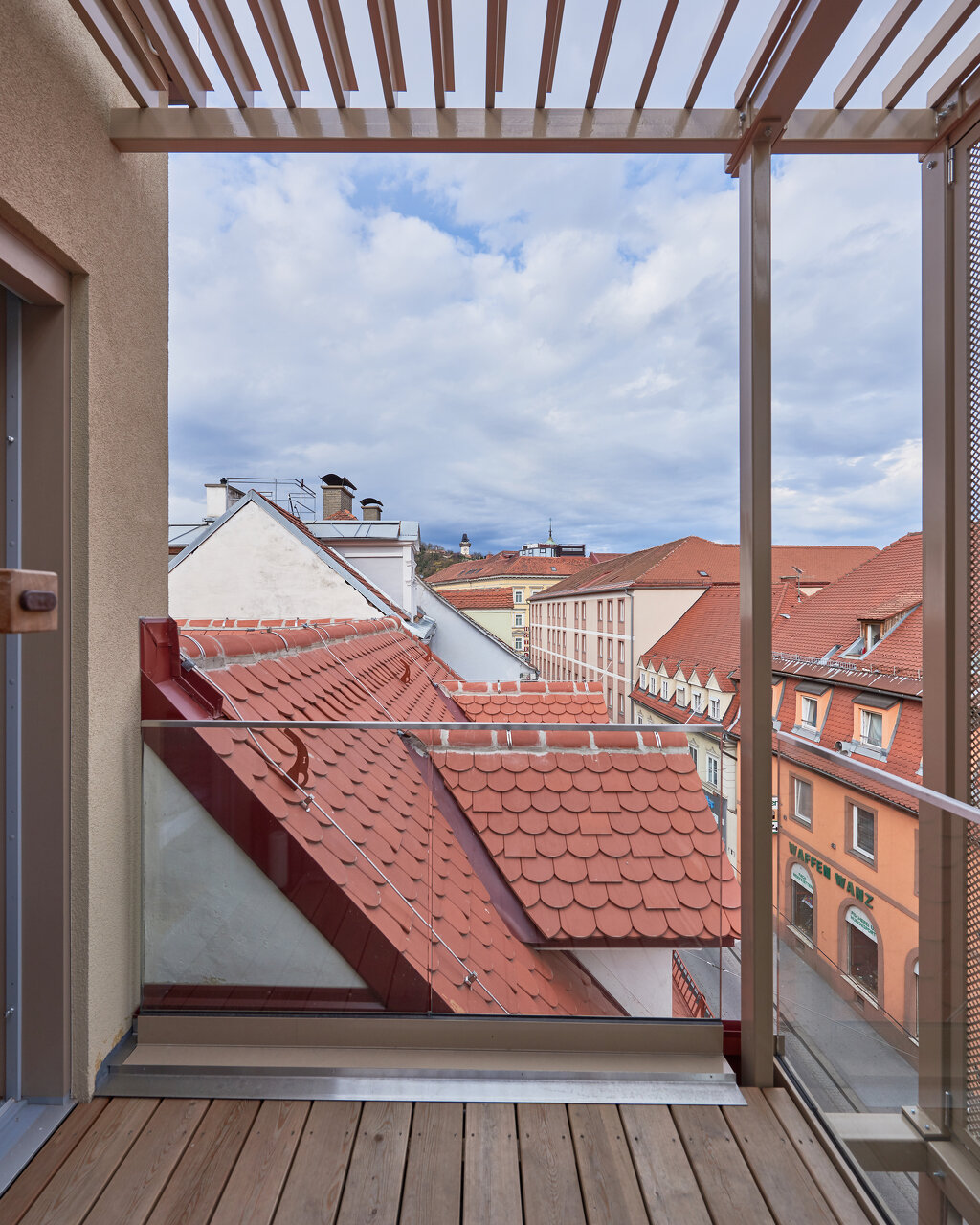 Die Materialität wird von der Massivbauweise bestimmt. Diese ordnet sich in die Typologie der Umgebung ein. Die Neubau-Fassaden sind hinterlüftet, zur Gasse bilden perforierte Blechlamellen die Ansicht, im Hof perforierte Metall-Schiebeläden vor den Fenstern. Sonstige Flächen sind mit Betonfaserplatten und Verputz ausgeführt. Die Leichtbauweise im Innenausbau ist kombiniert mit Holzfenstern, Holzböden, Terrassen mit Lärchenholz, die Dächer extensiv begrünt. Das historische Haus wird von rezenten Bauteilen entkernt, die historischen Bauelemente saniert und die Struktur wieder erlebbar gemacht. Die Fenster werden als Kastenstockfenster rückgebaut, das Dach mit eingemischten Ziegeln gedeckt. Deckenstuckaturen und Fassadenfärbelung sind vom Restaurator in Kalk-Technik wieder hergestellt.