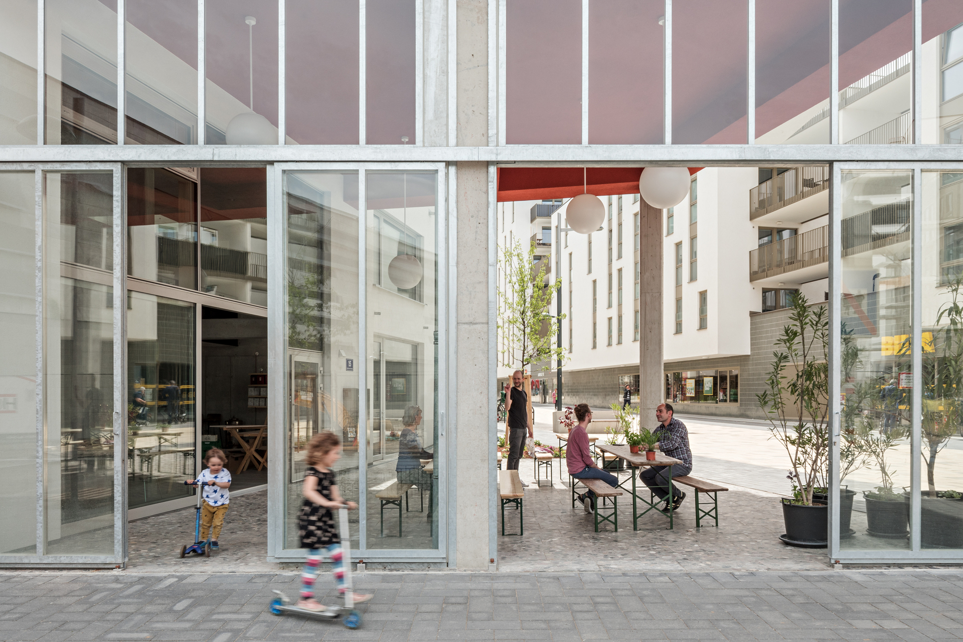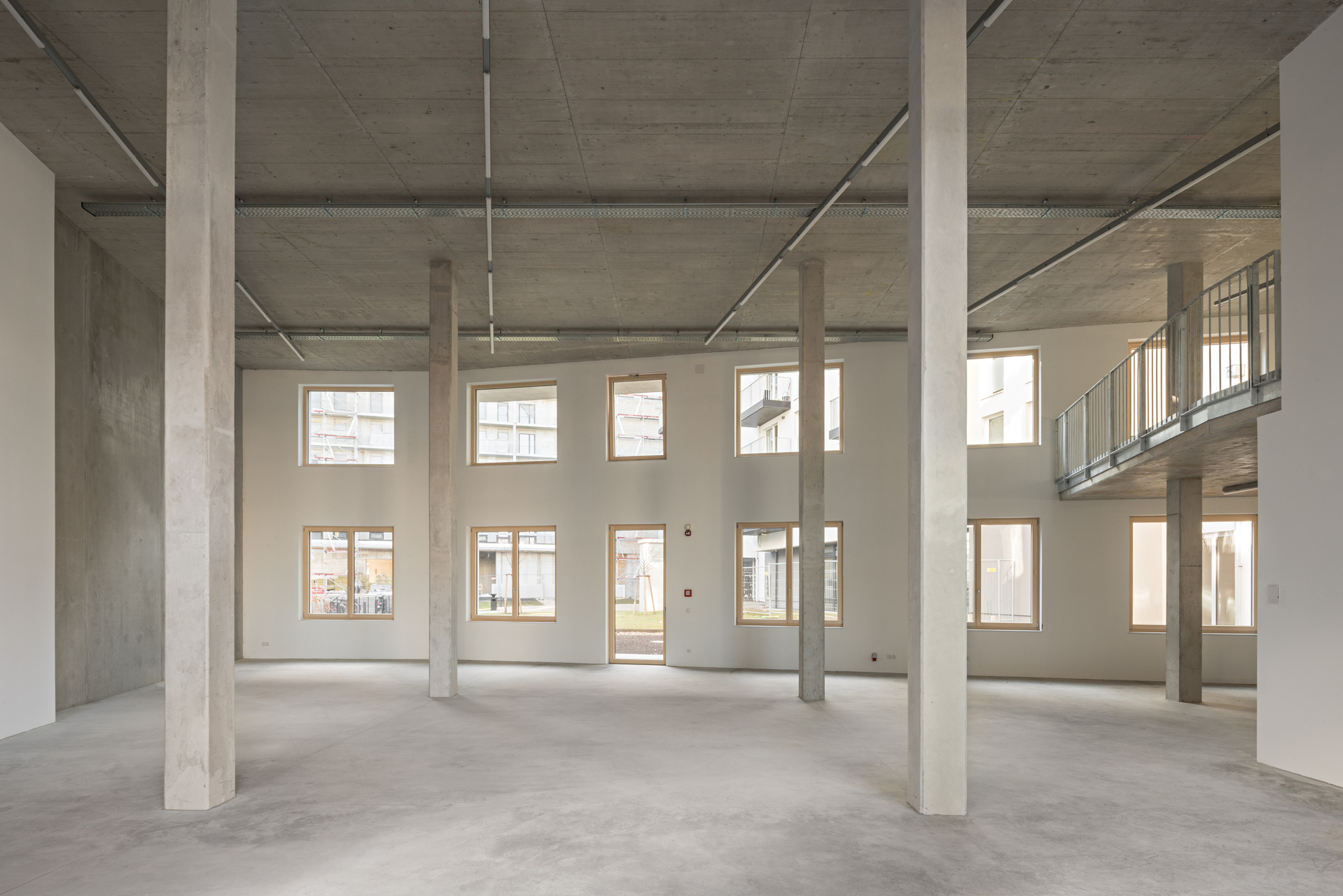 Unter der Aufstelzung entstand mit der „Stadtloggia“ ein großzügiges Angebot für das Quartier, ein Bereich, der als offener Raum von der Allgemeinheit genutzt werden kann.