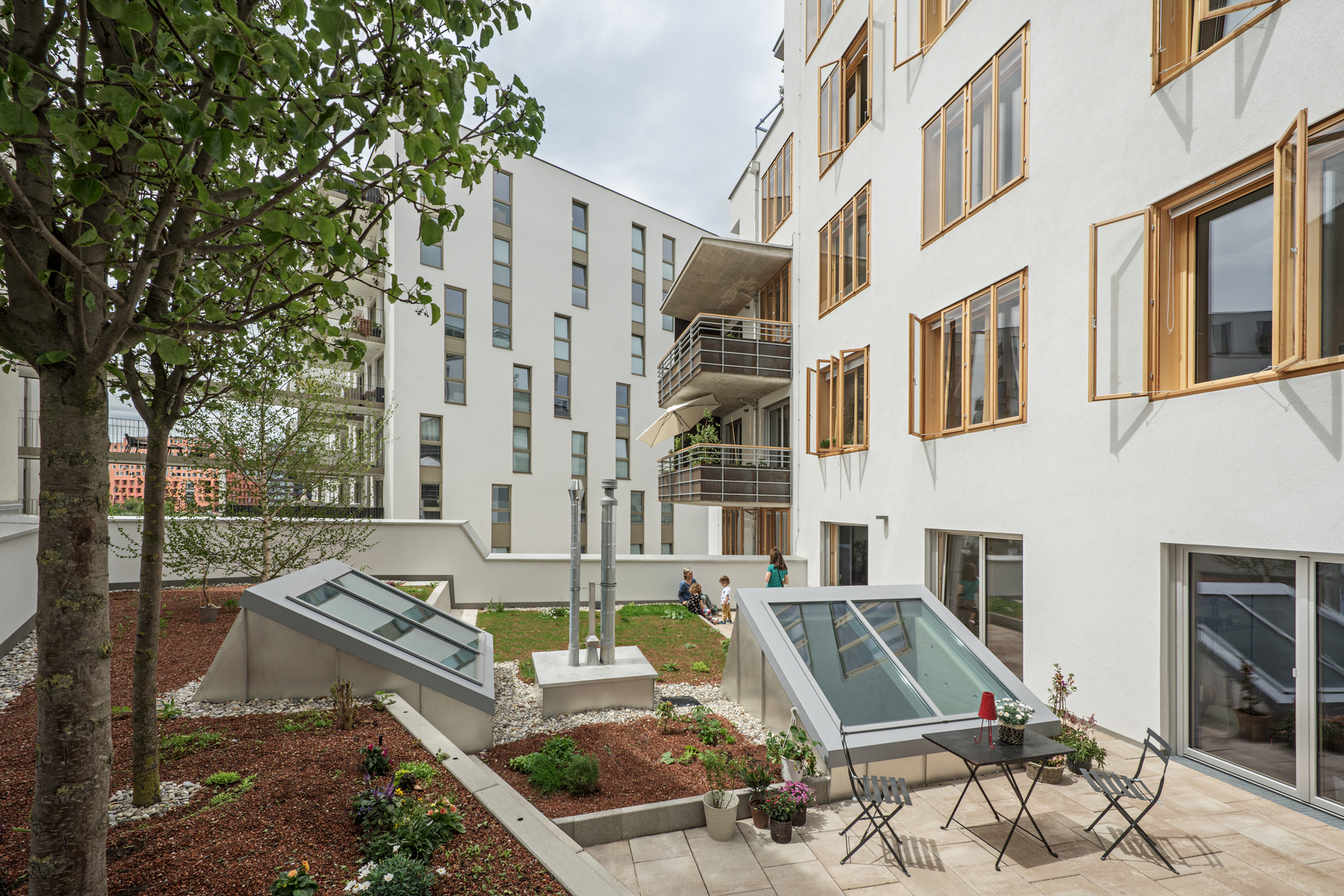 Die Absenkung des Baukörpers bringt auch dem Stadtraum Vorteile: Die geschlossenen Häuserzeilen erfahren eine Öffnung, die Ostsonne kann bis in die Straße scheinen und der Blick geht auf Bäume, die auf dem Terrassendach des zweigeschossigen Bauteils angepflanzt wurden.