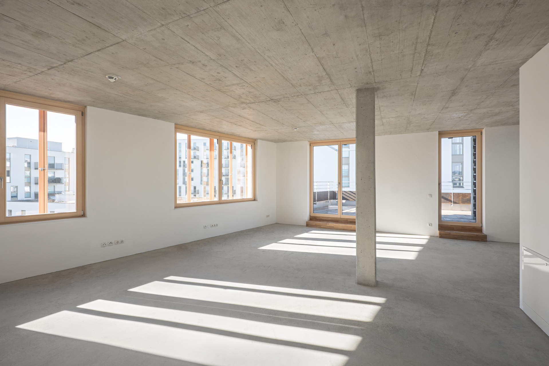 Auch im Material bietet der Bau Alternativen zu scheinbar unumgänglichen Standards. Statt Betonwänden mit ökologisch bedenklichem Vollwärmeschutz bestehen die tragenden Außenwände von Loft Living aus Ziegeln – eine zusätzliche Dämmschicht ist entbehrlich.