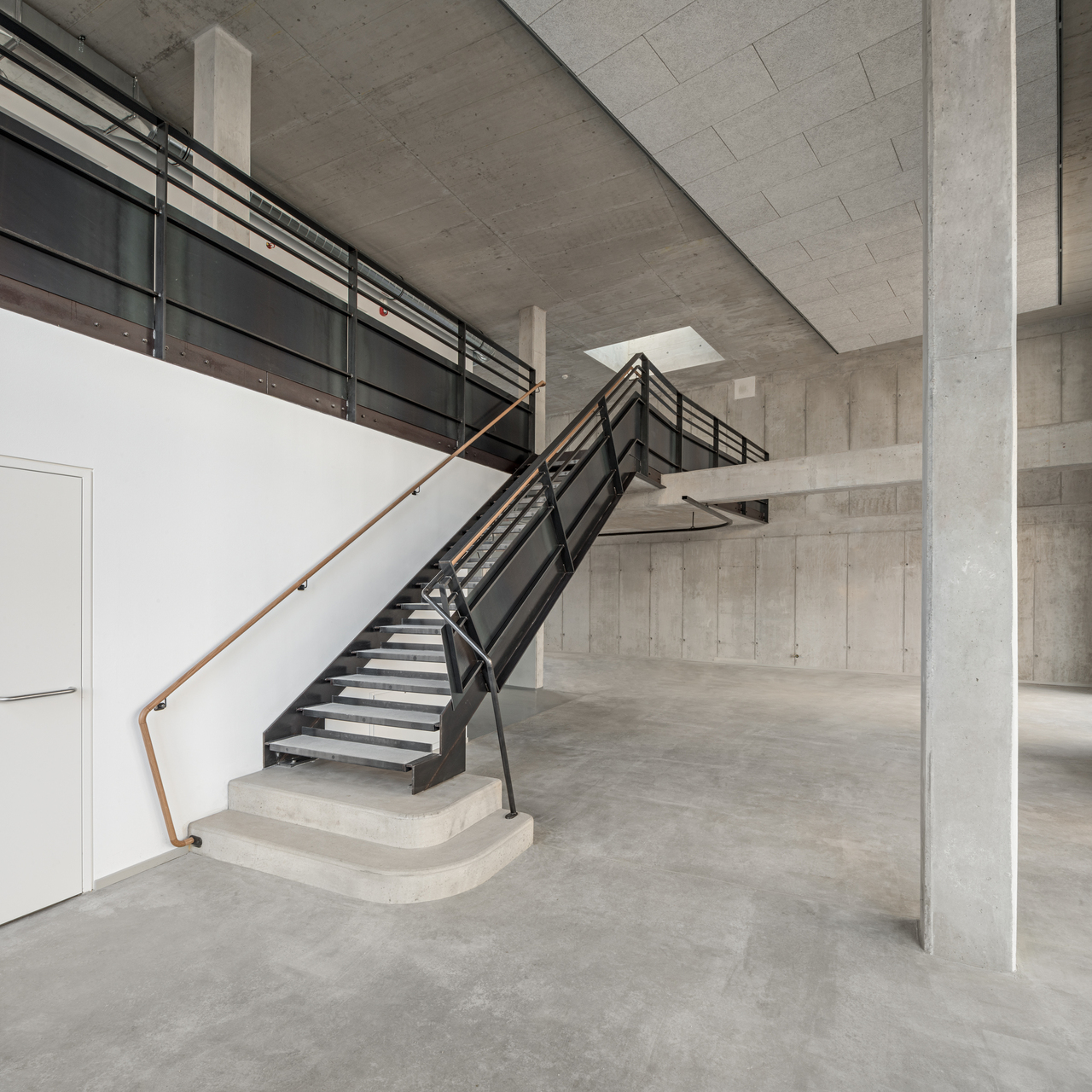 Das Lokal offeriert als fünf Meter hoher, über Eck geführter Raum mit Galeriegeschoß auch einen besonderen architektonischen Reichtum mit bemerkenswerter Lichtführung. Von allen Seiten, auch von oben fällt Tageslicht ein. Sichtbeton wird mit dunklem Metall, und hellem Holz kombiniert. Künstlerische Arbeiten von Gilbert Bretterbauer und Heimo Zobernig tragen das ihre zur anregenden Atmosphäre dieses Raumes bei. Er ist in der warmen Jahreszeit erweiterbar auf eine hofseitige Terrasse und auf die straßenseitige Stadtloggia. Diese ist zur Straße durch eine transparente Schiebewand gleichzeitig geschützt und offen. (Text: Maria Welzig)