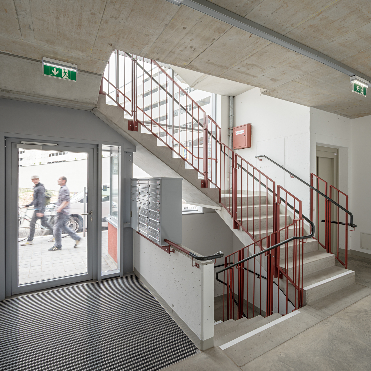 Damit war es möglich, alle 13 Wohneinheiten in den Obergeschossen mit einem großen Balkon zur südorientierten Hofseite auszustatten.