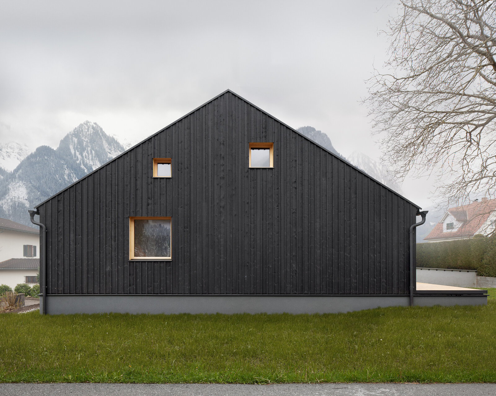 Das Haus aus Fichte hält sich in Form, Position, Kubatur und Statik genau an seinen Vorgängerbau, ist aber zeitgemäß gefertigt und formell entschlackt. Es wurde auf dem bestehenden Keller errichtet. Dessen Betondecke wurde abgedichtet und bildet nun das Fundament für den Neubau. Das ist nachhaltig und schafft keine Kältebrücken.