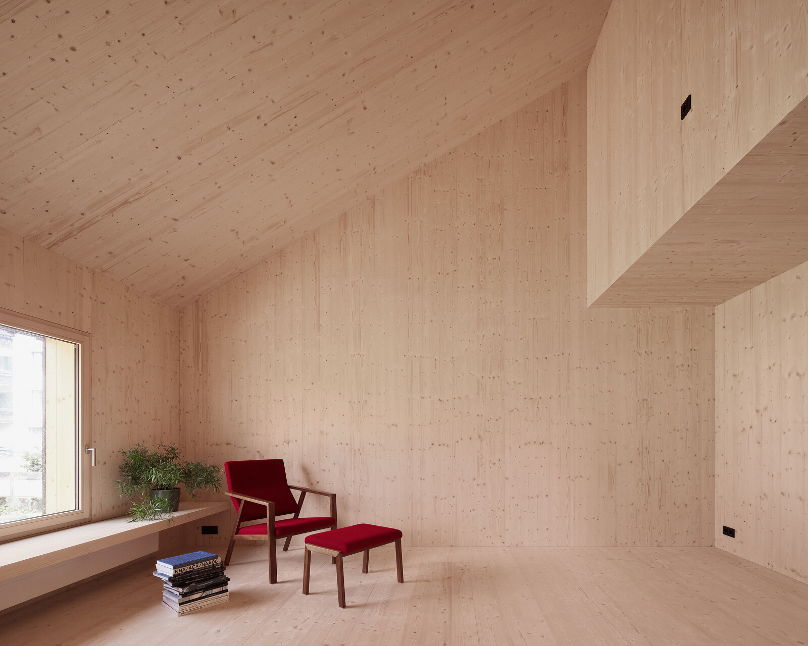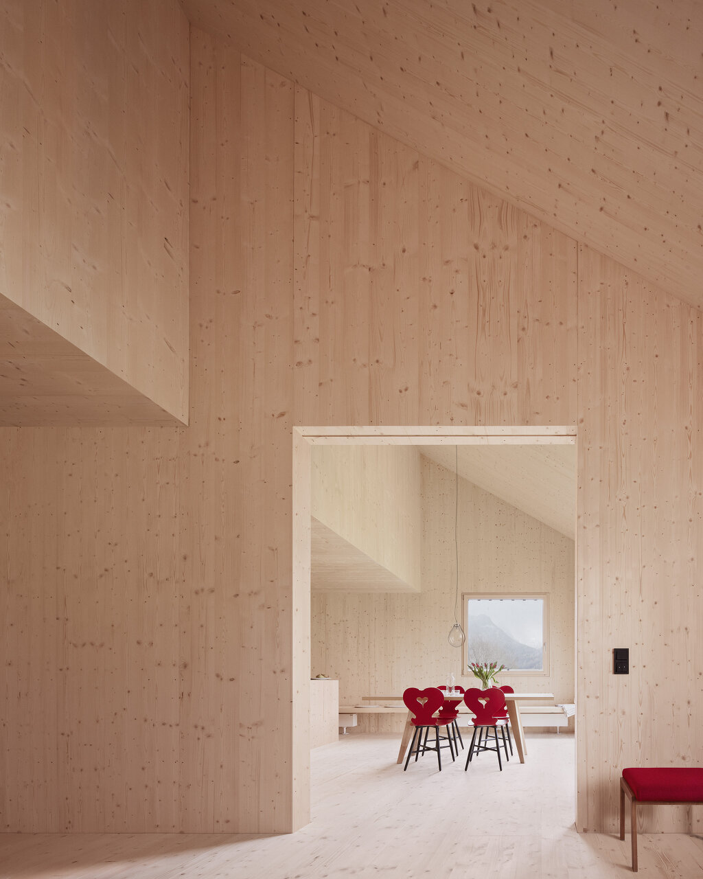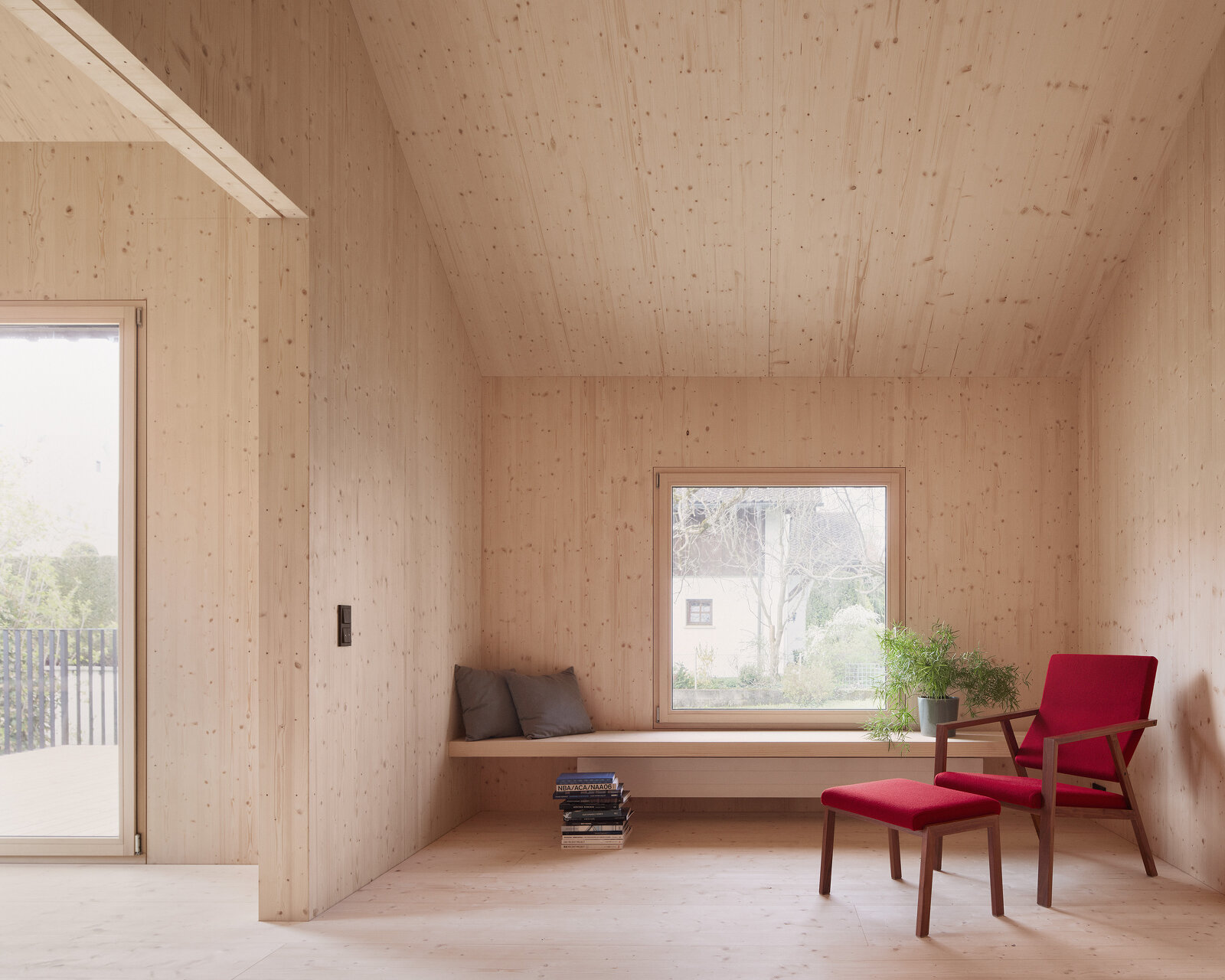 Das Haus aus Fichte ist ein vorgefertigter Holzbau, es stand in drei Tagen. Außen Fichte, innen Fichte, die billigste Bauklasse, alle unbehandelt. Die Außenfassade ist schwarz gestrichen, rote Fensterläden gibt es keine mehr, dafür rote Jalousien, semitransparent, eine feine Referenz. Innen sind alle Oberflächen – Boden, Wand, Decke konsequent aus demselben Fichtenholz. Das verleiht dem Inneren eine skulptural anmutende Qualität, in den unbehandelten Oberflächen wird sich mit den Nutzungsspuren die Geschichte des Hauses weiterschreiben. (Text: Isabella Marboe)