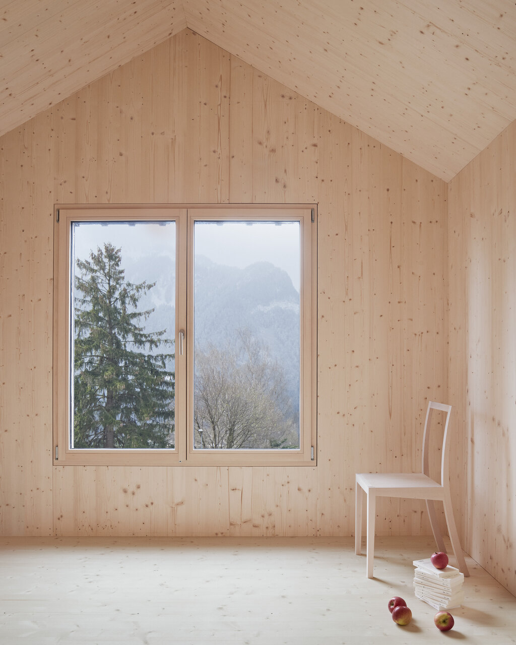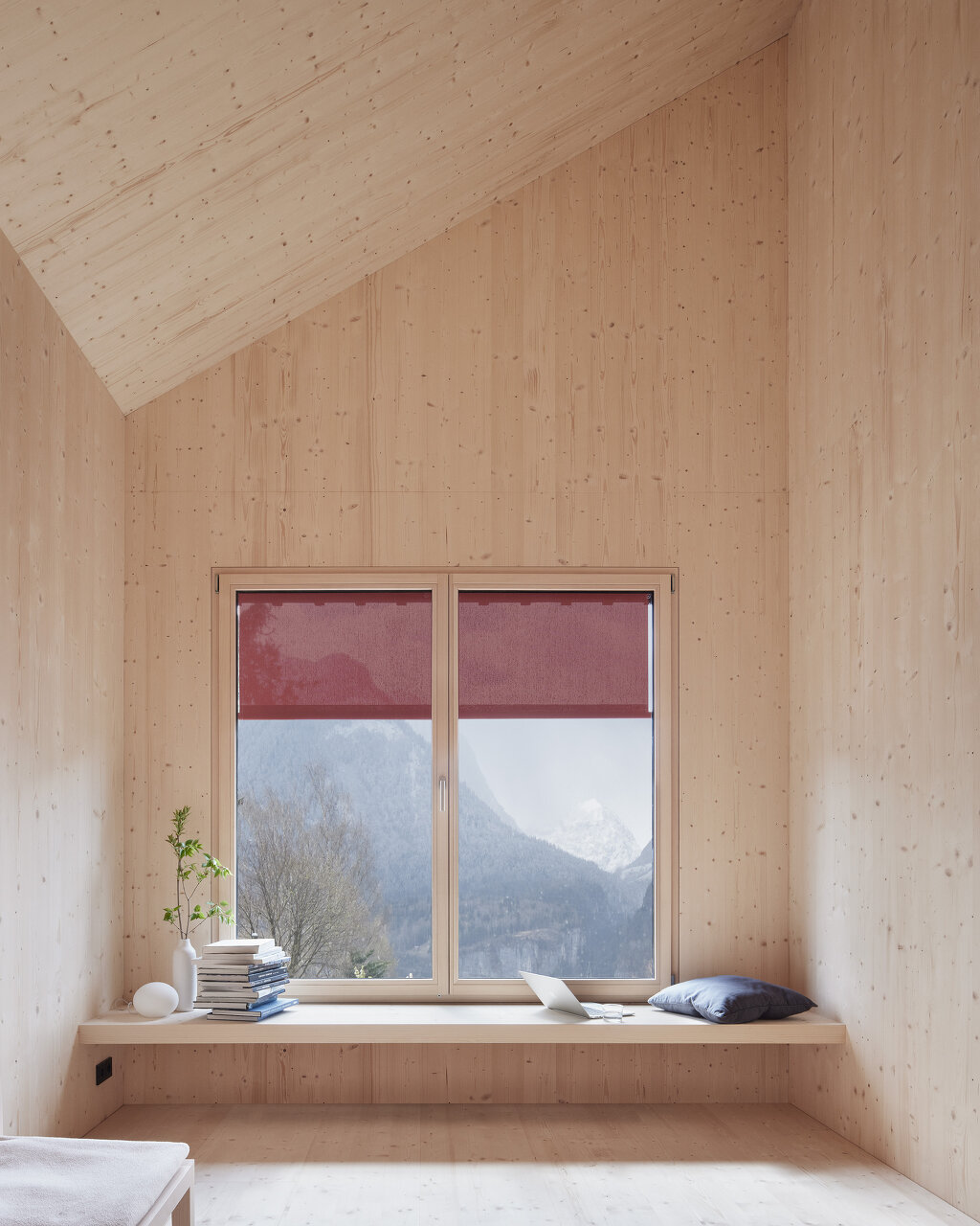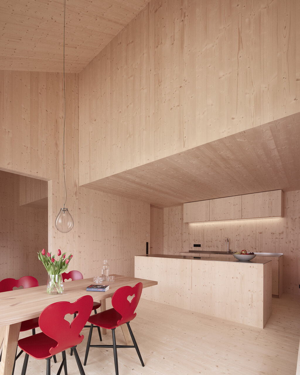 Das Haus aus Fichte ist ein vorgefertigter Holzbau, es stand in drei Tagen. Außen Fichte, innen Fichte, die billigste Bauklasse, alle unbehandelt. Die Außenfassade ist schwarz gestrichen, rote Fensterläden gibt es keine mehr, dafür rote Jalousien, semitransparent, eine feine Referenz. Innen sind alle Oberflächen – Boden, Wand, Decke konsequent aus demselben Fichtenholz. Das verleiht dem Inneren eine skulptural anmutende Qualität, in den unbehandelten Oberflächen wird sich mit den Nutzungsspuren die Geschichte des Hauses weiterschreiben. (Text: Isabella Marboe)