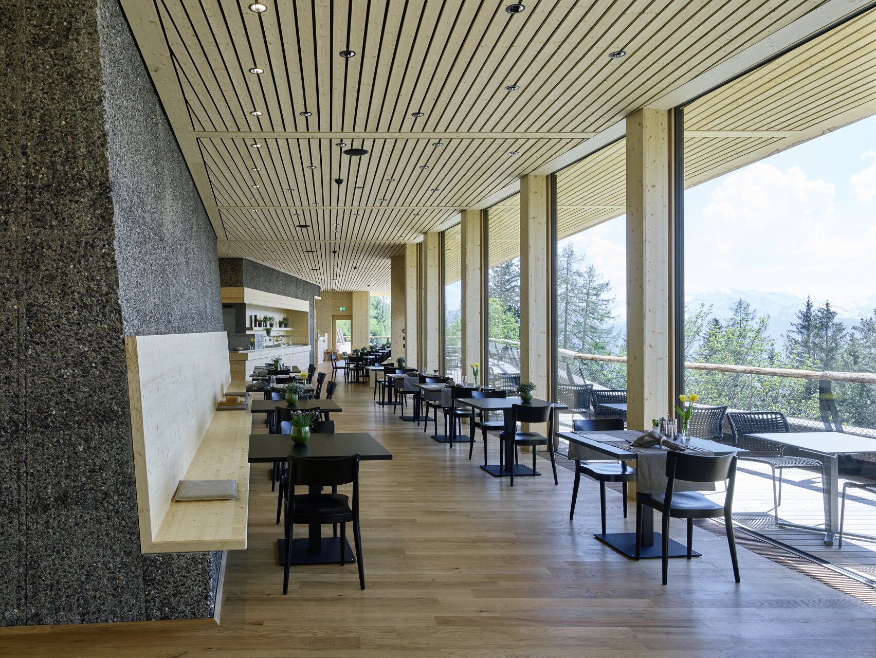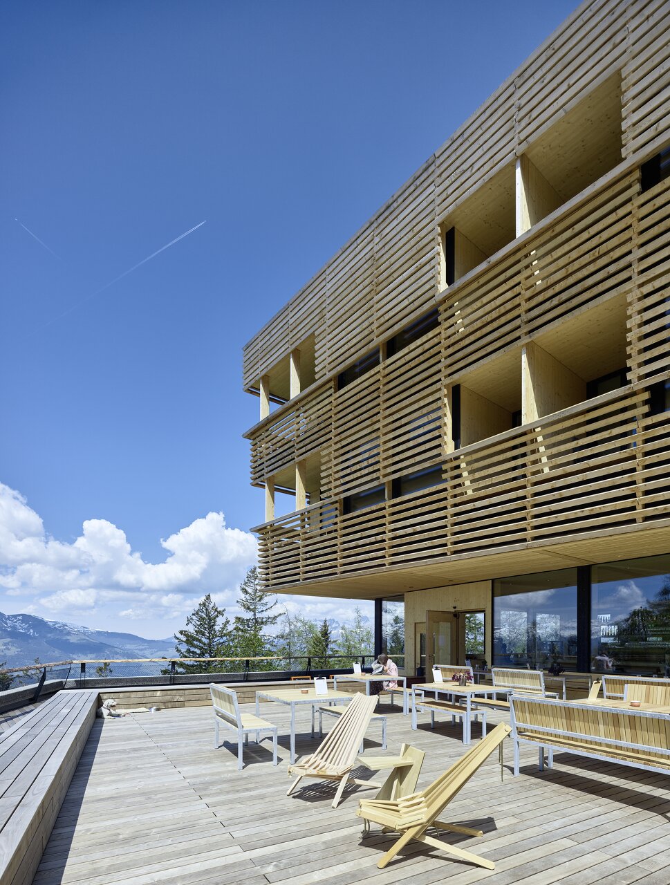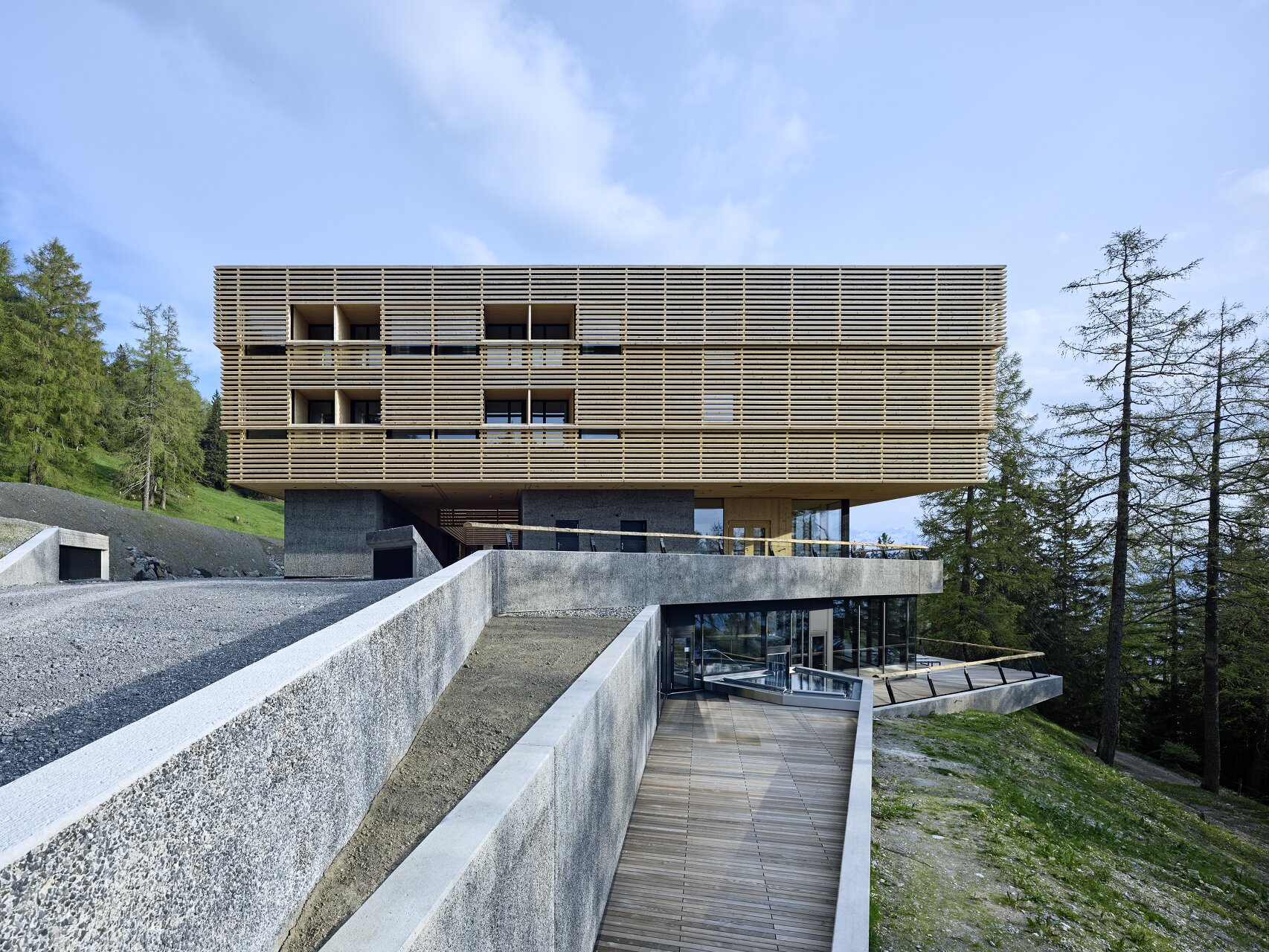 Über diesem Landschaftssockel befindet sich die Eingangsebene mit Lobby, Restaurant und Saal. Sie ist vollkommen offen zur Aussicht hin konzipiert. Dienende Räume, wie Küche, Treppen und Aufzüge bilden massive Kerne, die auch das Tragwerk für die darüber liegende Schicht bilden. Die beiden Obergeschosse nehmen in einem einfachen Quader insgesamt 50 Gastzimmer, die Verwaltung und Mitarbeiterappartements auf. In Material, Bauart und Charakter nimmt der Bauteil Bezug auf die ortstypischen Wirtschaftsgebäude in der weiteren Umgebung. Die Räume formen ein Geviert um einen Patio, der als gestalteter Freiraum einen kontemplativen Ruhepol gegenüber der zuweilen überwältigenden Alpenkulisse bildet. Anklänge an klösterliche Kreuzgänge sind beabsichtigt und baulicher Ausdruck einer Gemeinschaft, für die Besinnung, Sammlung, „Wieder zu sich finden“ wichtige Themen sind.