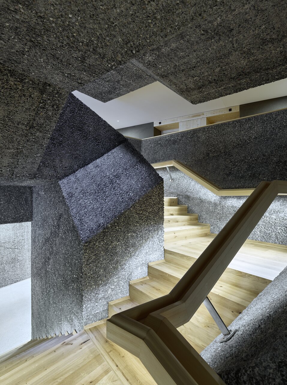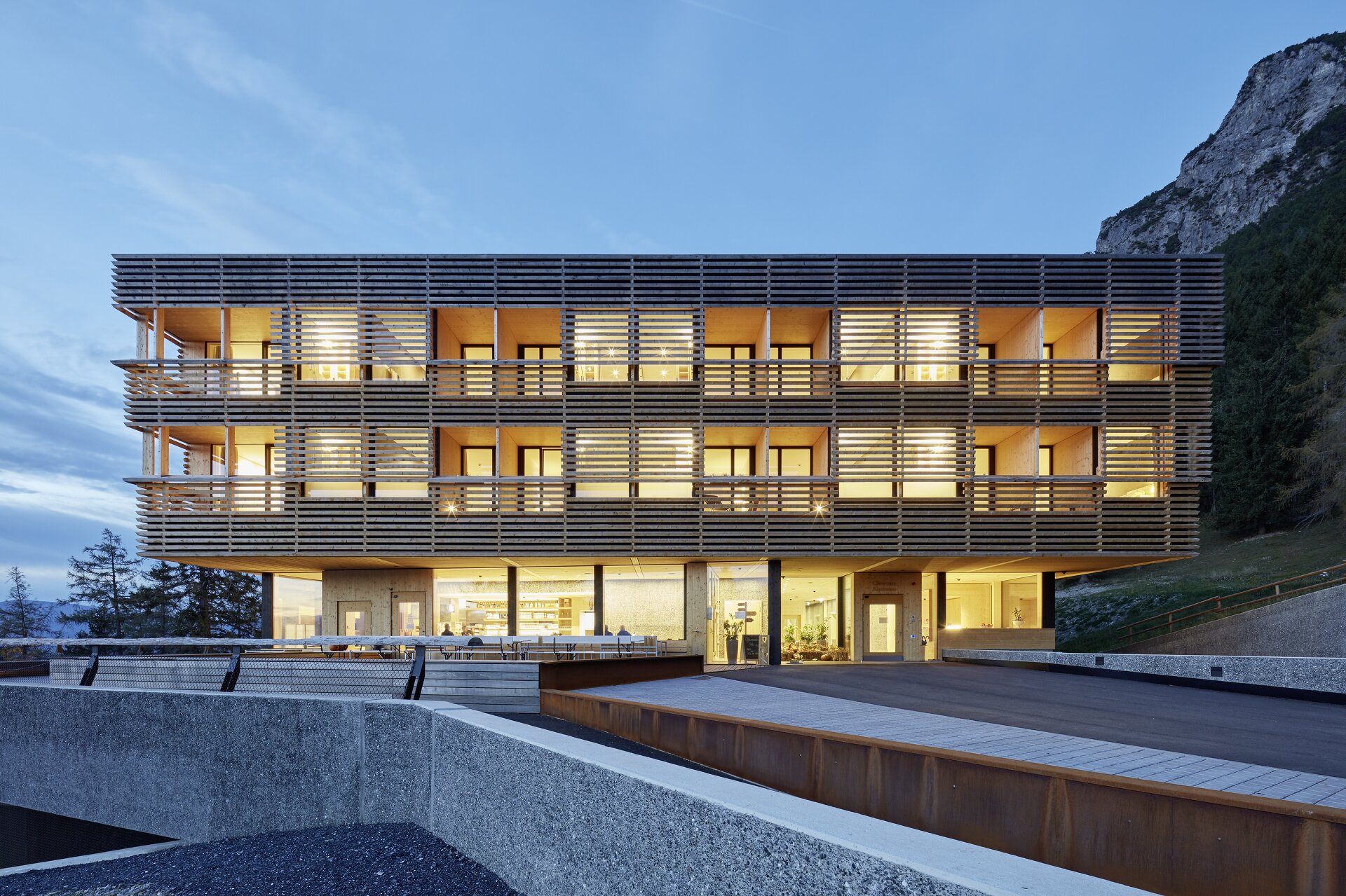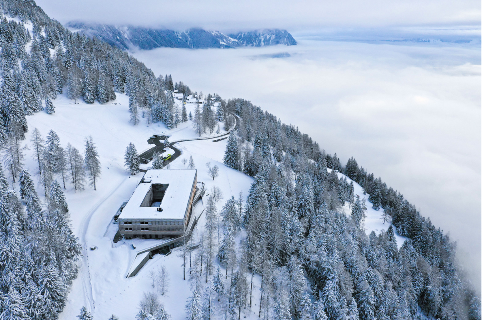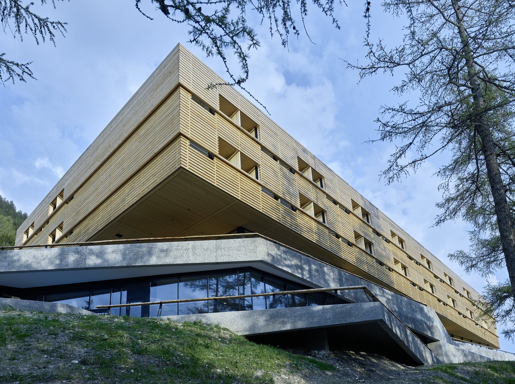 Über diesem Landschaftssockel befindet sich die Eingangsebene mit Lobby, Restaurant und Saal. Sie ist vollkommen offen zur Aussicht hin konzipiert. Dienende Räume, wie Küche, Treppen und Aufzüge bilden massive Kerne, die auch das Tragwerk für die darüber liegende Schicht bilden. Die beiden Obergeschosse nehmen in einem einfachen Quader insgesamt 50 Gastzimmer, die Verwaltung und Mitarbeiterappartements auf. In Material, Bauart und Charakter nimmt der Bauteil Bezug auf die ortstypischen Wirtschaftsgebäude in der weiteren Umgebung. Die Räume formen ein Geviert um einen Patio, der als gestalteter Freiraum einen kontemplativen Ruhepol gegenüber der zuweilen überwältigenden Alpenkulisse bildet. Anklänge an klösterliche Kreuzgänge sind beabsichtigt und baulicher Ausdruck einer Gemeinschaft, für die Besinnung, Sammlung, „Wieder zu sich finden“ wichtige Themen sind.