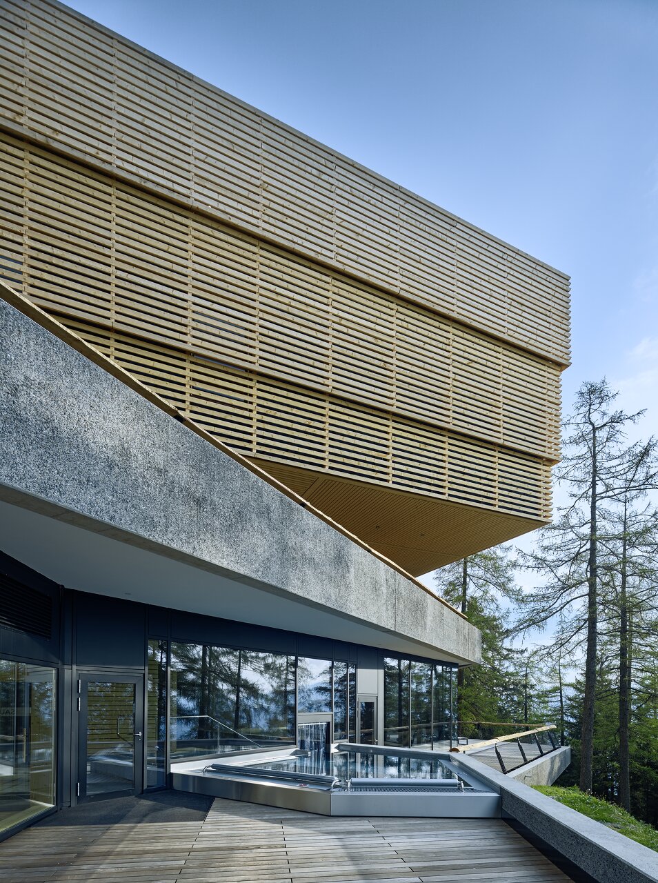 Die unterste Schicht ist in den Hang geschoben. Während Garage und Infrastrukturräume völlig verschwinden, öffnen sich Therapie- und Spa-Bereiche über großzügige Terrassen zur Aussicht hin. Diese zeichnen mit ihren sich verschränkenden Brüstungen in abstrahierter Form die Topografie nach.