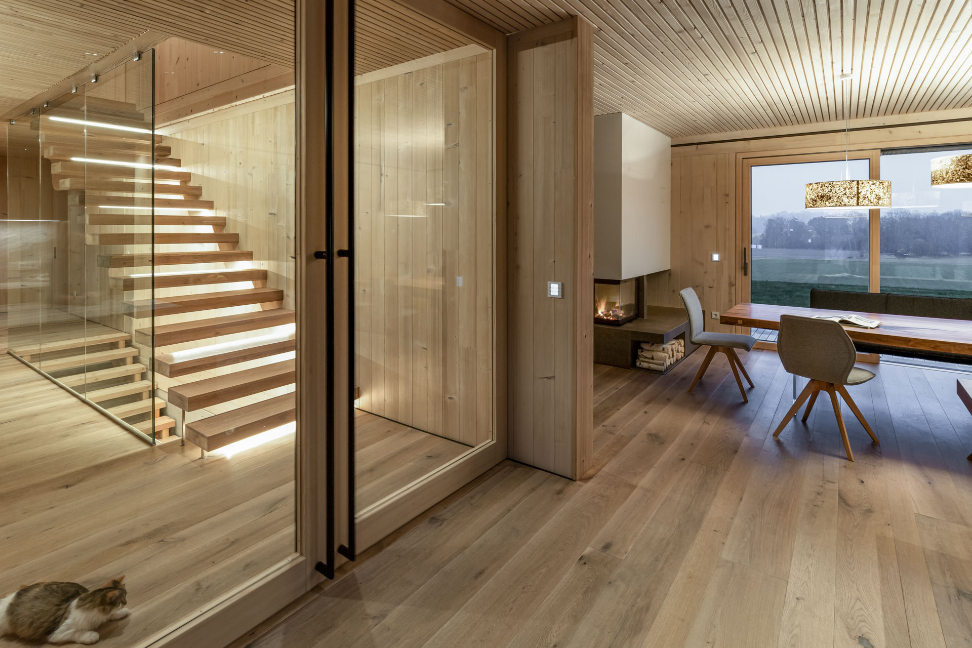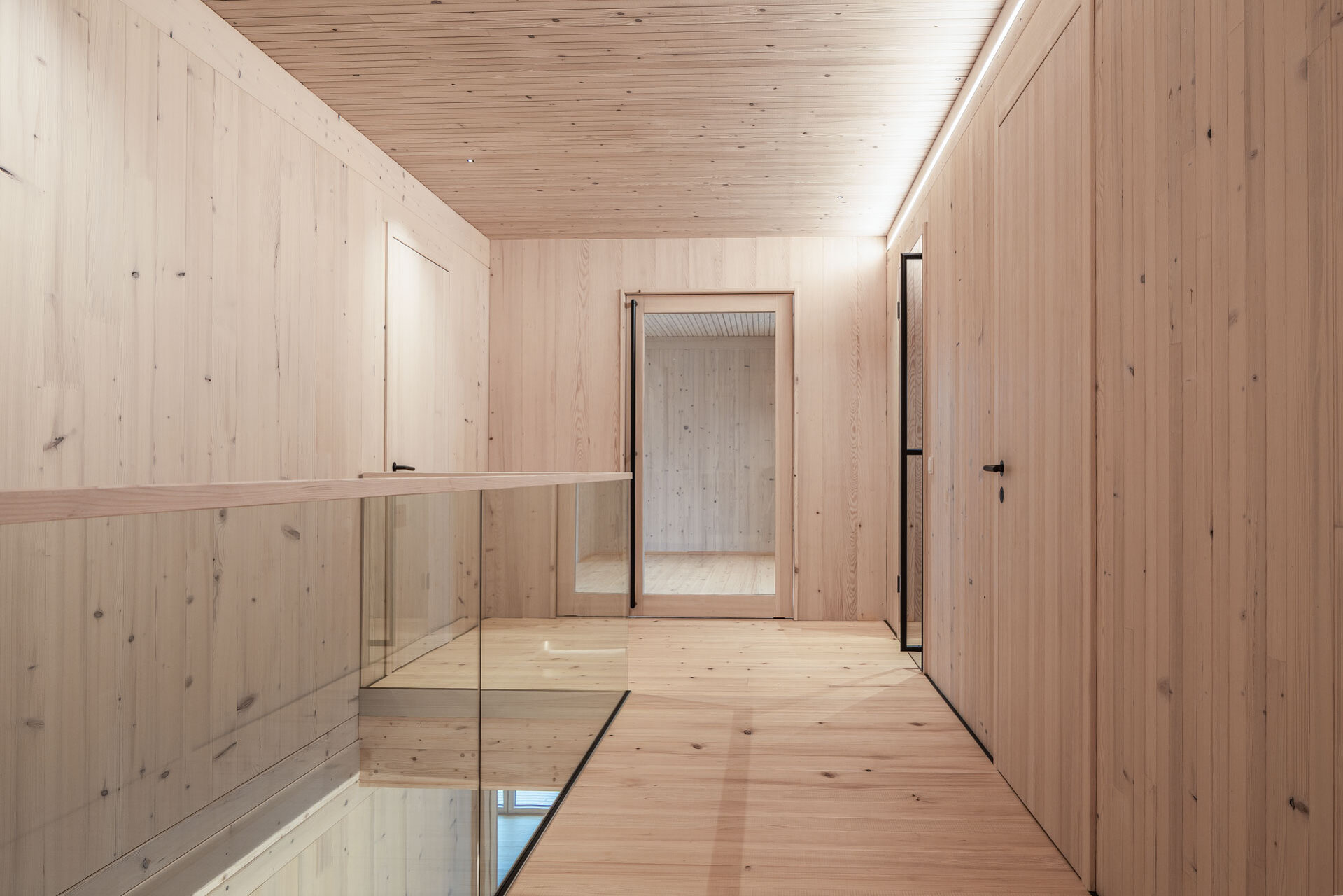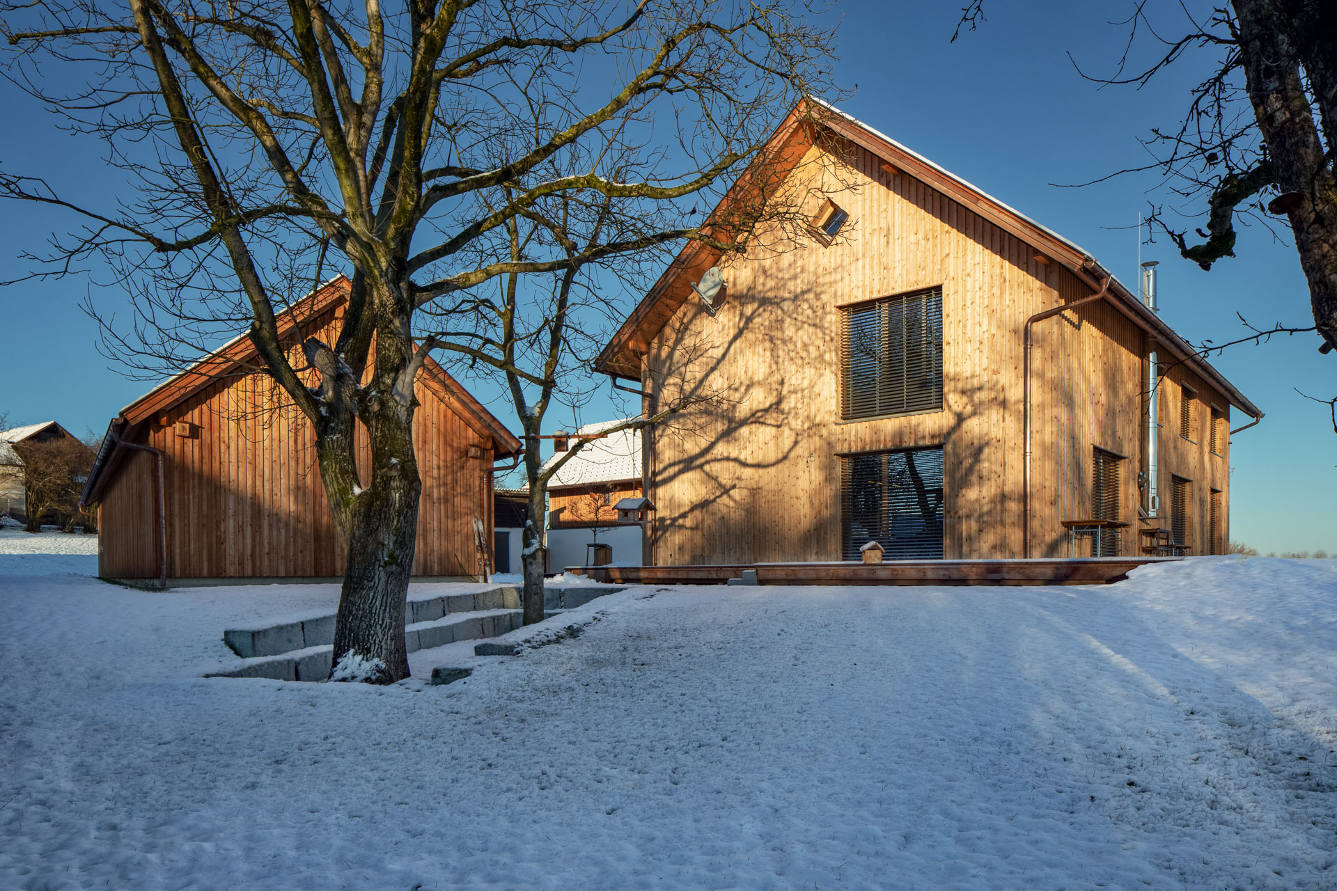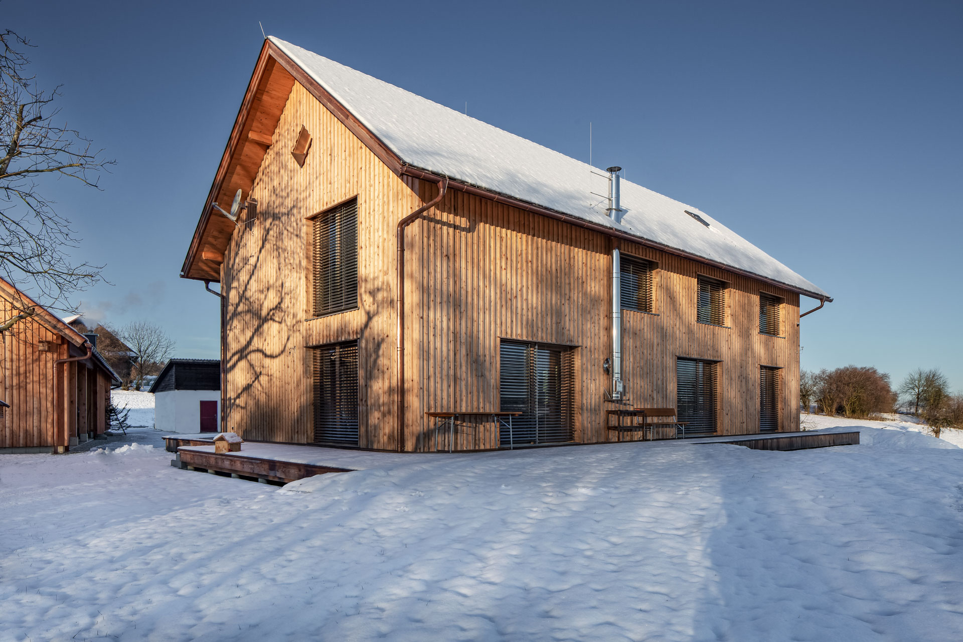 Das neue Wohnhaus wurde nach Osten verlagert, auf eine sanfte Anhöhe mit Weitblick über die Felder. Über dem alten Gewölbe des Mostkellers wurde es aus Tannen-Massivholz errichtet. Die hölzerne Bodenplatte schwebt 60 cm über dem Erdniveau, aufgeständert auf Streifenfundamenten mit Belüftungslöchern. Die Wände sind aus 12–16 cm starken, stehenden Blockwänden in Nut-Feder-Fügung gefertigt. Dübelelemente mit Akustikfräsung bilden die Decken. Der Konstruktionsbaustoff Holz ist im ganzen Haus auch oberflächlich intensiv erlebbar: an Decken und Böden, die mit Massivholzparkett belegt sind, genauso an den Wänden, deren aussteifende Diagonalschalung mit Holznägeln befestigt wurde. (Text: Architekt:innen, bearbeitet)
