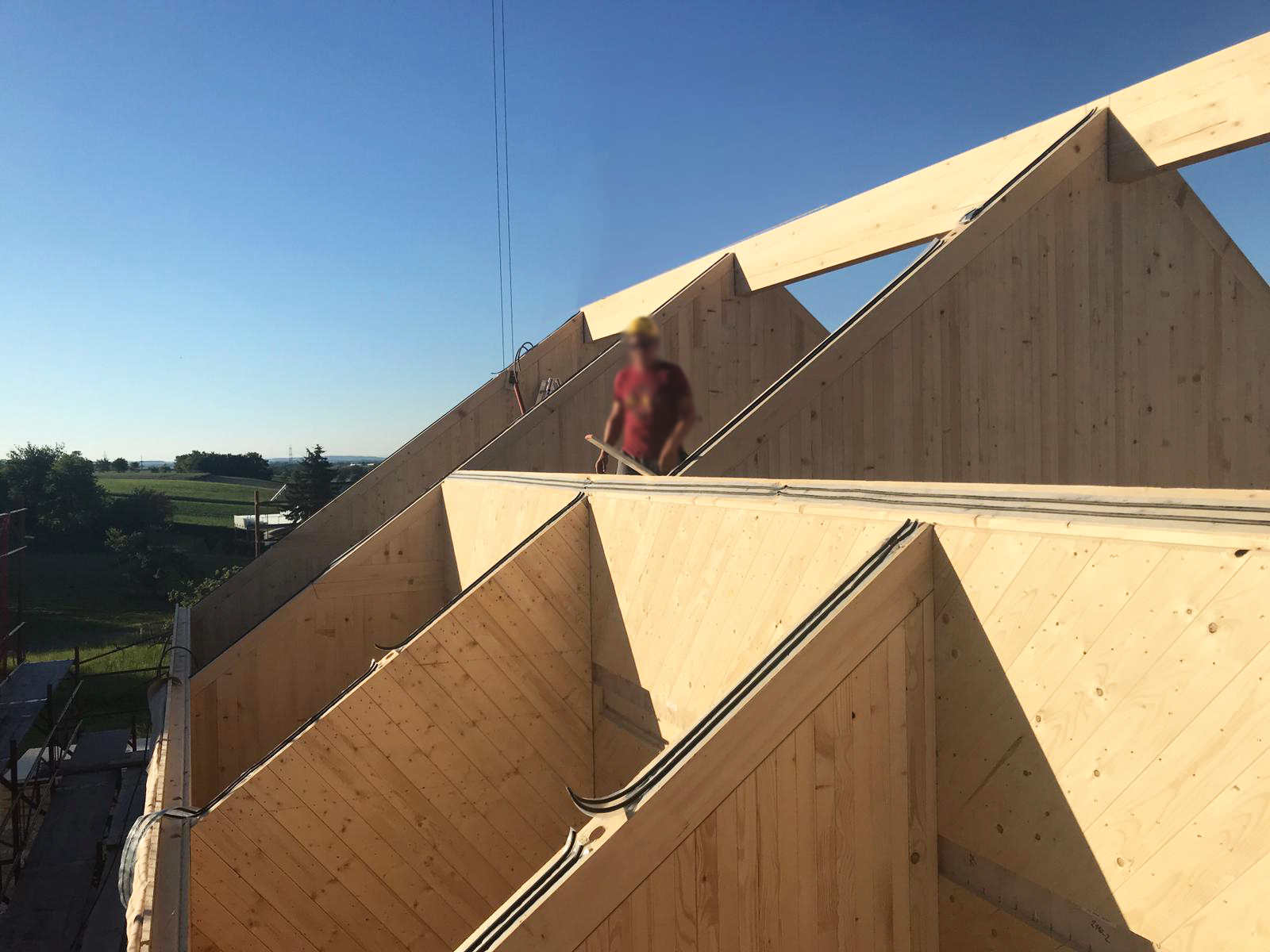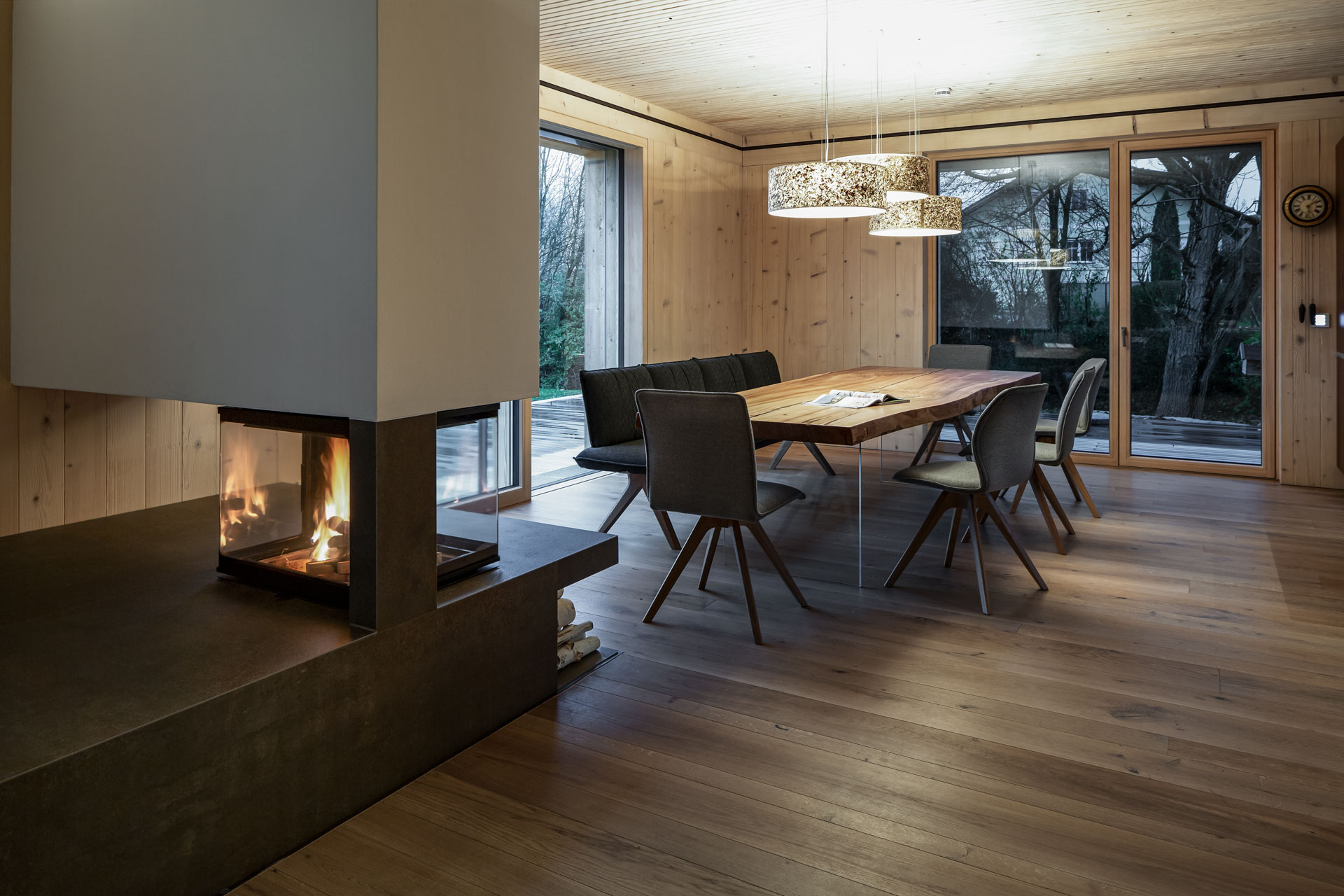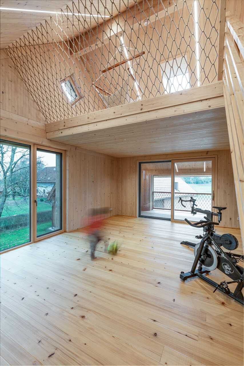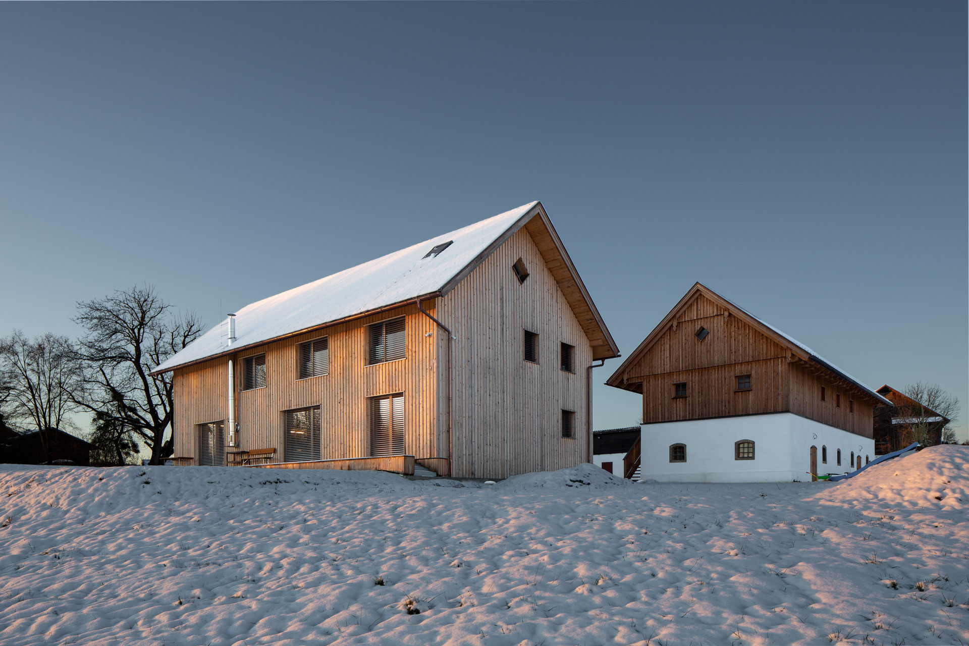 Das neue Wohnhaus wurde nach Osten verlagert, auf eine sanfte Anhöhe mit Weitblick über die Felder. Über dem alten Gewölbe des Mostkellers wurde es aus Tannen-Massivholz errichtet. Die hölzerne Bodenplatte schwebt 60 cm über dem Erdniveau, aufgeständert auf Streifenfundamenten mit Belüftungslöchern. Die Wände sind aus 12–16 cm starken, stehenden Blockwänden in Nut-Feder-Fügung gefertigt. Dübelelemente mit Akustikfräsung bilden die Decken. Der Konstruktionsbaustoff Holz ist im ganzen Haus auch oberflächlich intensiv erlebbar: an Decken und Böden, die mit Massivholzparkett belegt sind, genauso an den Wänden, deren aussteifende Diagonalschalung mit Holznägeln befestigt wurde. (Text: Architekt:innen, bearbeitet)