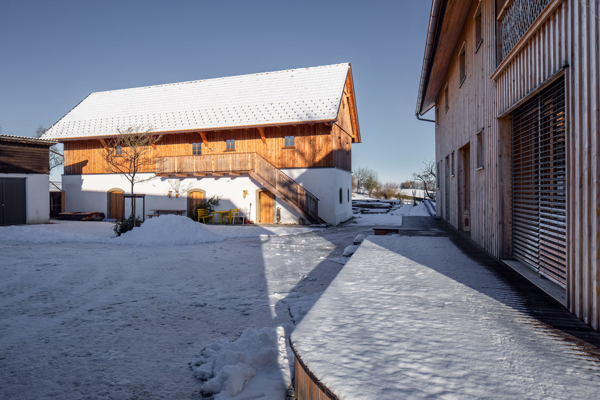 Im ersten Schritt wurde der über 150 Jahre alte Stall von Grund auf generalsaniert und originalgetreu wiederhergestellt. Anstelle des alten Wohnhauses wurde eine Remise in Holzmassivbauweise (Feuerwiderstandsklasse REI 30) errichtet – lediglich eingeschoßig, um den Innenhof mit mehr Licht und Sonne zu versorgen und so in einen wohnlichen Außenraum zu verwandeln.