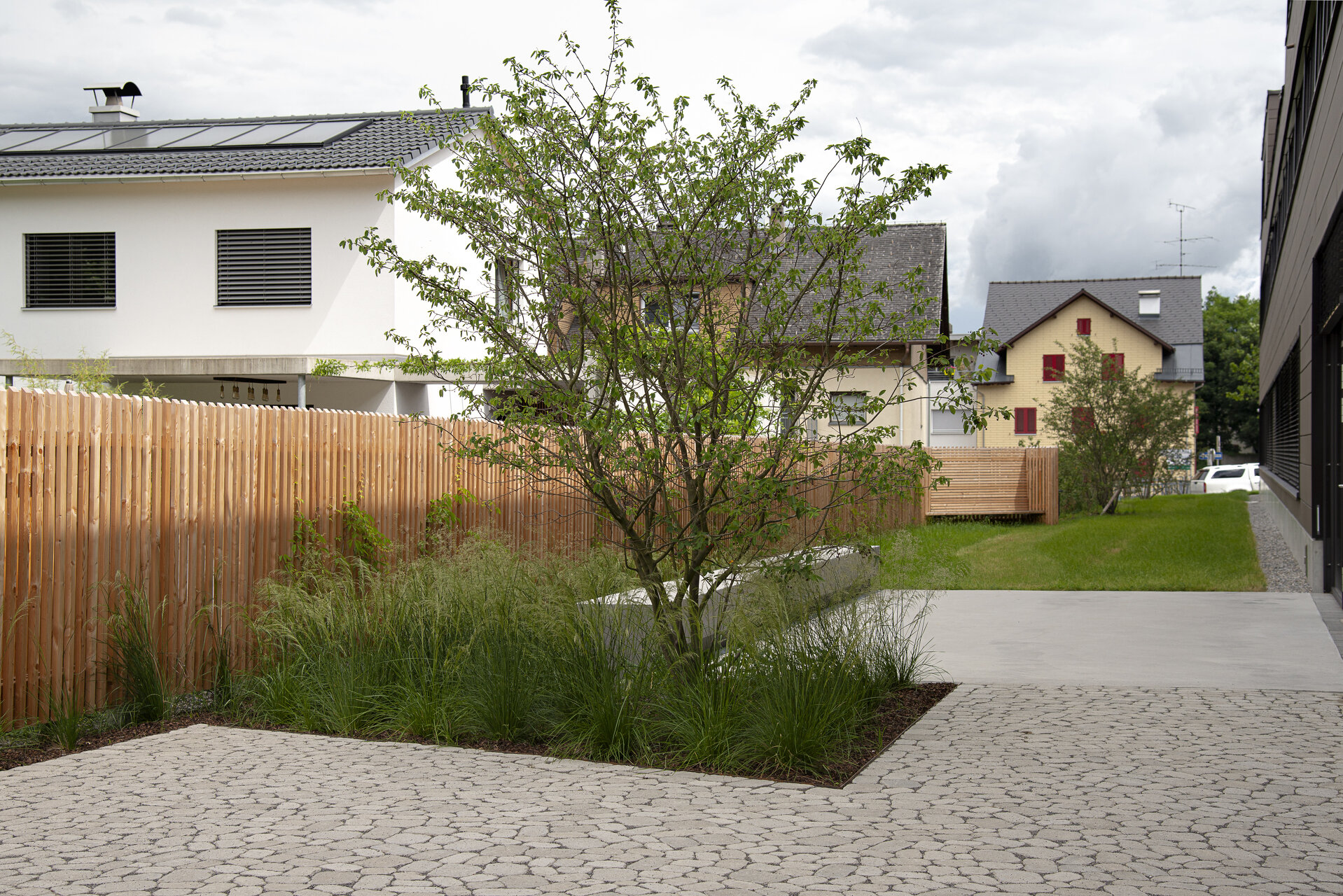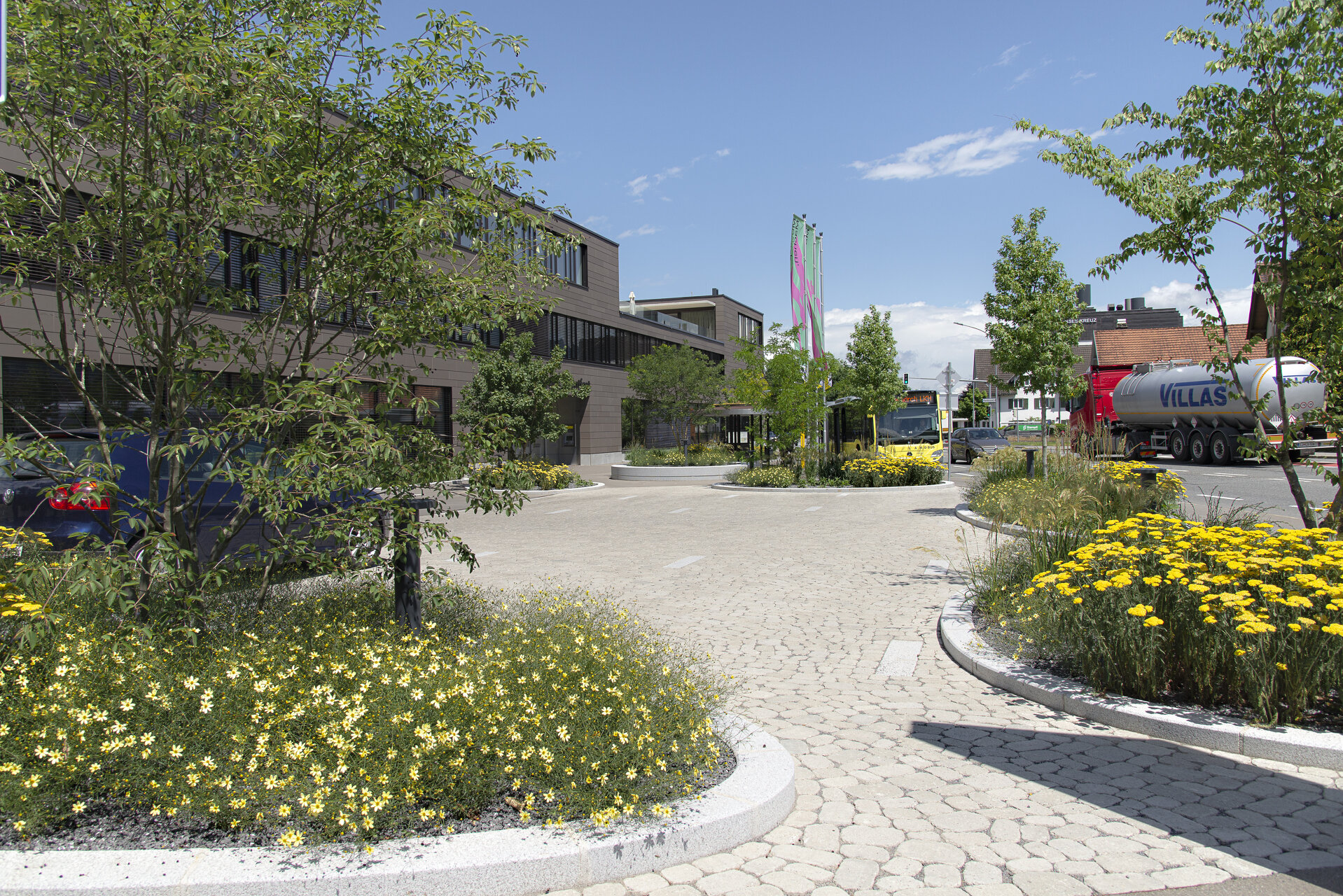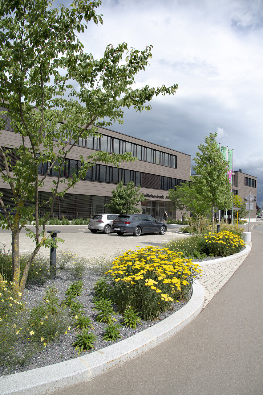 Der Vorplatz des Raiffeisenzentrums, an der Bruderhofstraße in Feldkirch, mit seinen variierenden Pflanzflächen ist durchlässig und als Ganzes erlebbar.