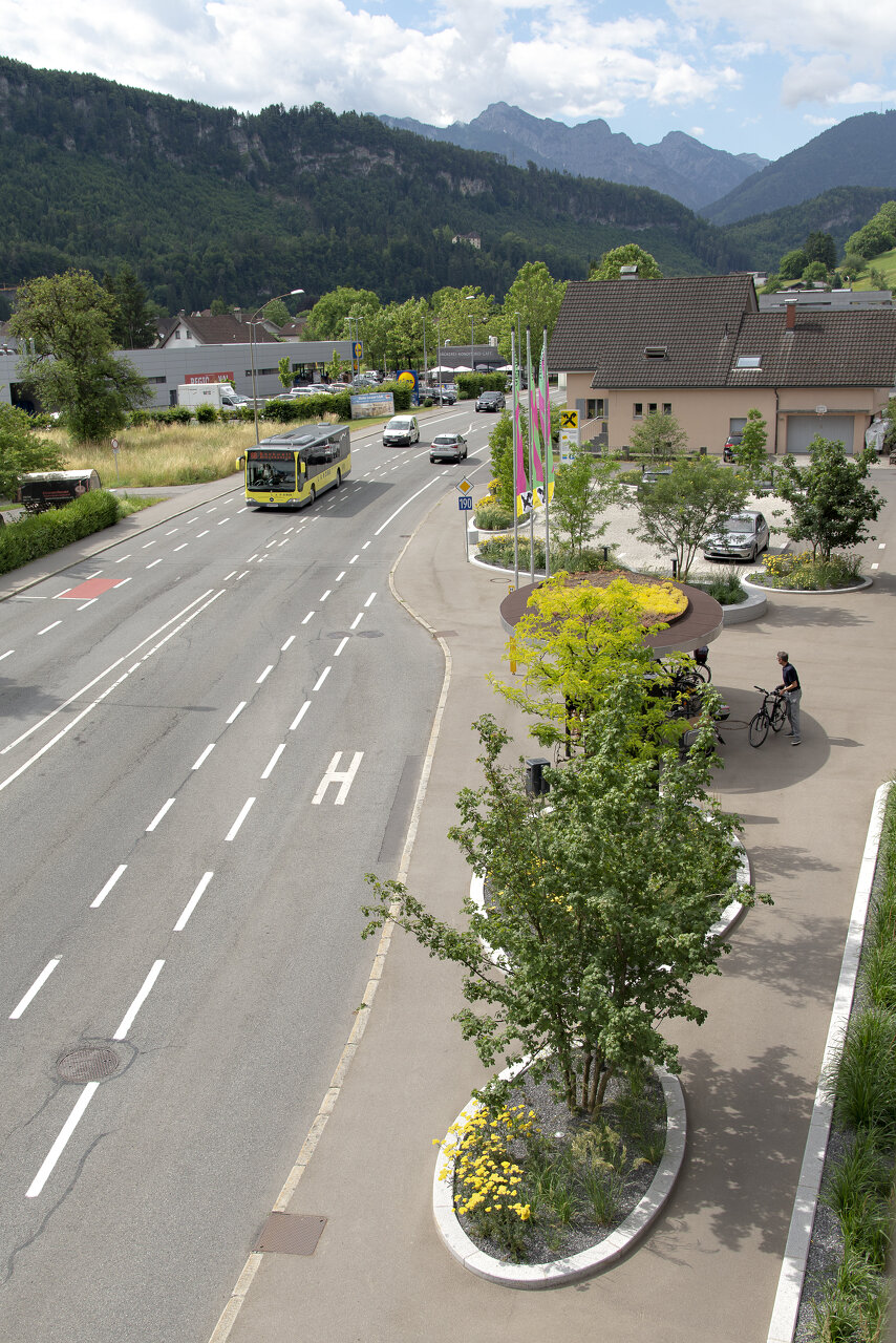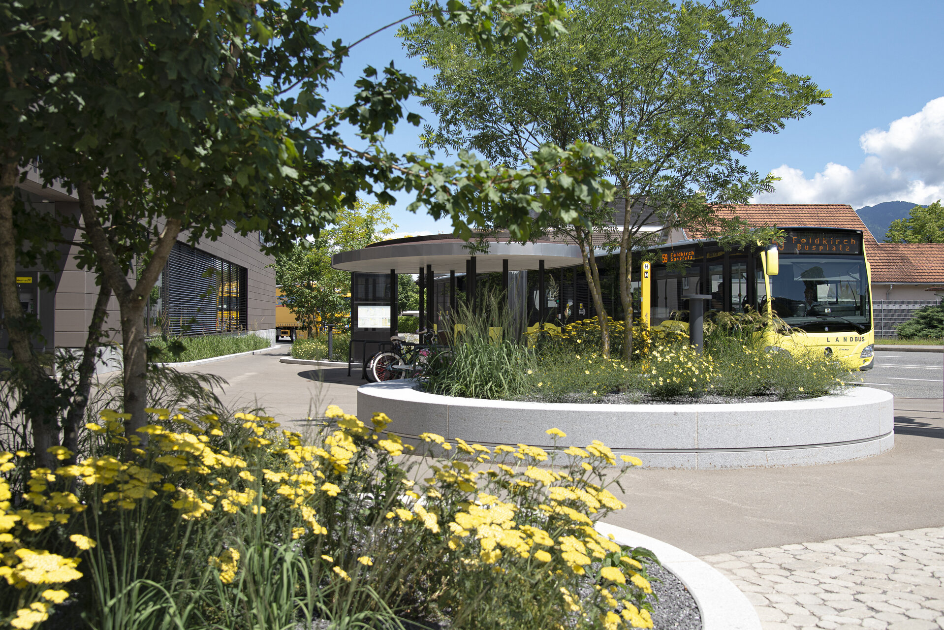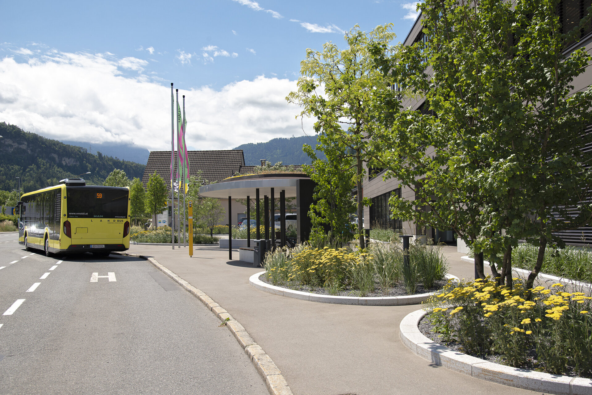 Der Vorplatz des Raiffeisenzentrums, an der Bruderhofstraße in Feldkirch, mit seinen variierenden Pflanzflächen ist durchlässig und als Ganzes erlebbar.