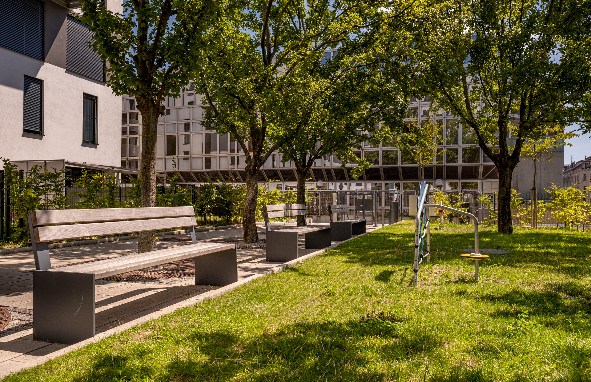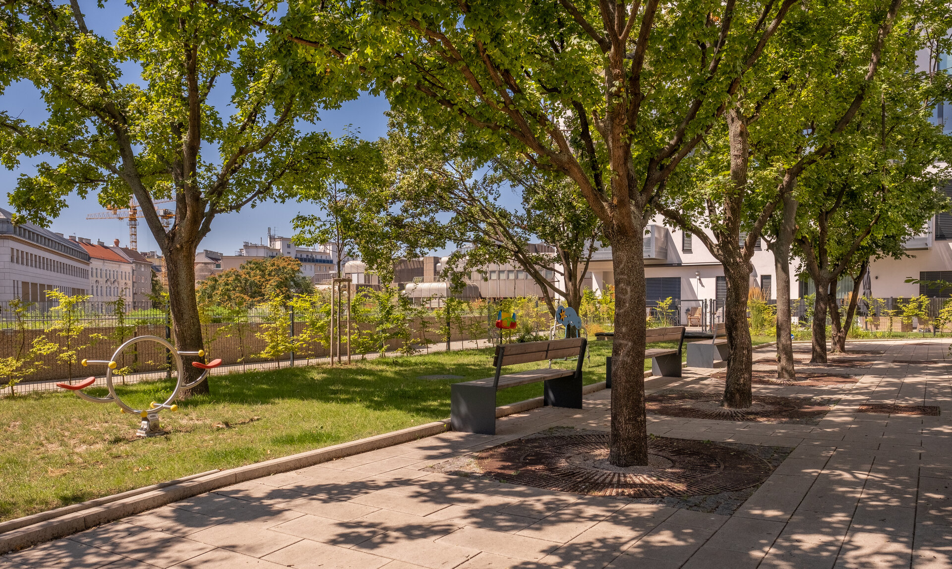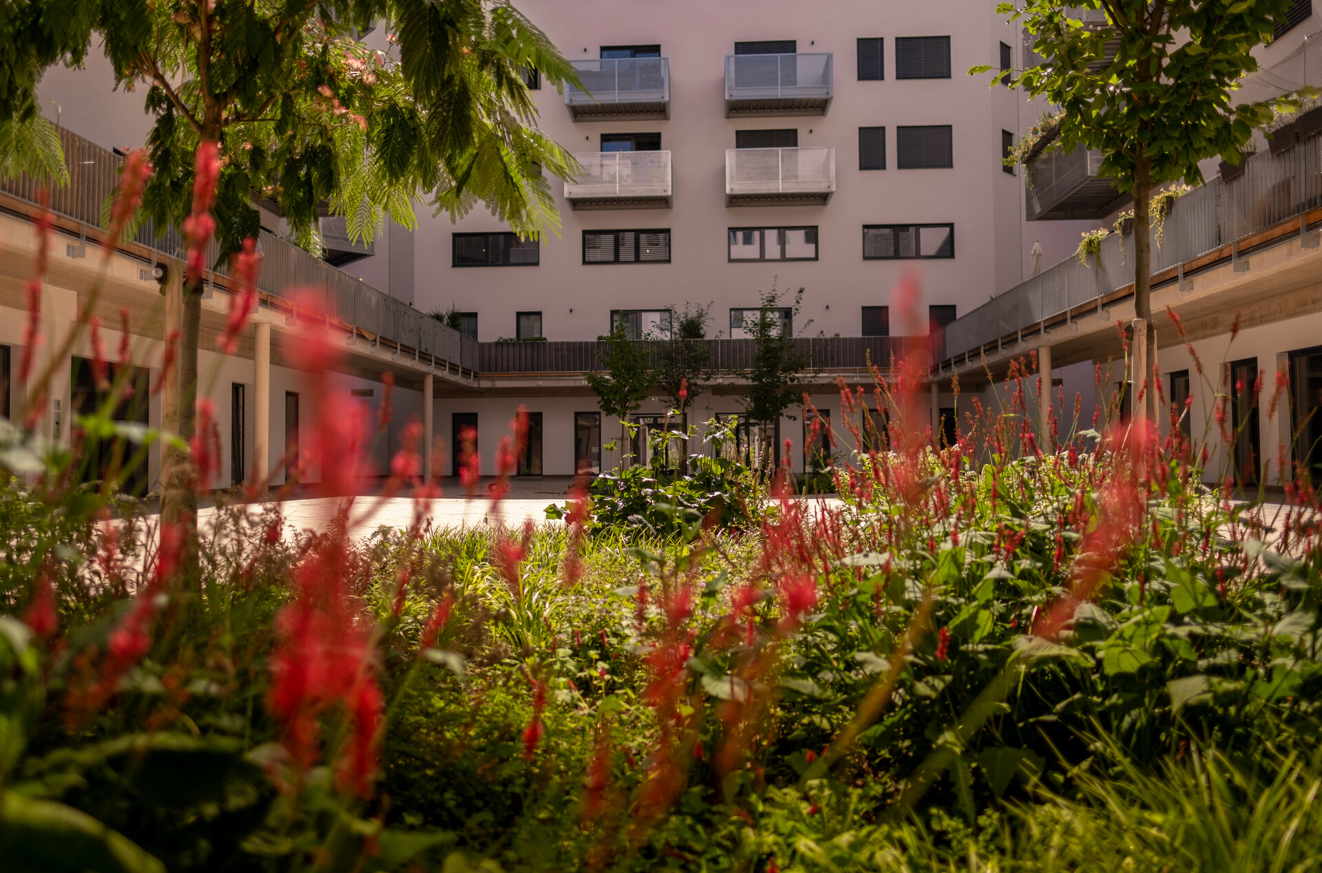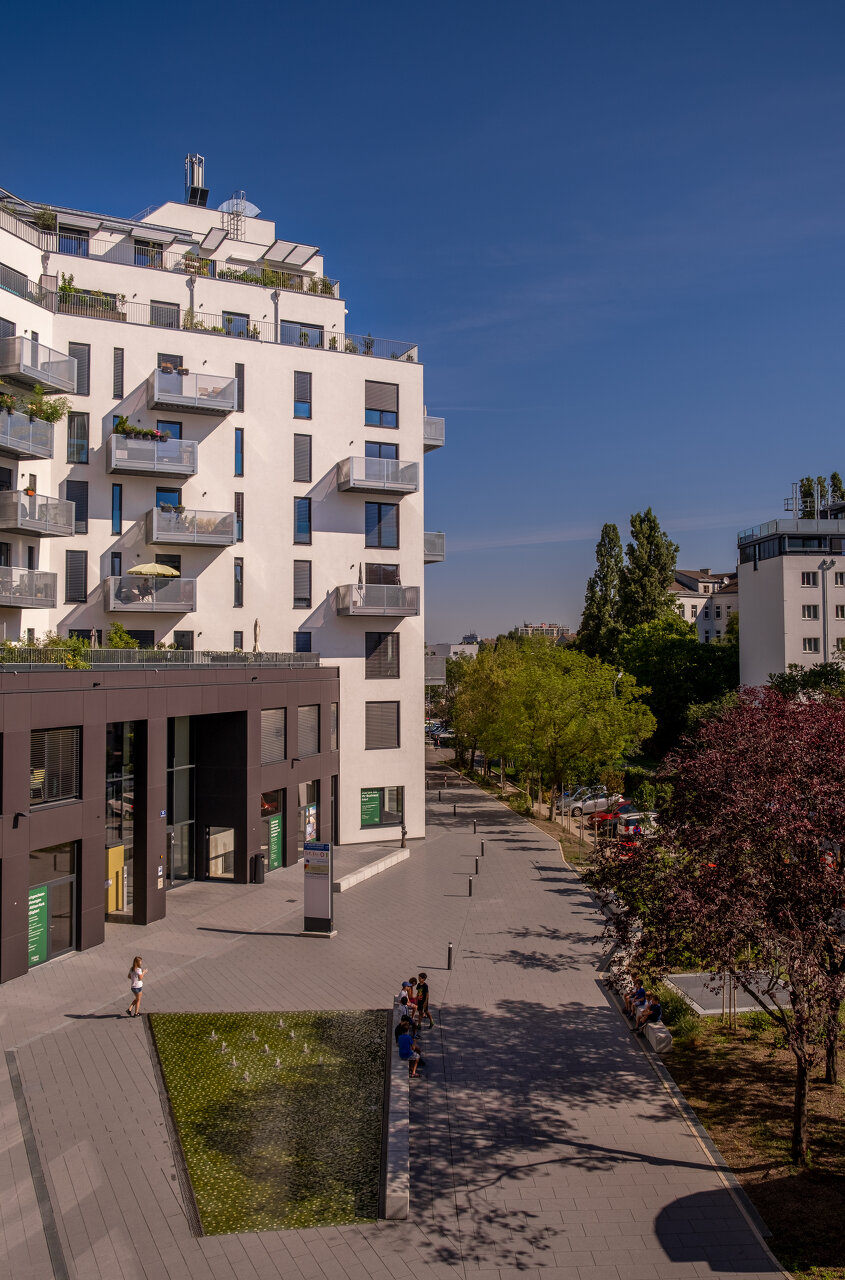 Ein Kindergarten mit Freiflächen wurde integriert. Erst ab dem 2. Geschoß wird das Gebäude für Wohnen genutzt. In der Mitte befindet sich ein großzügiger Innenhof, der mit Bäumen und vielfältigen Stauden neu bepflanzt wurde. Die innenliegenden Wohnungen profitieren von dieser ruhigen Oase. Die nach außen – zur Althanstraße – orientierten Wohnungen verfügen im 2. OG über Eigengärten, die durch außenliegende Hecken und Pflanzstreifen als Grünpüffer von den „öffentlichen“ Bereichen geschützt sind. (Text: Landschaftsarchitektin)