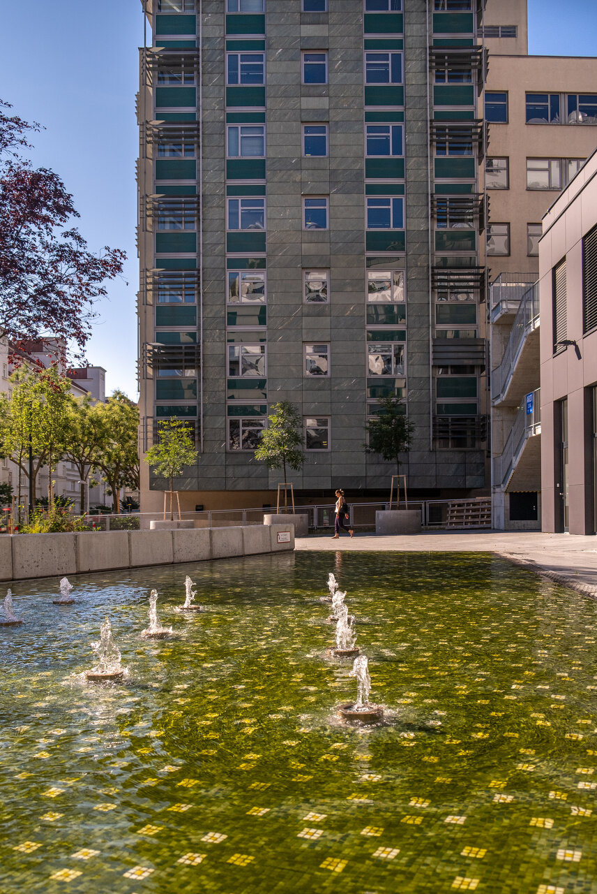 In der Erdgeschoßzone an der Nordbergstraße befinden sich Gewerbeflächen und das Hauptentrée zur Wohnhausanlage, die über einen großzügigen Vorplatz erschlossen sind. Dieser Platz ist mit einem hochwertigen Bodenbelag im Fischgrätmuster und mit einem Wasserbecken ausgestattet, das innenliegend mit einem dekorativen Bisazza-Mosaik verkleidet ist. Bänke dienen zum Aufenthalt, Treffen und Austausch zwischen Bewohner:innen. Ein umfassendes Baumkonzept mit über 40 Bäumen wurde in den verschiedenen Ebenen der Außenanlagen gepflanzt.