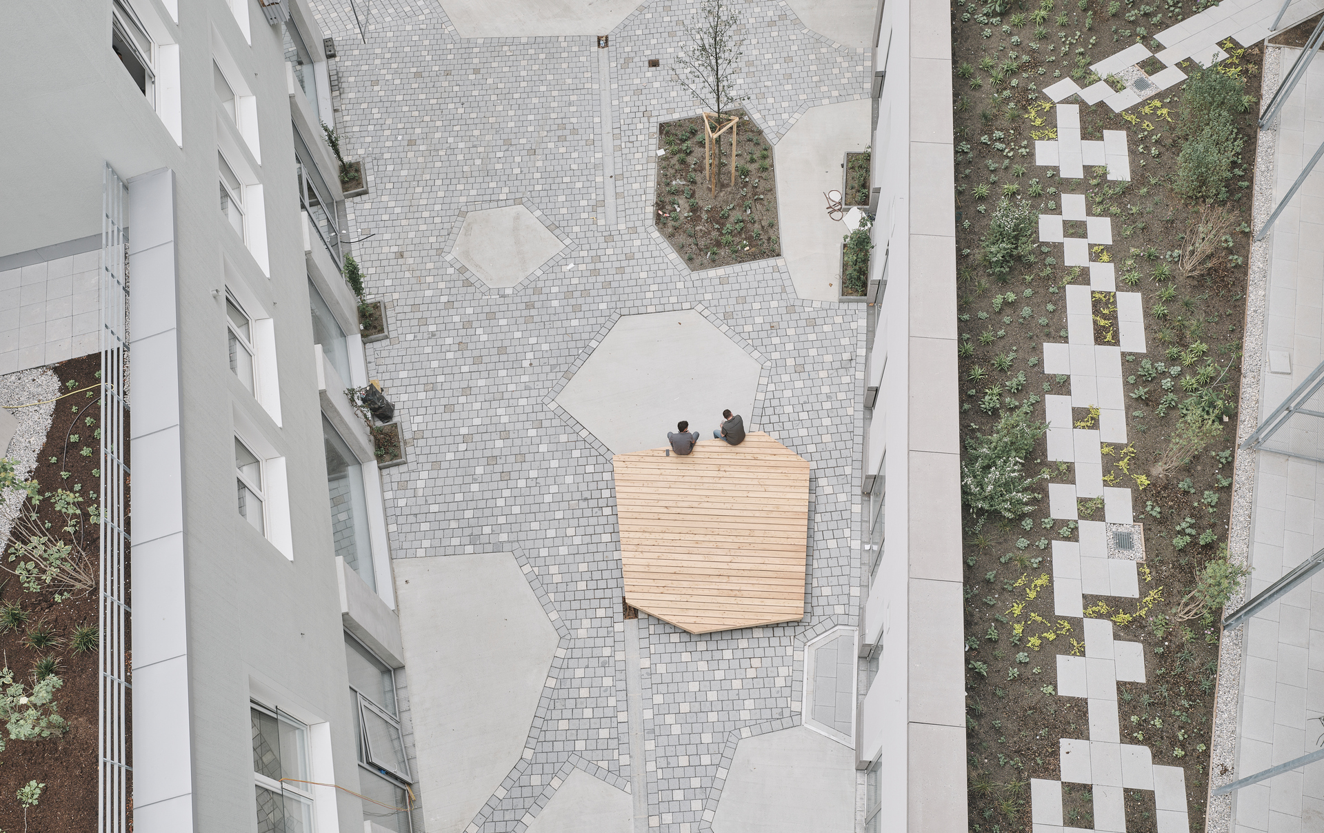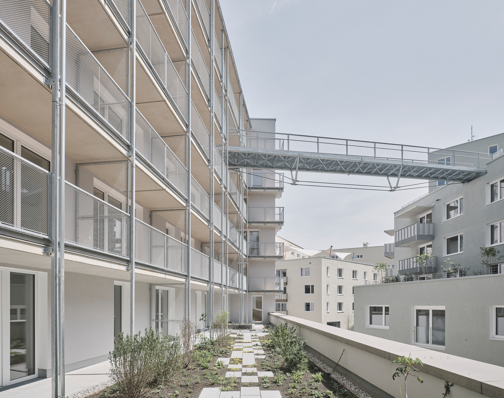 Den Wettbewerb für das erste Baufeld konnte 2017 Bogenfeld Architektur mit einem Projekt gewinnen, das ausgehend von der Lebensqualität, die sich etwa in italienischen Altstädten bietet, auf der Grundidee eines Freiluftwohnzimmers beruht. Zwischen vier verschieden hohen Baukörpern unterschiedlichsten Zuschnitts schaffen sie eine Abfolge von Gassen, Plätzen und Gärten für ein lebendiges Miteinander. Die an diesen gemeinsam genutzten Außenraum angeschlossenen Sockelzonen enthalten vorwiegend öffentliche, soziale und nahversorgende Funktionen wie etwa eine Kinderkrippe, ein Stadtteilbüro oder mehrere Gewerbeeinheiten. In den Obergeschoßen liegen Wohnungen unterschiedlichster Größen und Typologien, die auf die verschiedenen Ansprüche und Wünsche einer vielfältigen Gesellschaft reagieren. Neben den bewusst kommunikationsfördernden Erschließungsbereichen gibt es auf den Dächern gemeinsame Gärten, die u. a. durch eine Gehbrücke miteinander verbunden sind.