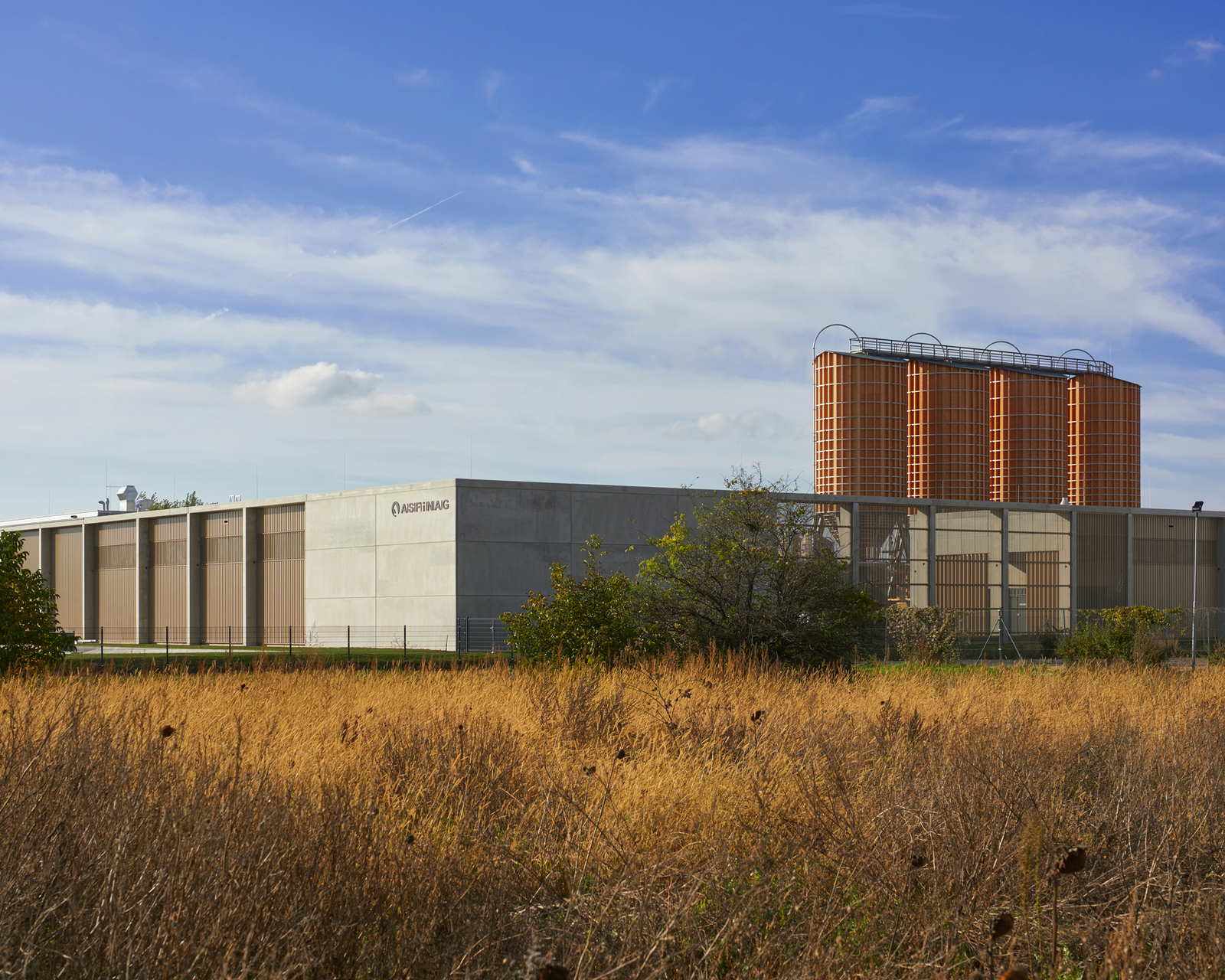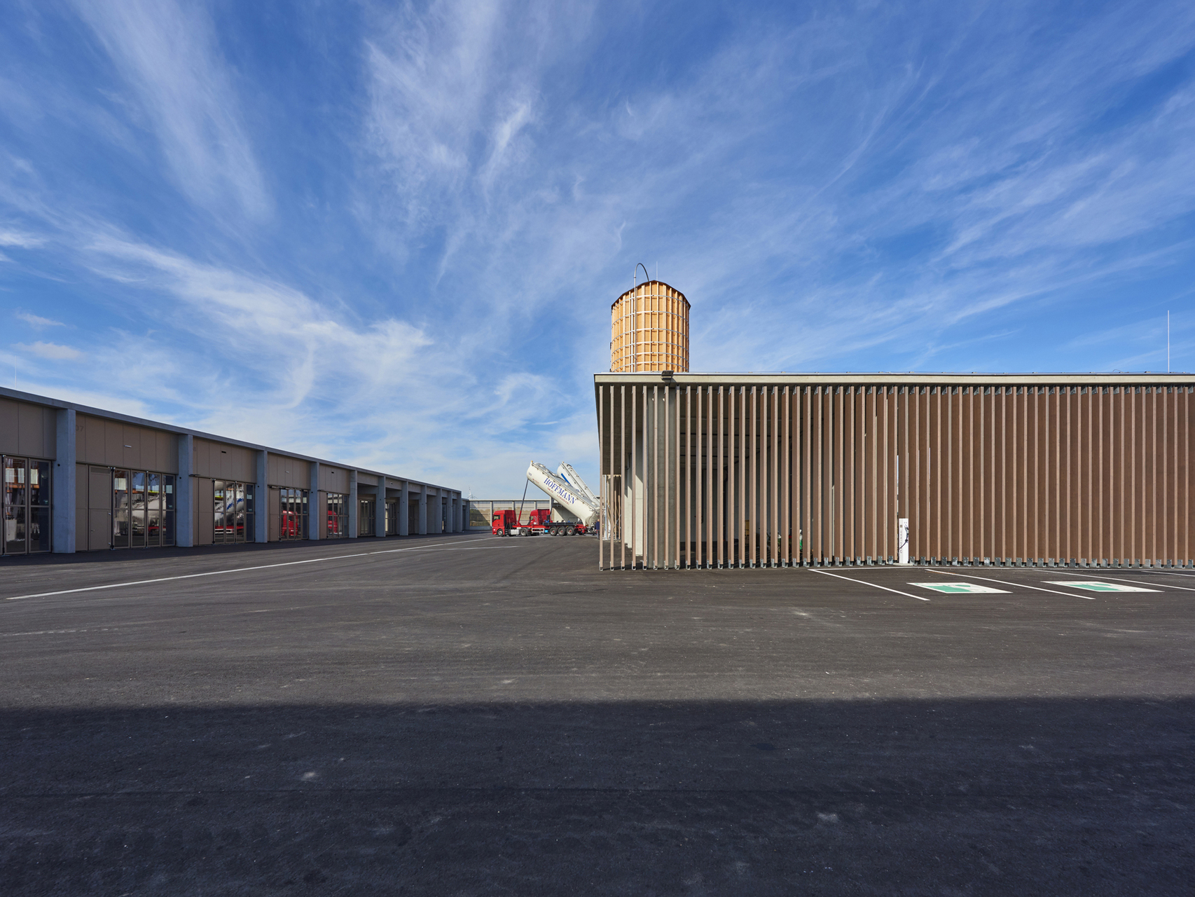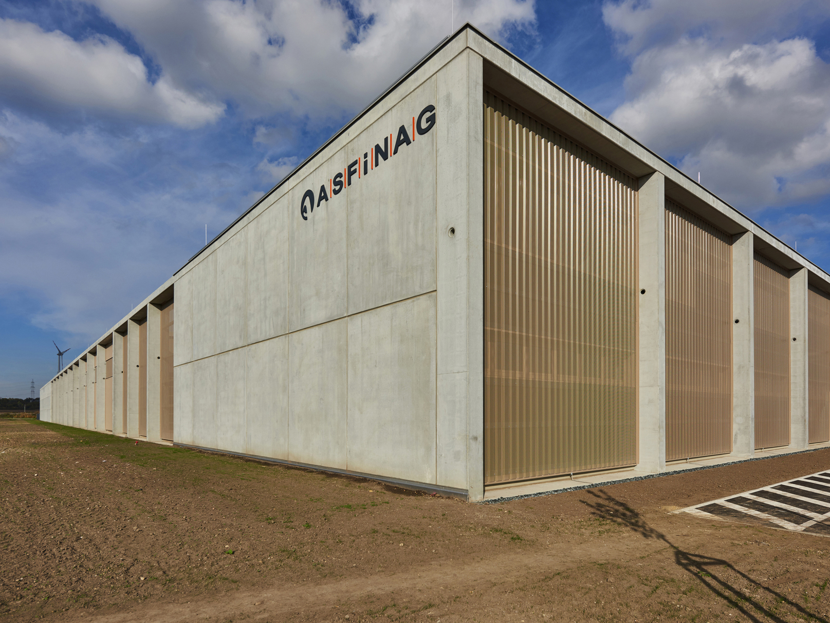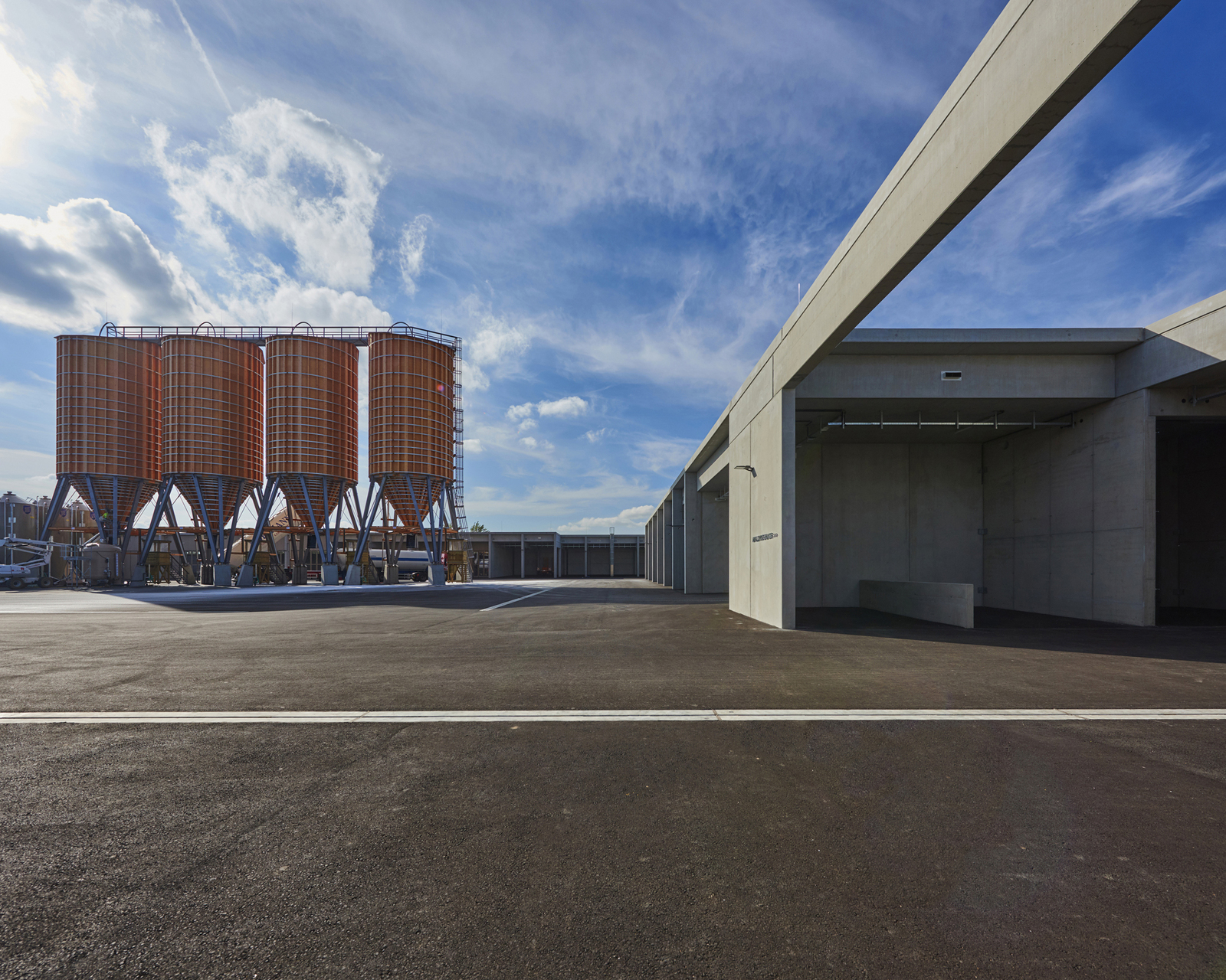 Der Untergrund wurde mit einer Kalk-Stabilisation verbessert. Streifenfundamente und B7 Stahlbeton-Oberflächen mit Besenstrich bilden die Fundierung und den Hallenboden. Die Anlage ist mit Stahlbetonfertigteilen und Sichtbetonoberflächen als Skelett- und Scheibenbau mit massiven Elementdecken ausgeführt. Die Hallen sind größtenteils mit Blechfassaden in Industriequalität mit Stahlunterkonstruktion gebaut, der Bürotrakt ist ebenfalls mit den perforierten Blechfassaden der Hallen in das gesamte Erscheinungsbild eingefügt. Die hellen Betonfassaden dieses Industriebaus - die Fertigteilstützen, Hohlwände, Attikaträger und Ortbetonflächen, die jeweils verschieden hergestellt wurden - bekamen eine einheitliche Materialität. (Text: Architekt, bearbeitet)
