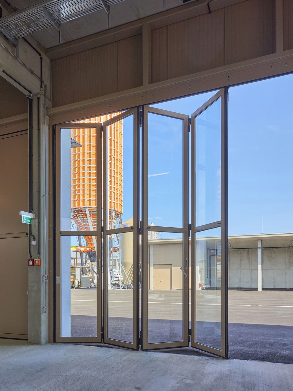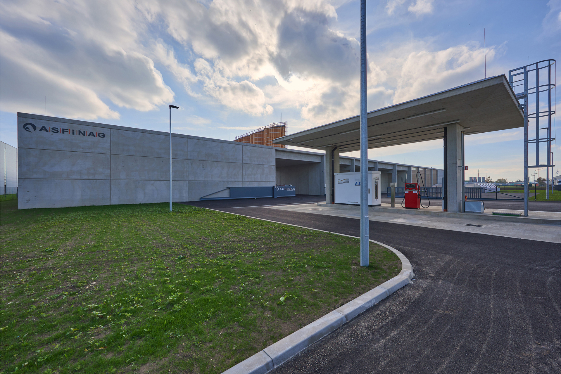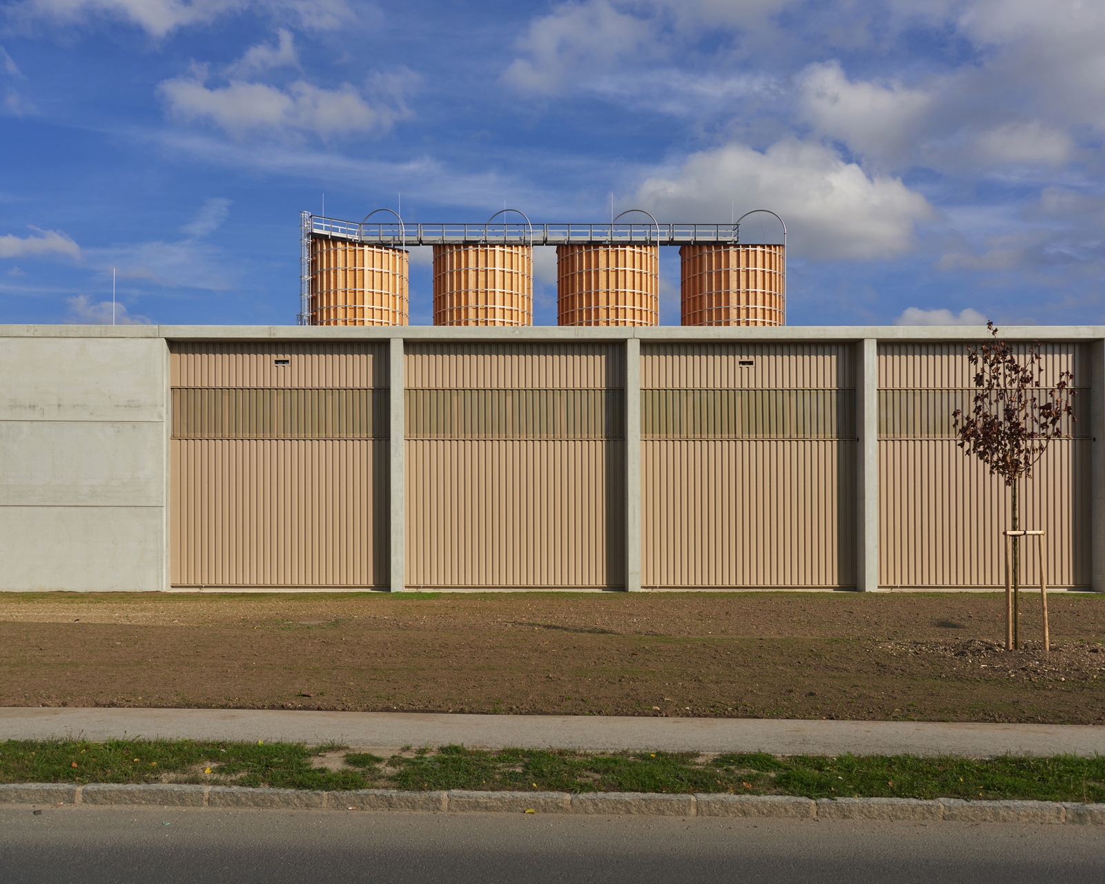 Der Untergrund wurde mit einer Kalk-Stabilisation verbessert. Streifenfundamente und B7 Stahlbeton-Oberflächen mit Besenstrich bilden die Fundierung und den Hallenboden. Die Anlage ist mit Stahlbetonfertigteilen und Sichtbetonoberflächen als Skelett- und Scheibenbau mit massiven Elementdecken ausgeführt. Die Hallen sind größtenteils mit Blechfassaden in Industriequalität mit Stahlunterkonstruktion gebaut, der Bürotrakt ist ebenfalls mit den perforierten Blechfassaden der Hallen in das gesamte Erscheinungsbild eingefügt. Die hellen Betonfassaden dieses Industriebaus - die Fertigteilstützen, Hohlwände, Attikaträger und Ortbetonflächen, die jeweils verschieden hergestellt wurden - bekamen eine einheitliche Materialität. (Text: Architekt, bearbeitet)